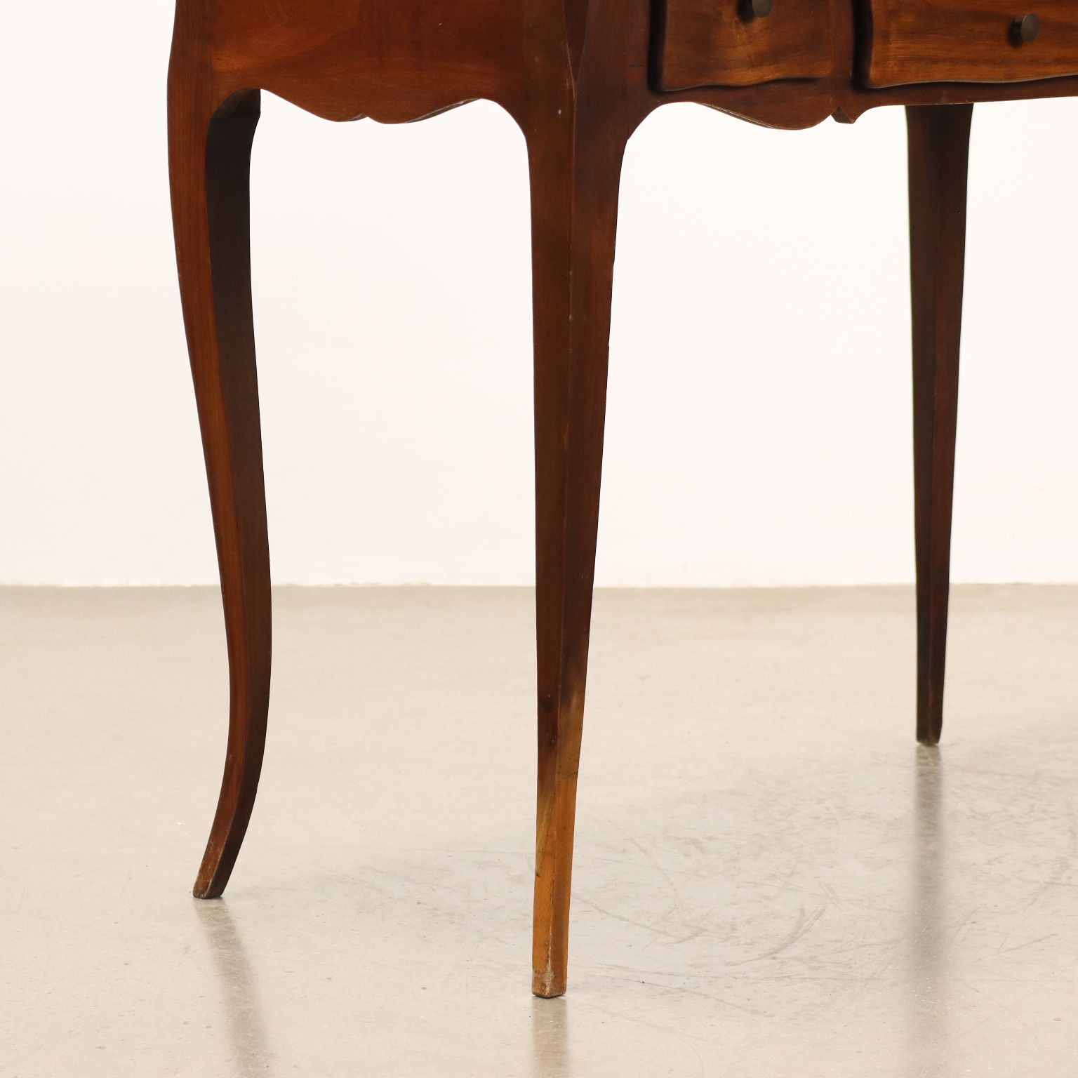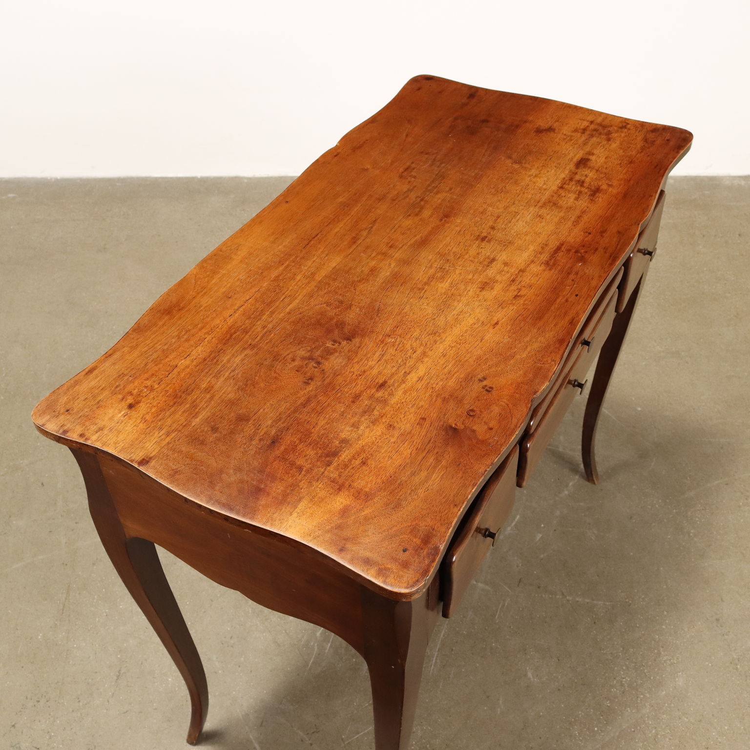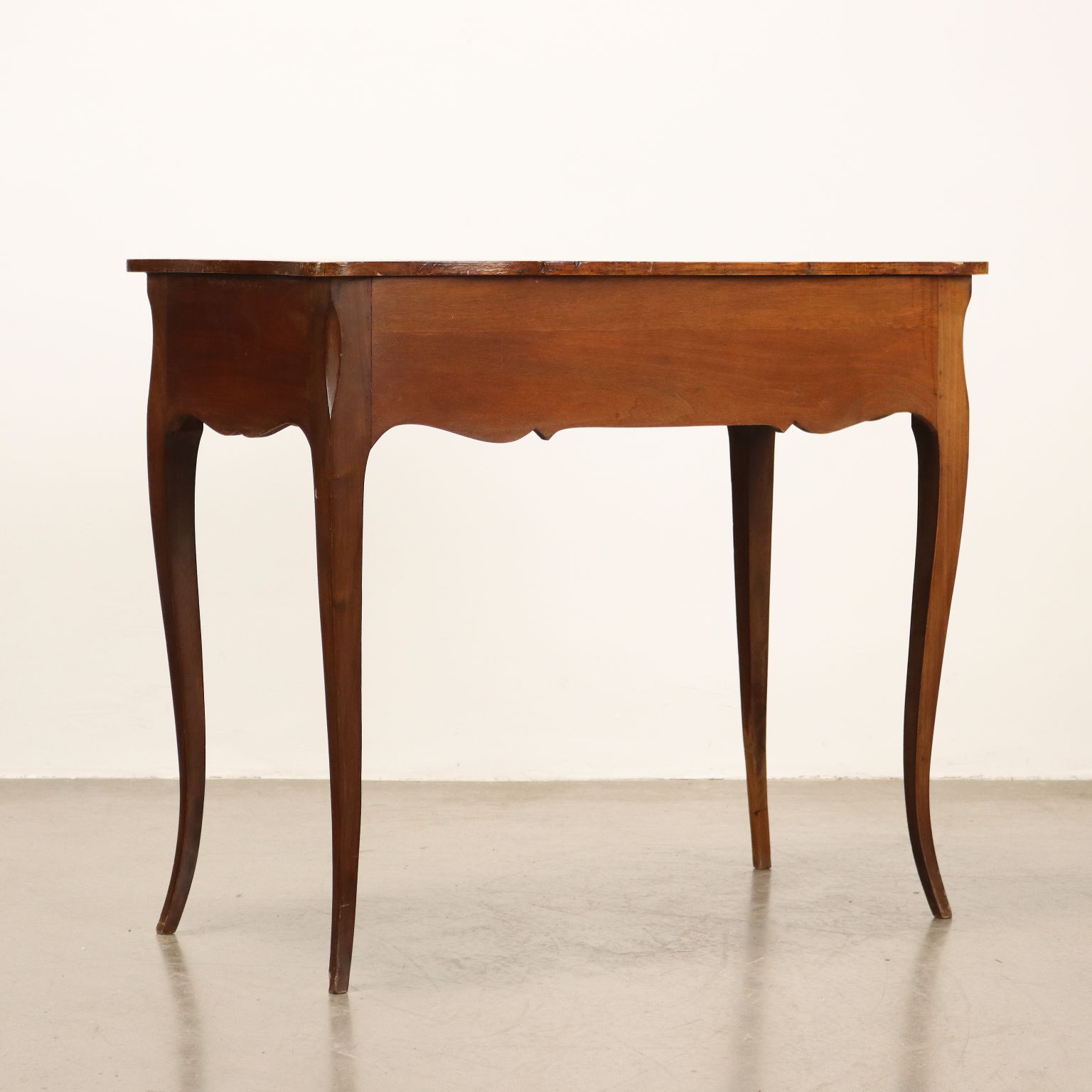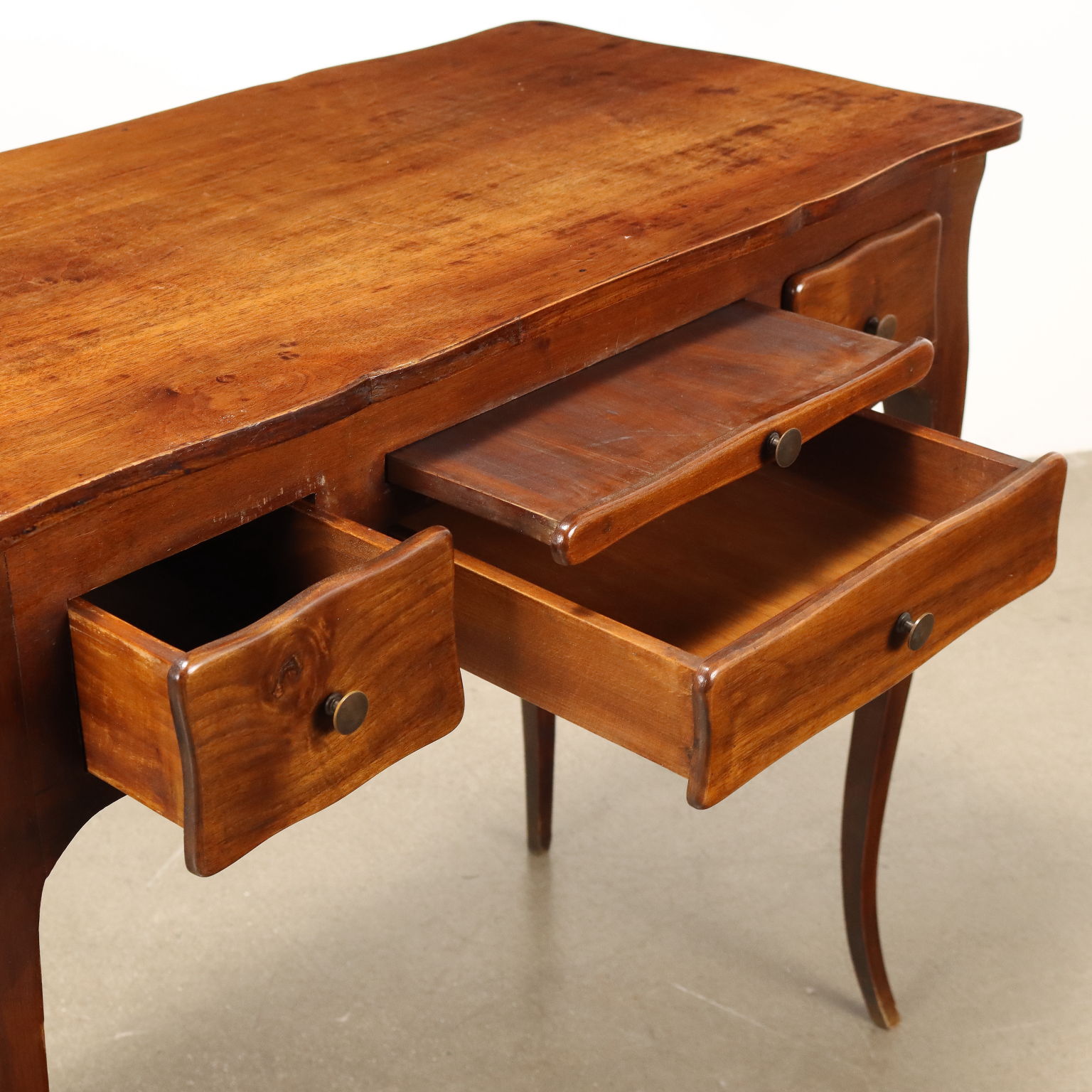 Scrittoietto in stile barocchetto in noce, tre cassetti e tiretto sotto piano, gambe mosse. Italia, XX Secolo.
