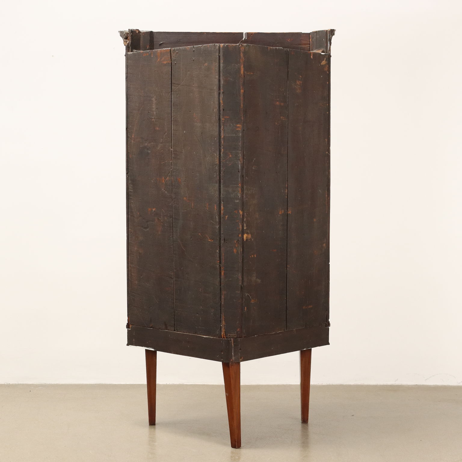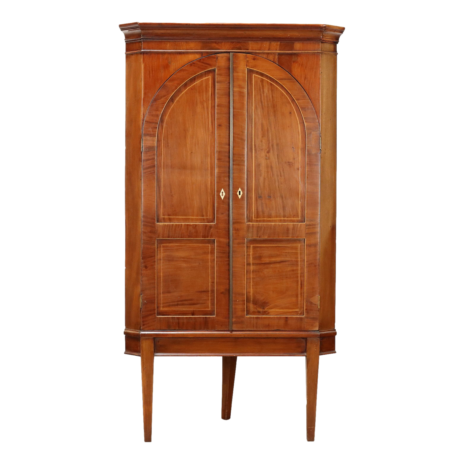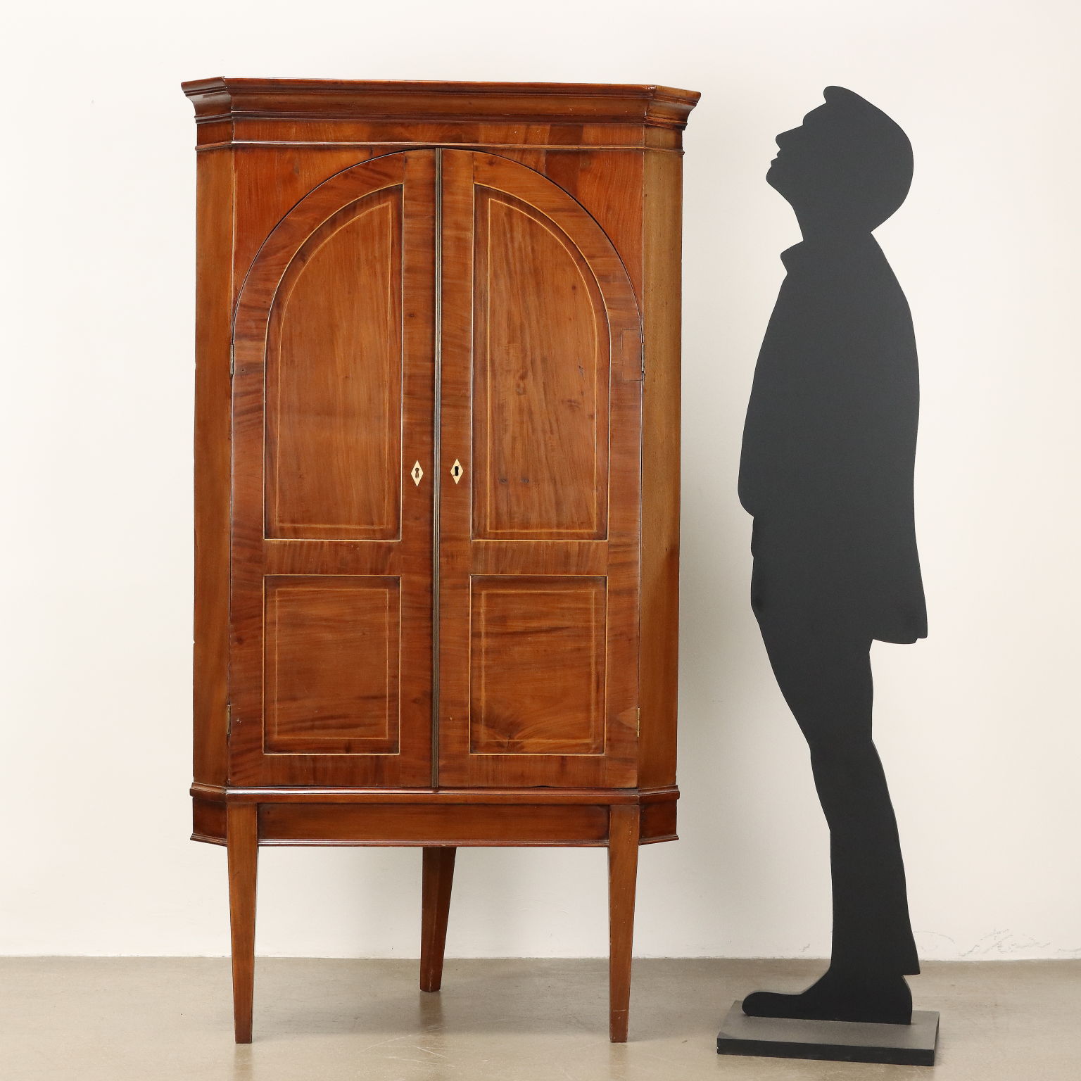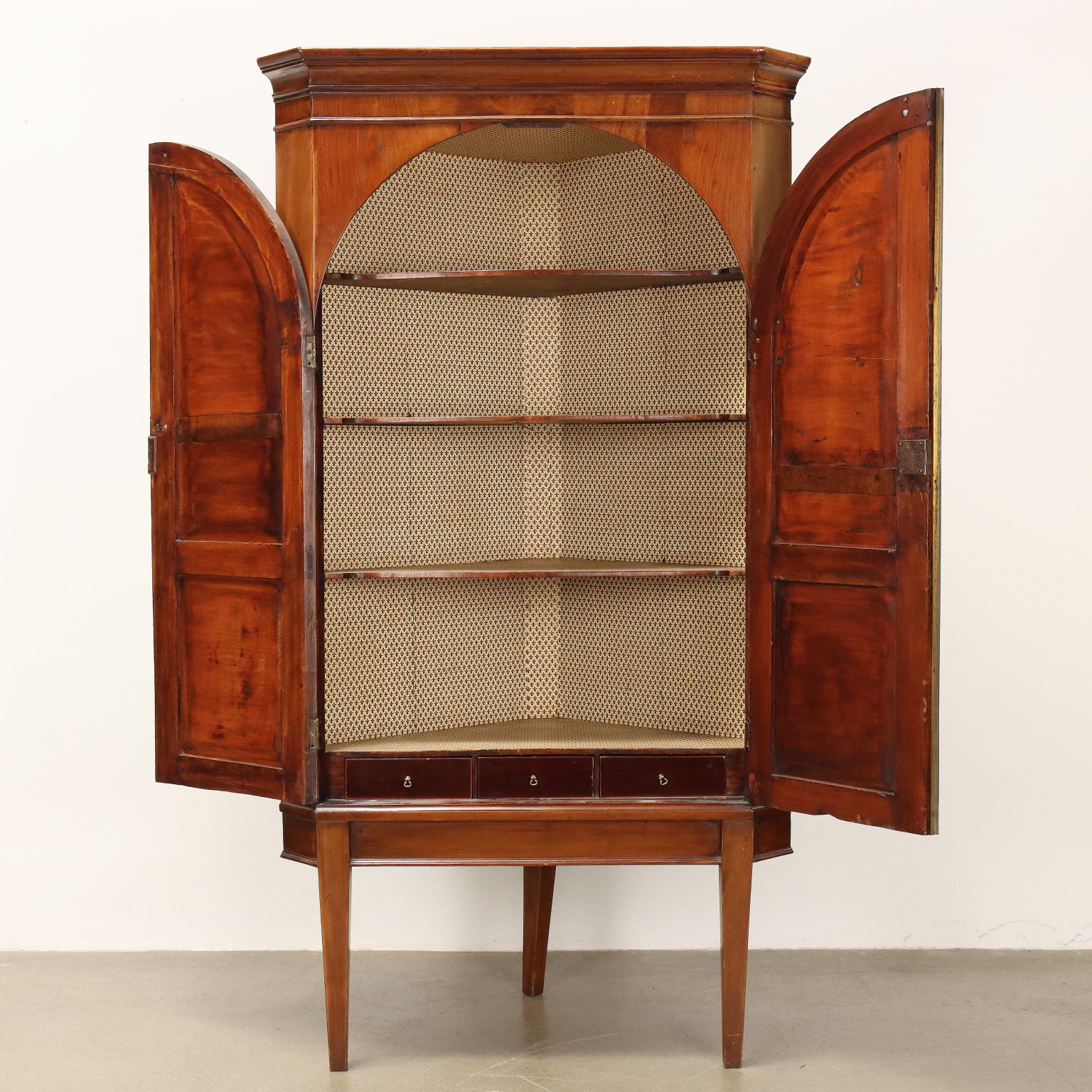 Angoliera Direttorio in mogano, ricavata da alzata di angoliera a due corpi. Fronte con coppia di ante ad arco, interno con tre ripiani e tre cassettini alla base. Filettature in acero, gambe tronco piramidali. Interni e schienale in abete. Restauri. Austria, inizio XIX Secolo.