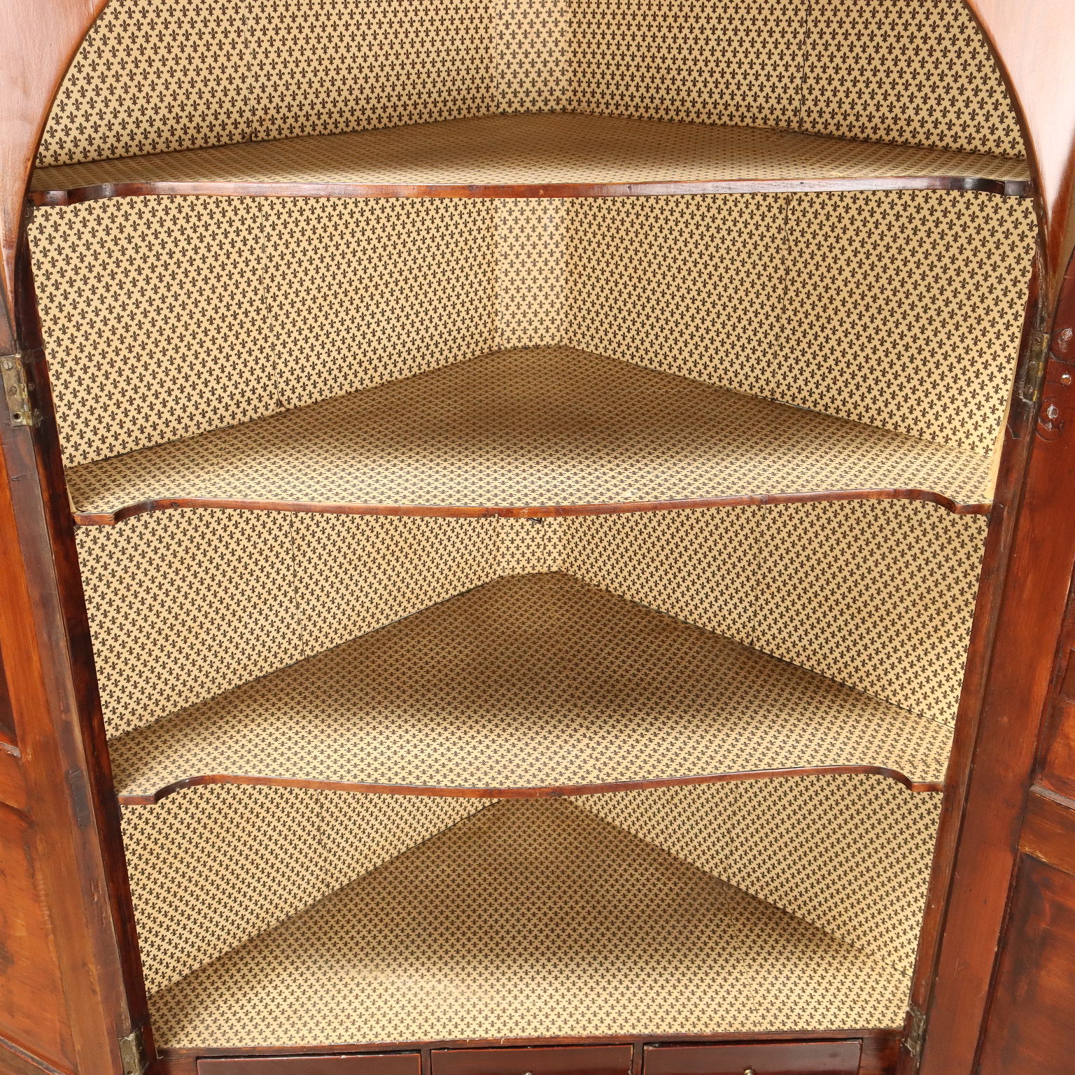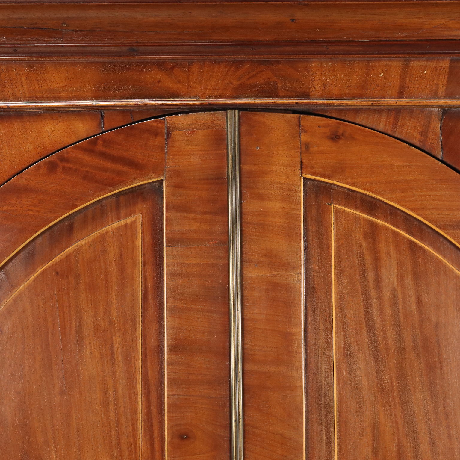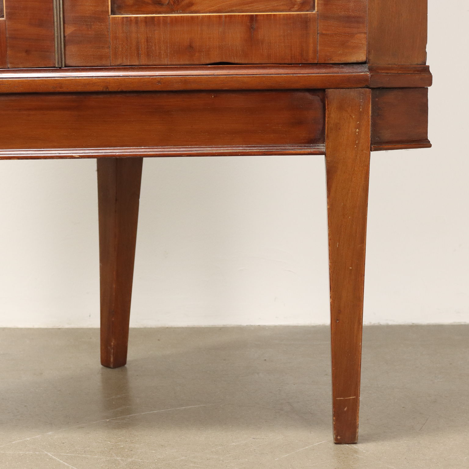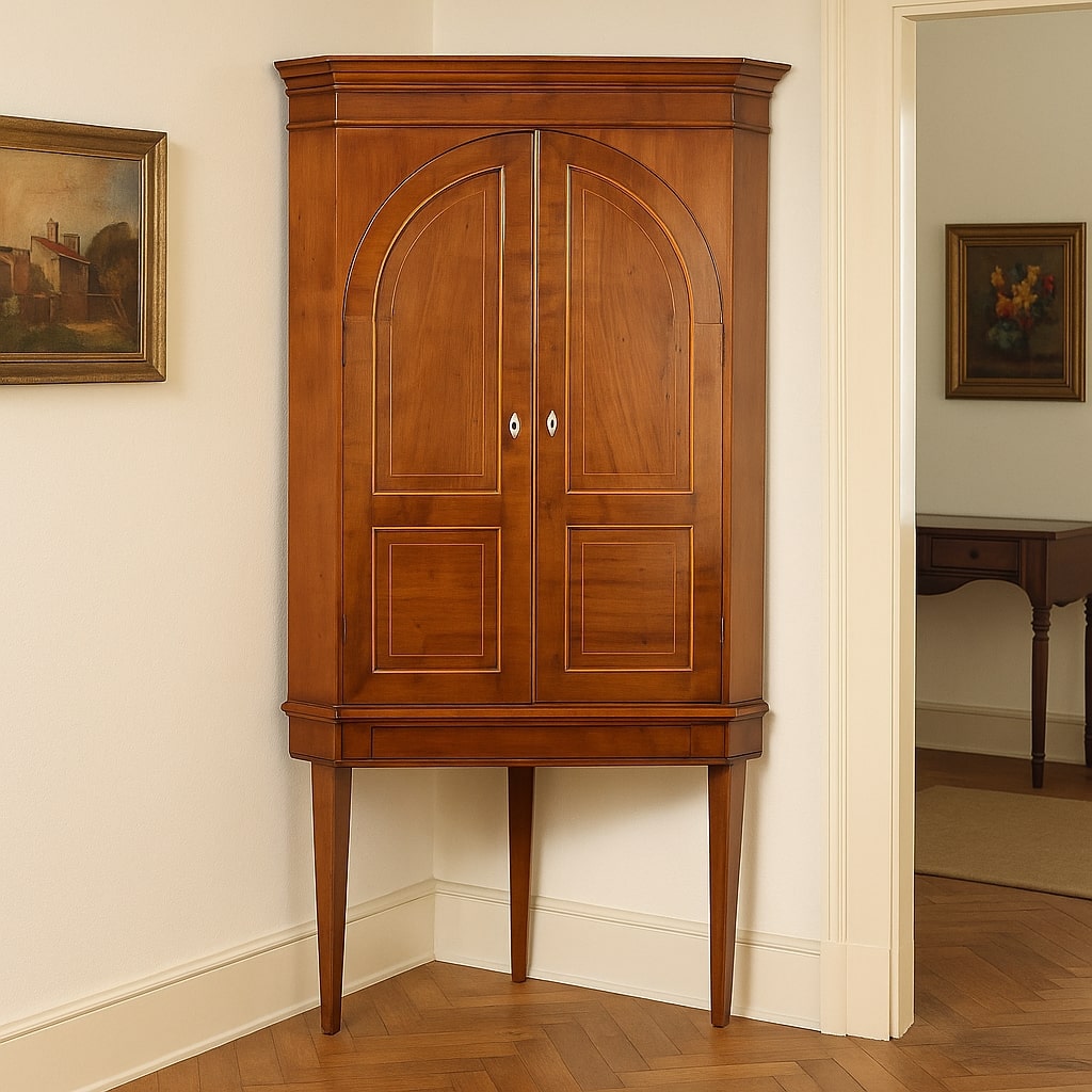 Angoliera Direttorio in mogano, ricavata da alzata di angoliera a due corpi. Fronte con coppia di ante ad arco, interno con tre ripiani e tre cassettini alla base. Filettature in acero, gambe tronco piramidali. Interni e schienale in abete. Restauri. Austria, inizio XIX Secolo.