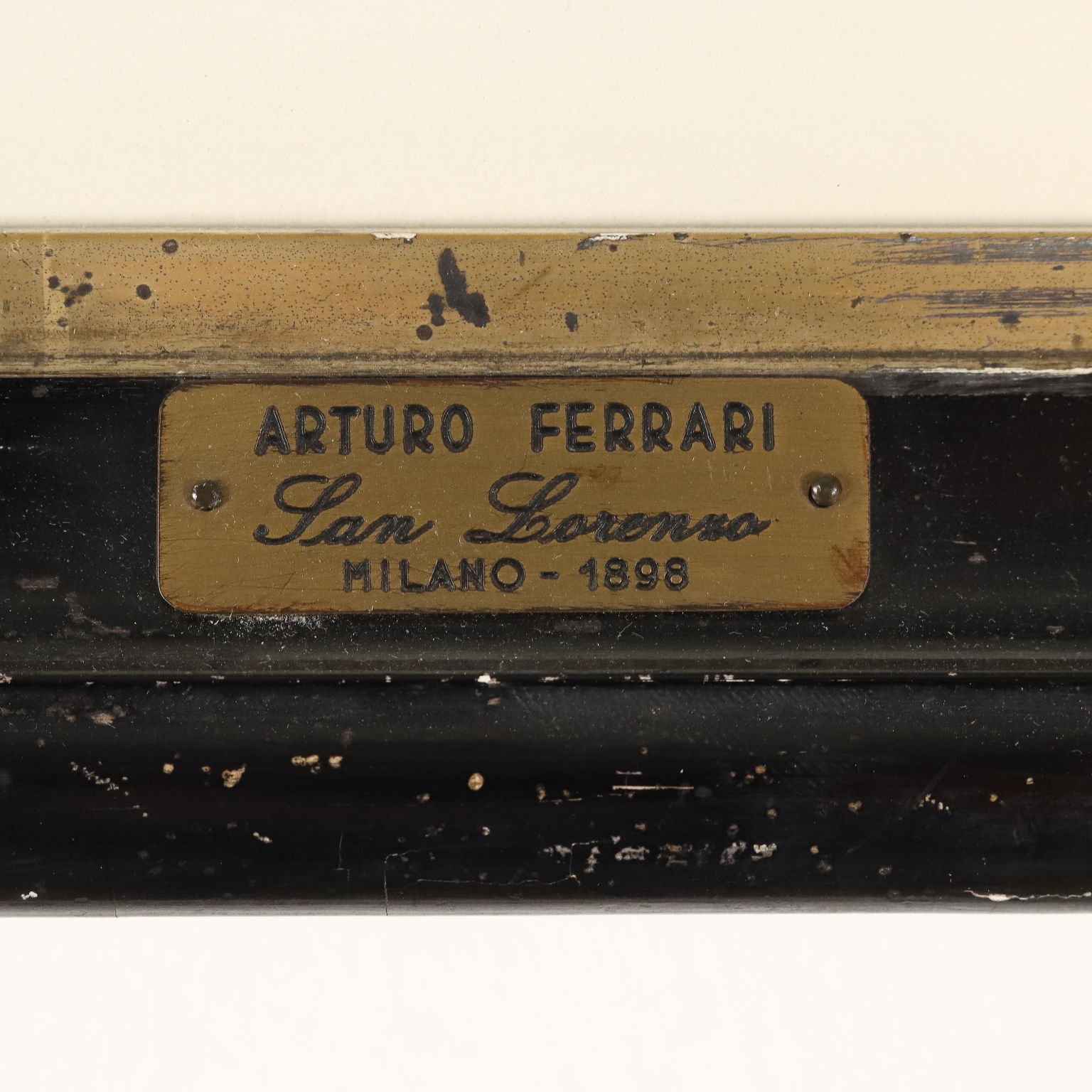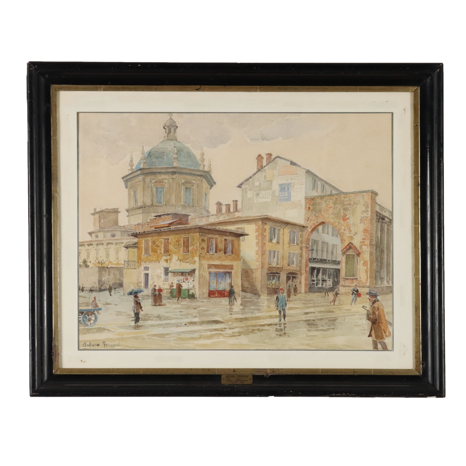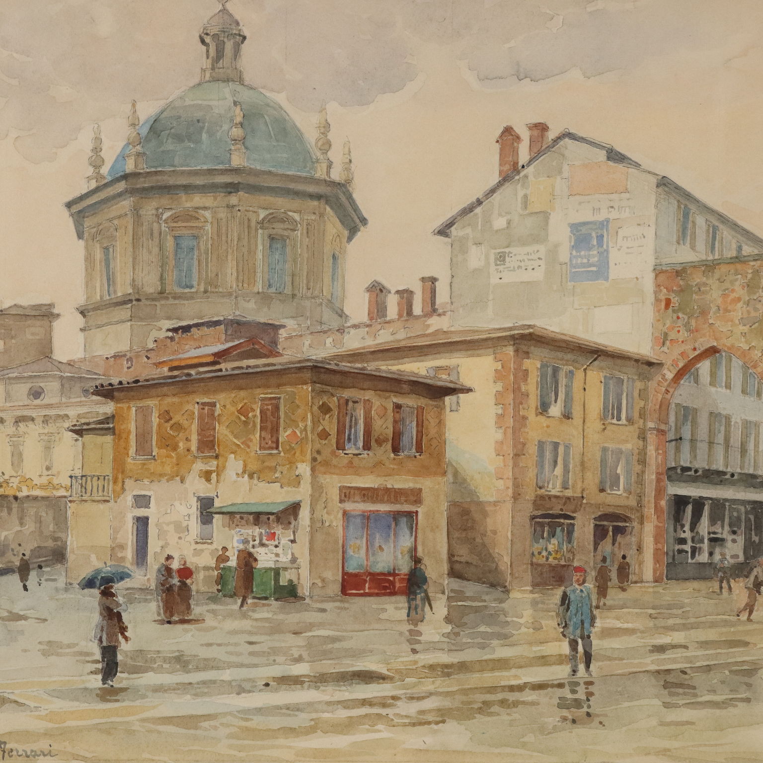 Acquarello su carta. Firmato in basso a sinistra. Etichetta in metallo sulla cornice con il titolo e la data dell' opera. Arturo Ferrari fu un pittore milanese che fece delle vedute prospettiche milanesi il soggetto ricorrente all'interno della sua vasta produzione di oli e acquerelli. In breve tempo divenne l'artefice di una rievocazione poetica e sentimentale della vecchia Milano che nel passaggio verso il Novecento, complice una radicale ristrutturazione edilizia, andava assumendo un nuovo volto. Questo scorcio di Milano propone un particolare di Piazza Vetra con il varco di accesso laterale alle Colonne di San Lorenzo e la cupola della Basilica omonima. L'opera è presentata in cornice in stile.