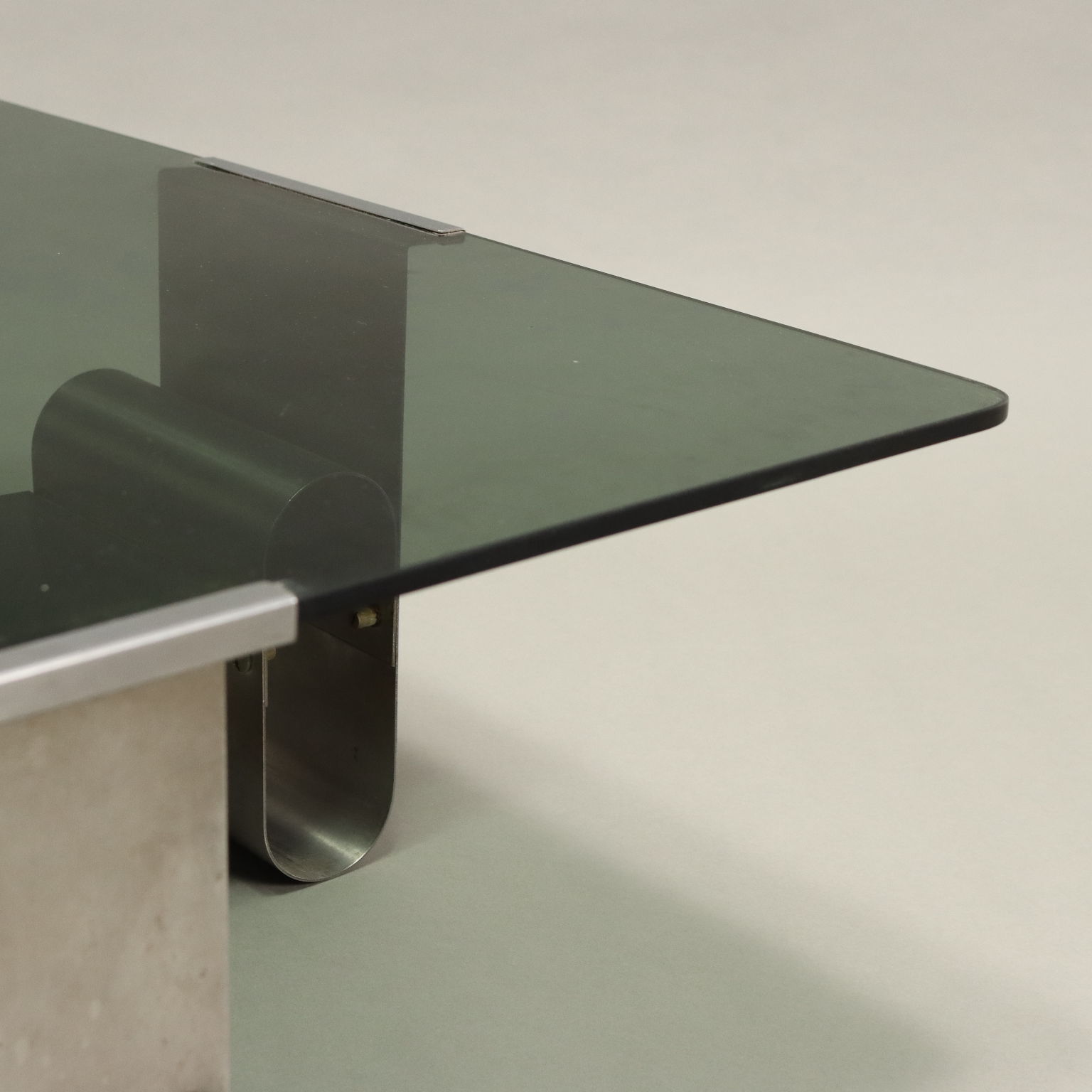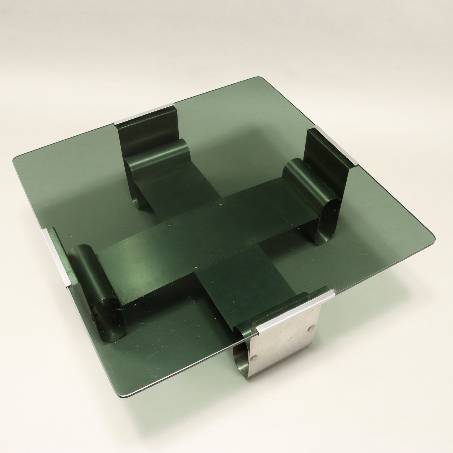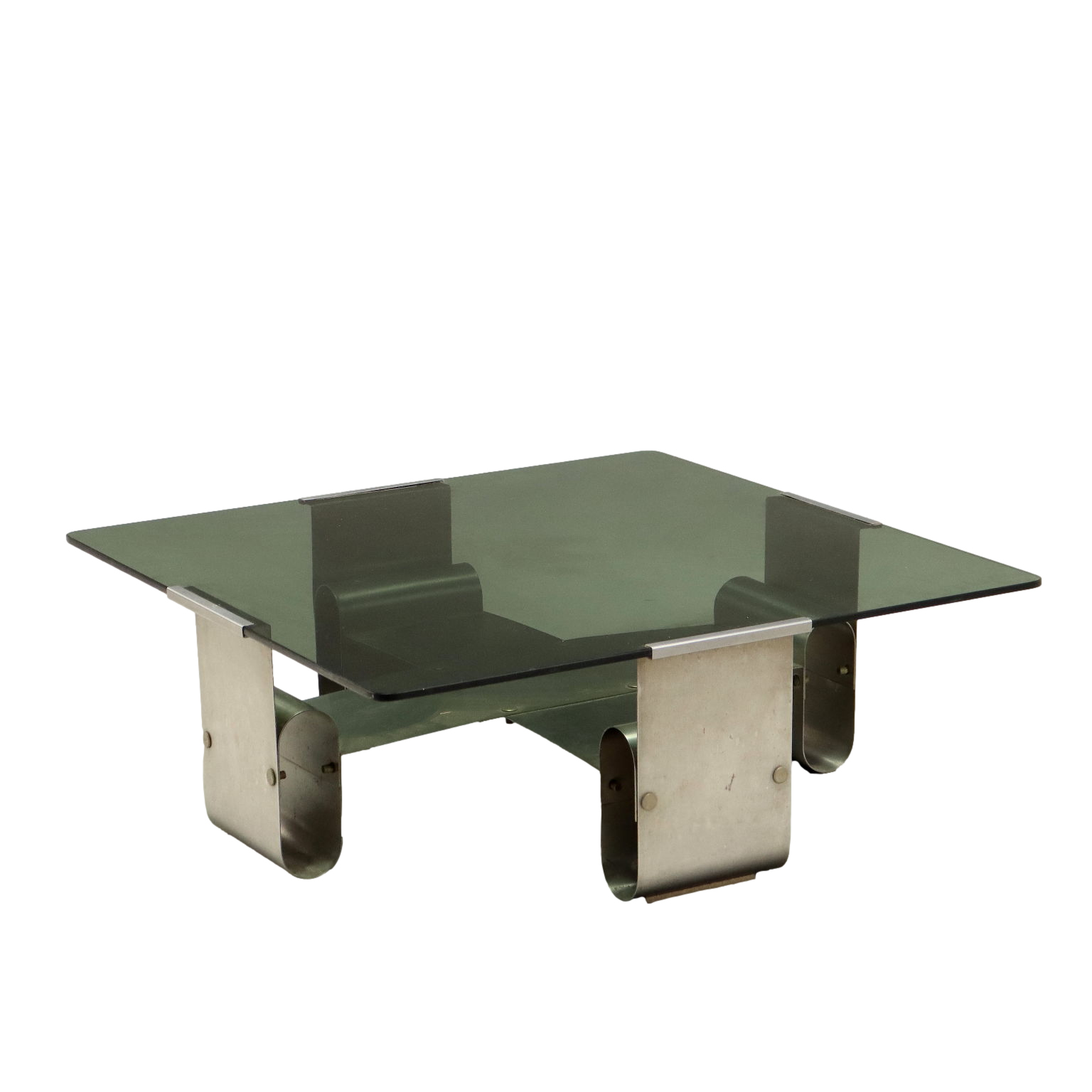 Tavolino vintage di manifattura italiana con piano quadrato in vetro fumè e base in acciaio.