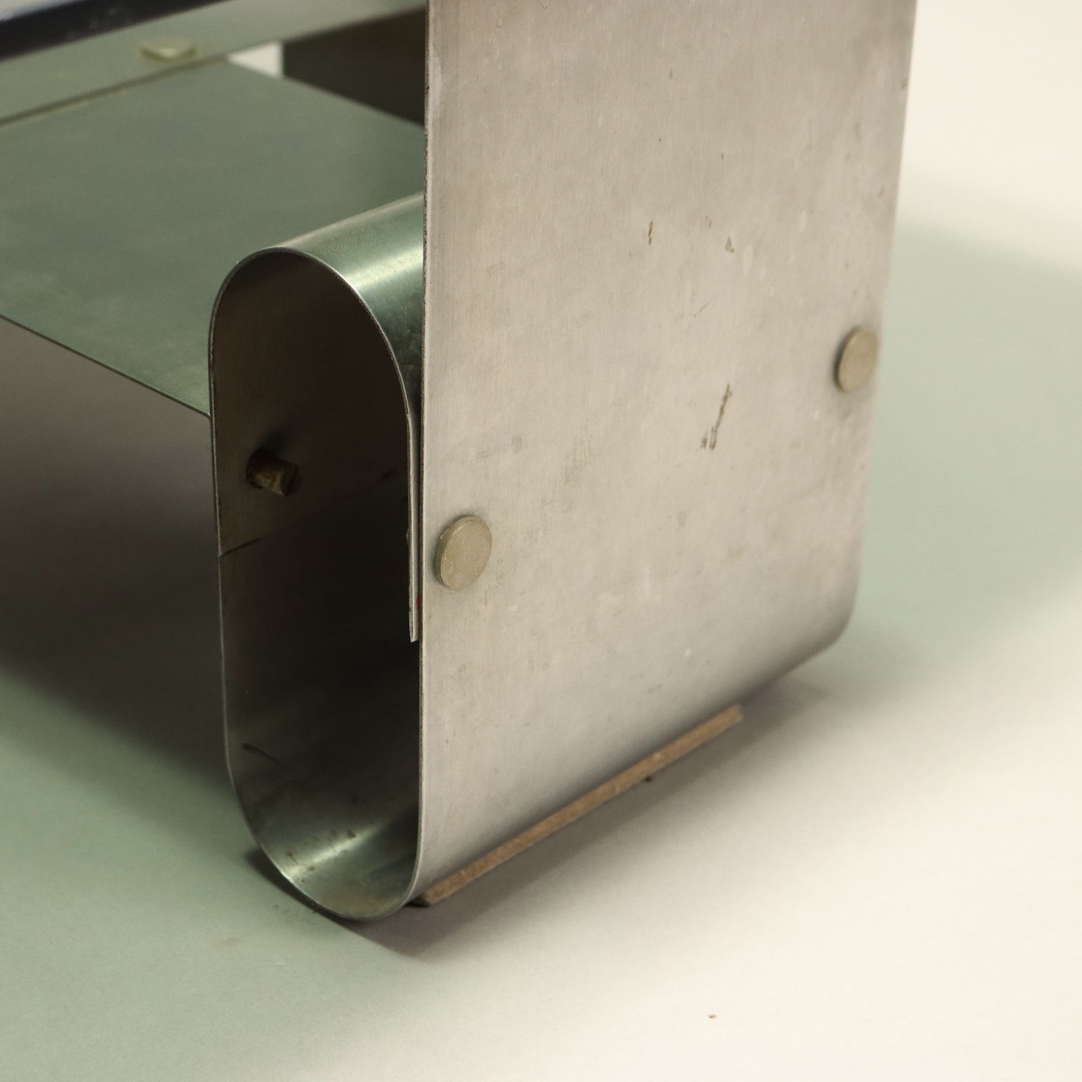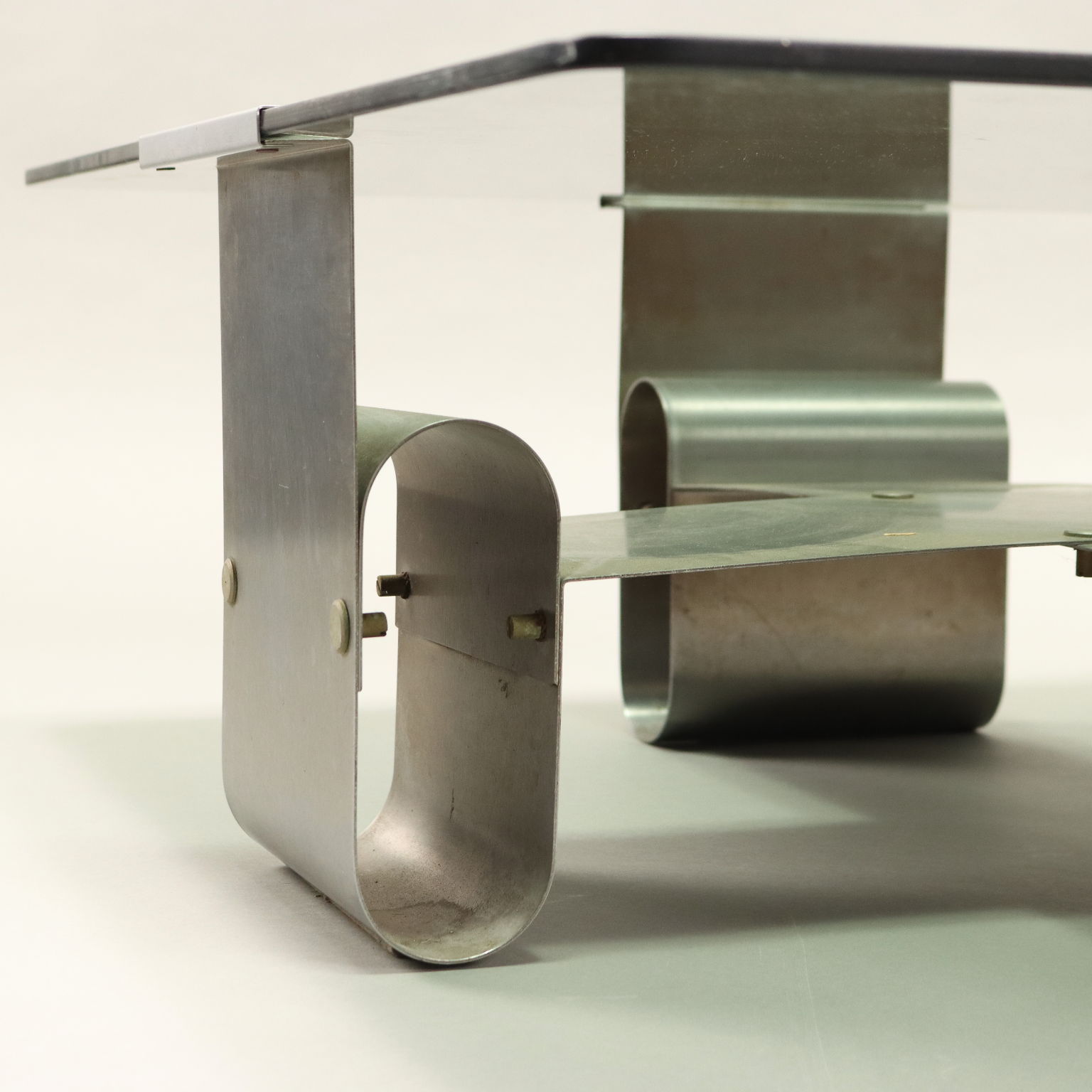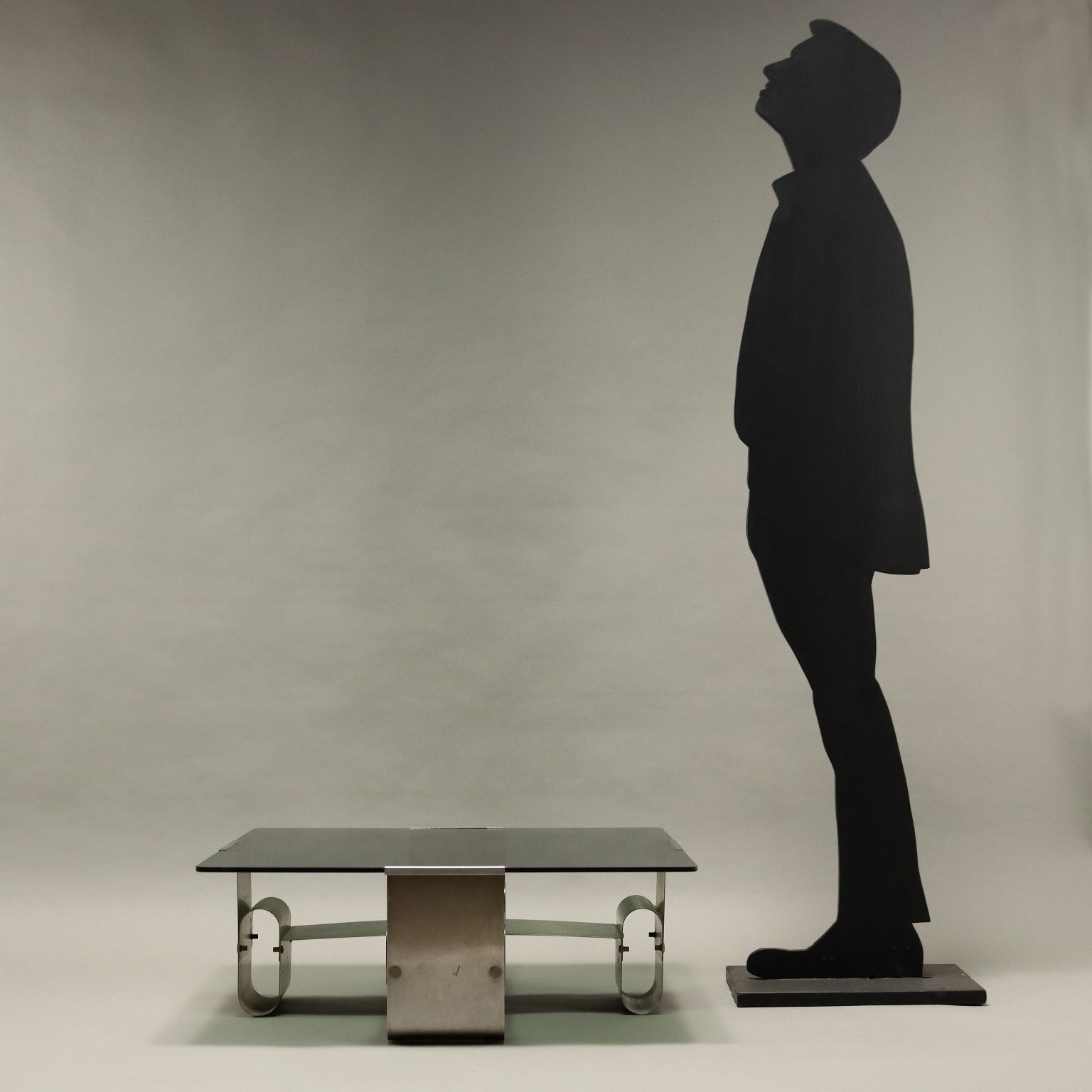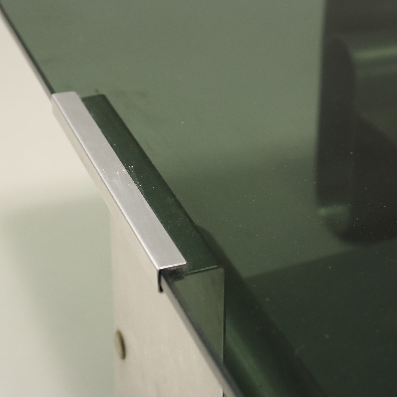 Tavolino vintage di manifattura italiana con piano quadrato in vetro fumè e base in acciaio.