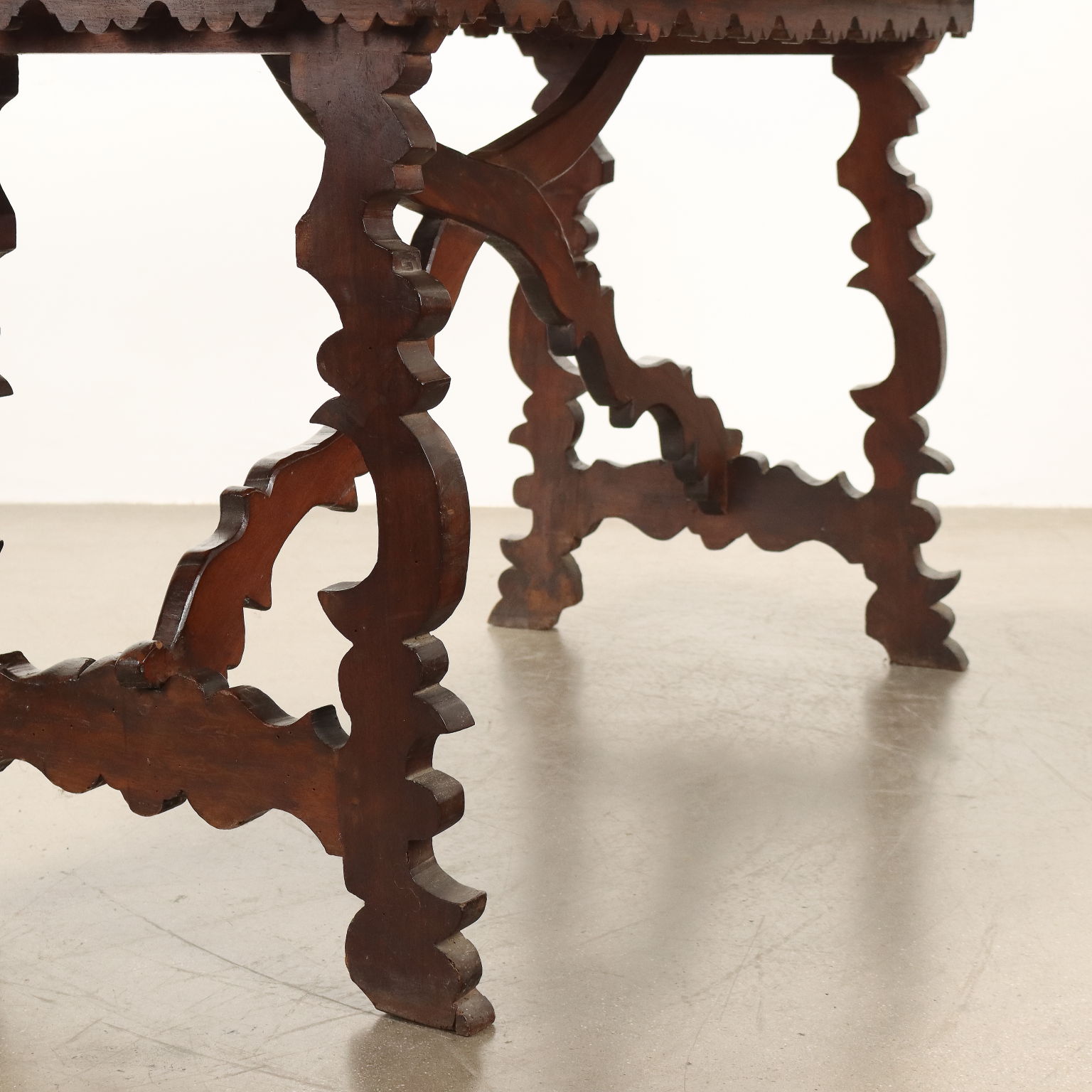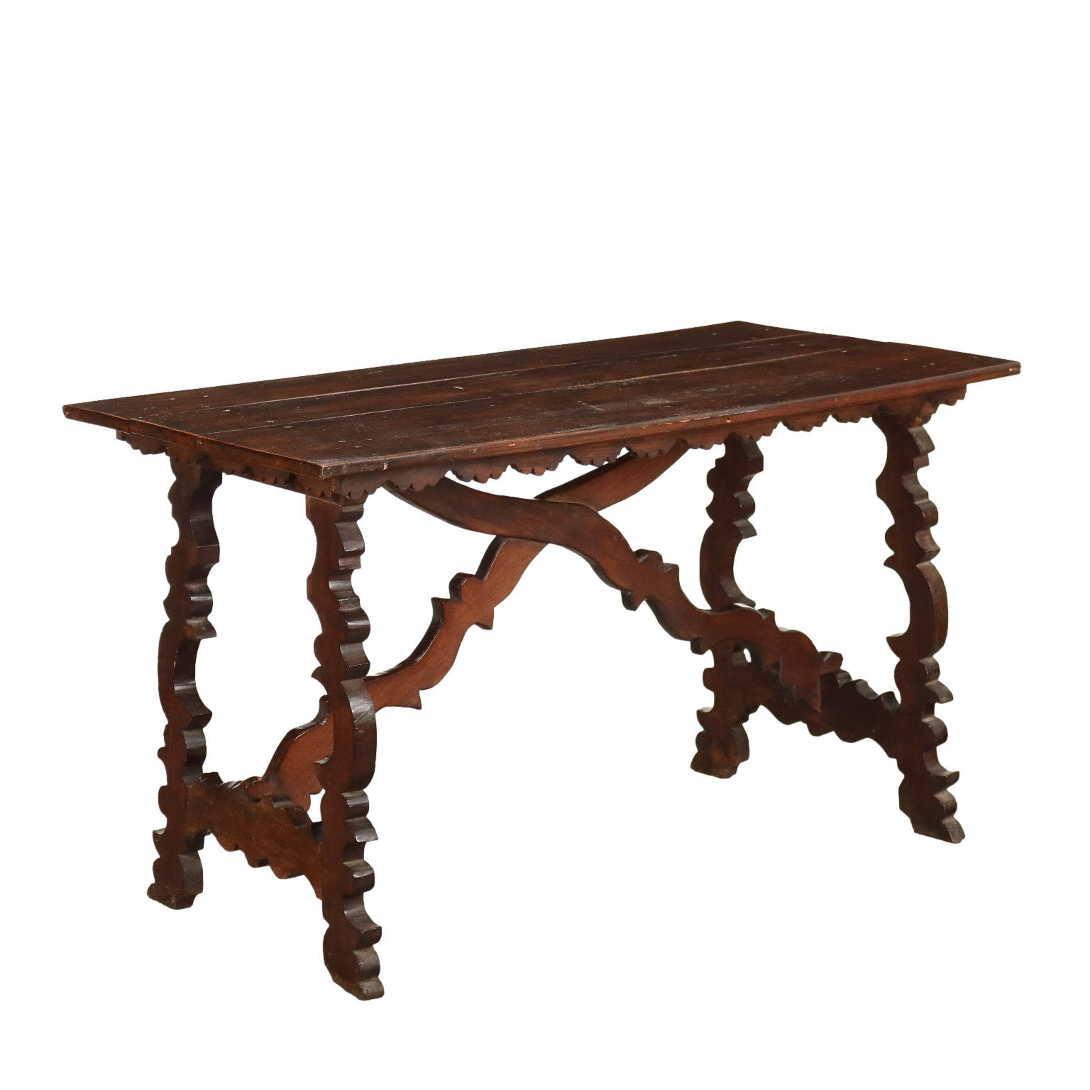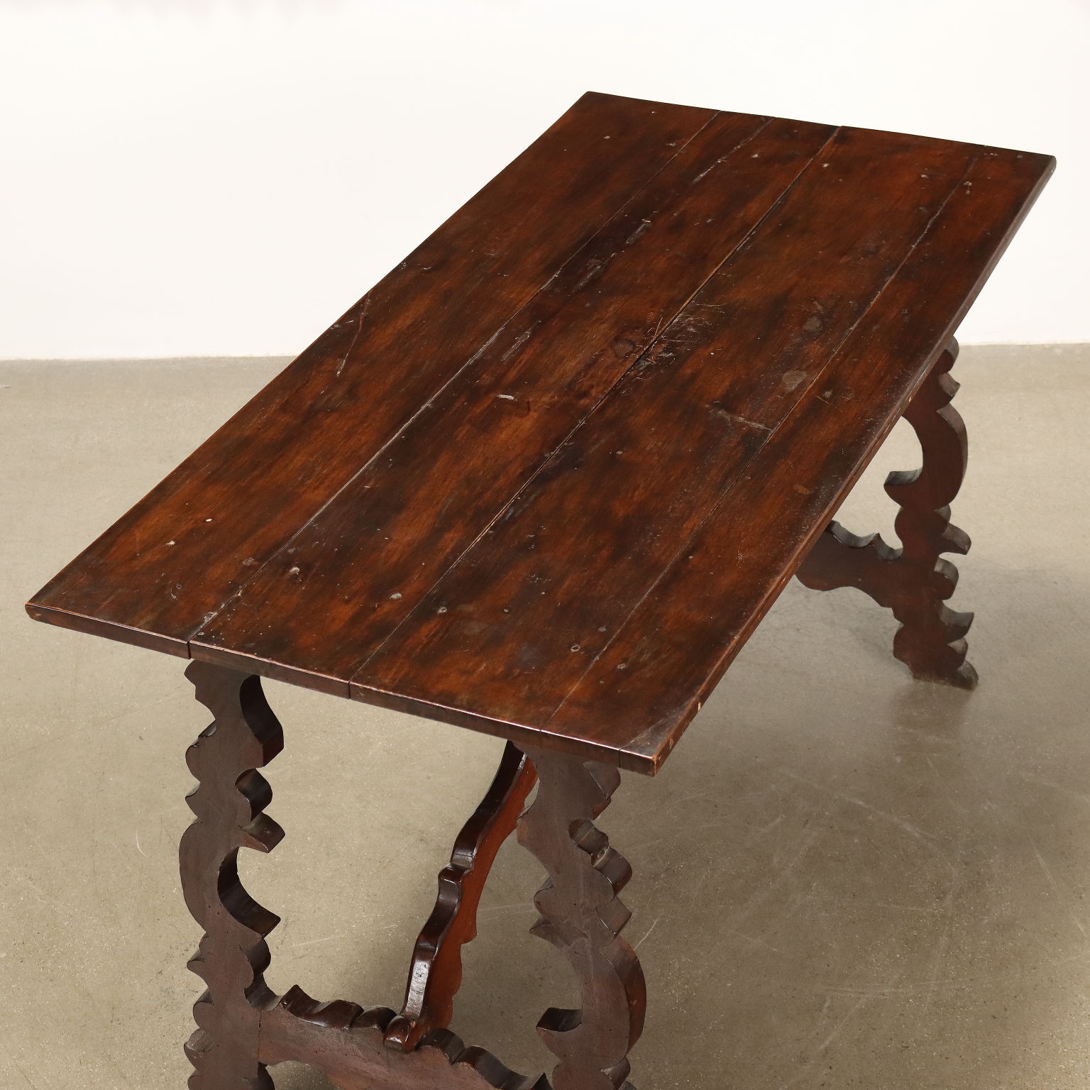 Tavolo fratino in noce modificato nelle dimensioni, gambe e saette antiche, piano sostituito Italia, XIX Secolo.