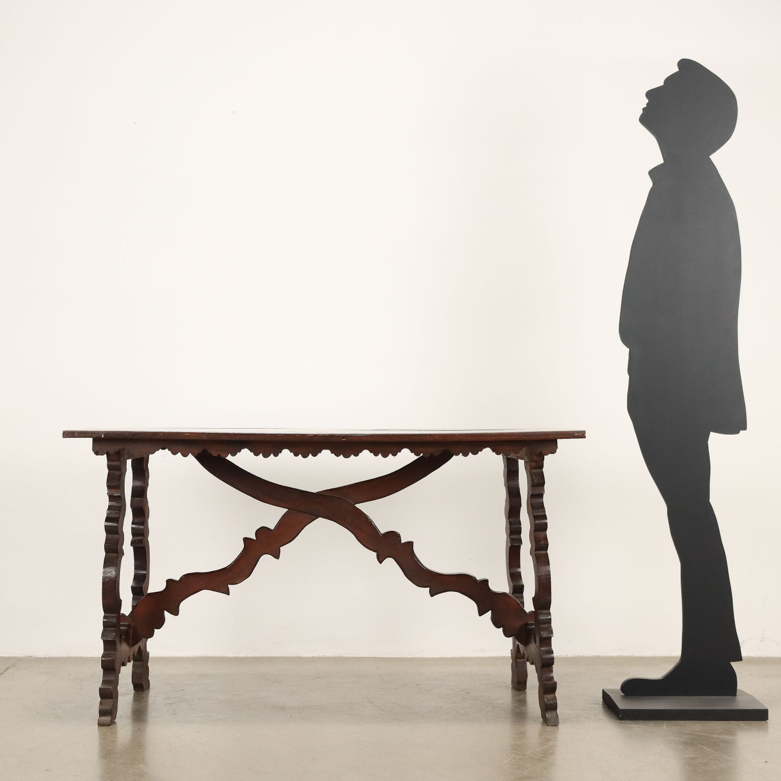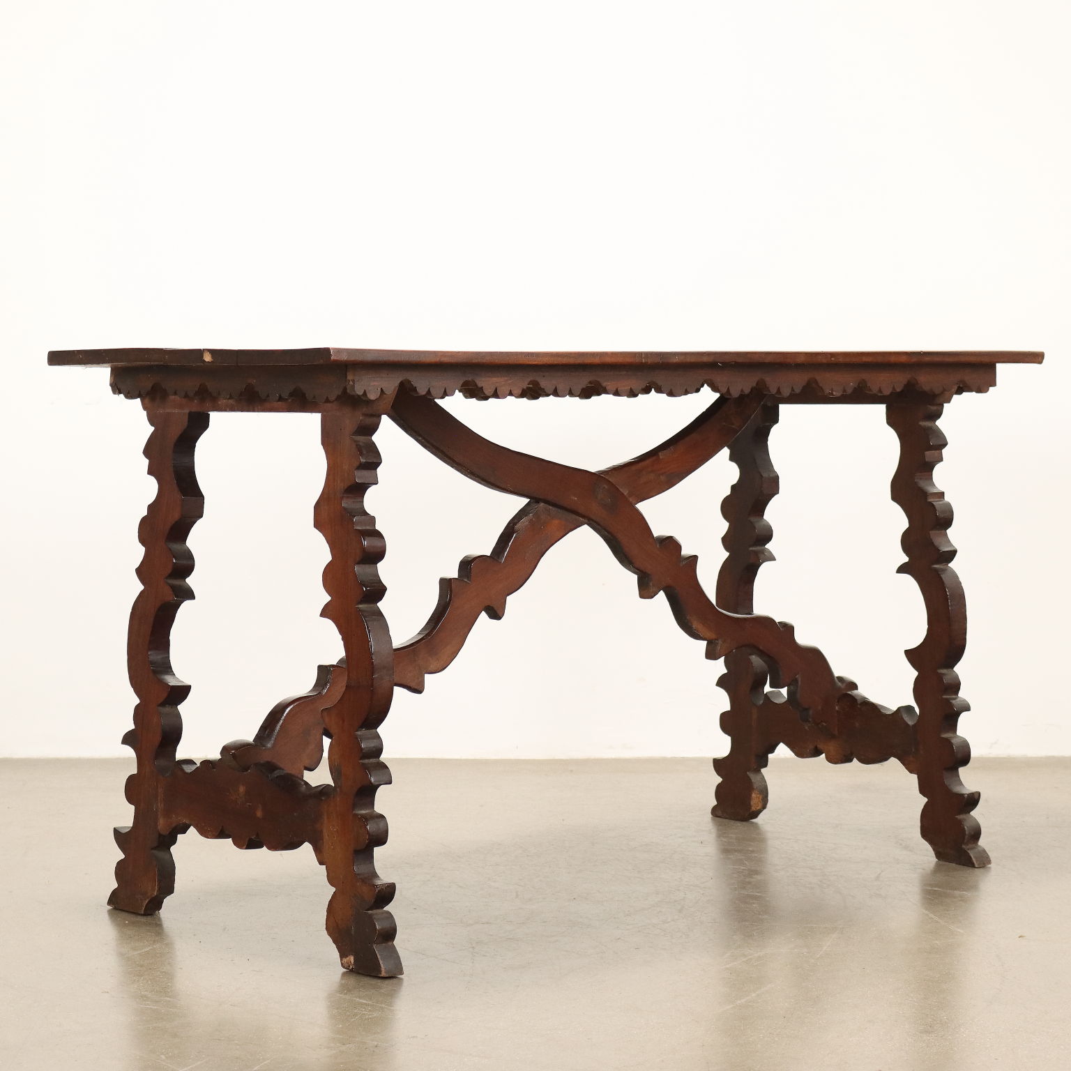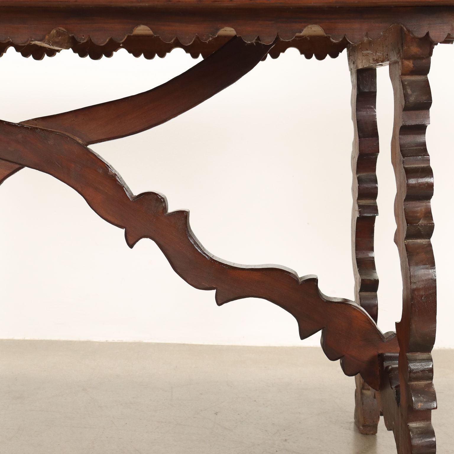 Tavolo fratino in noce modificato nelle dimensioni, gambe e saette antiche, piano sostituito Italia, XIX Secolo.