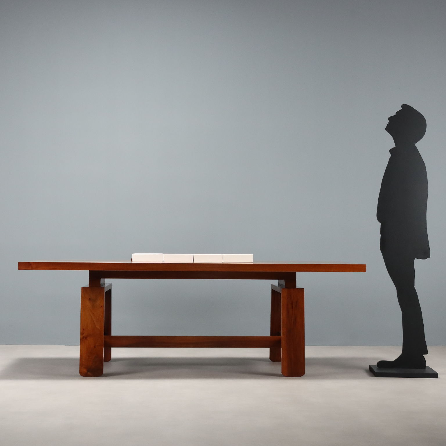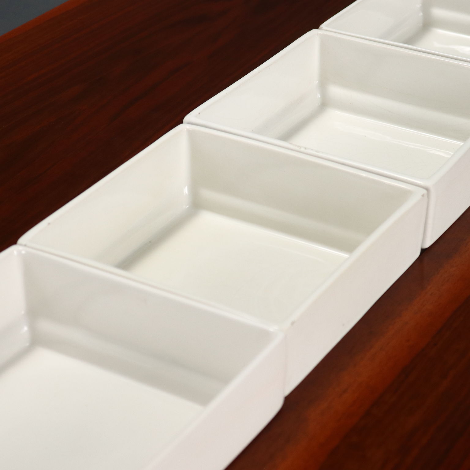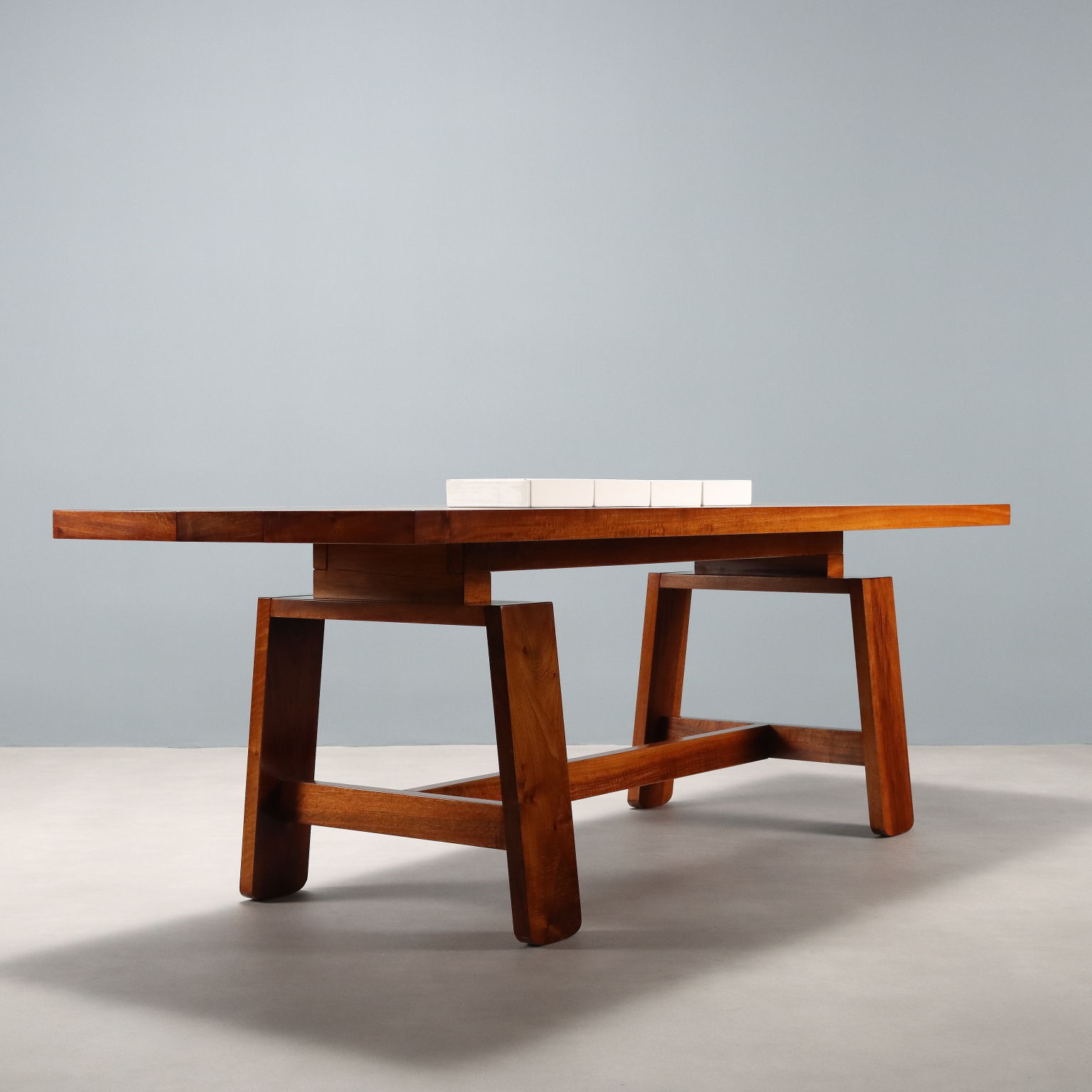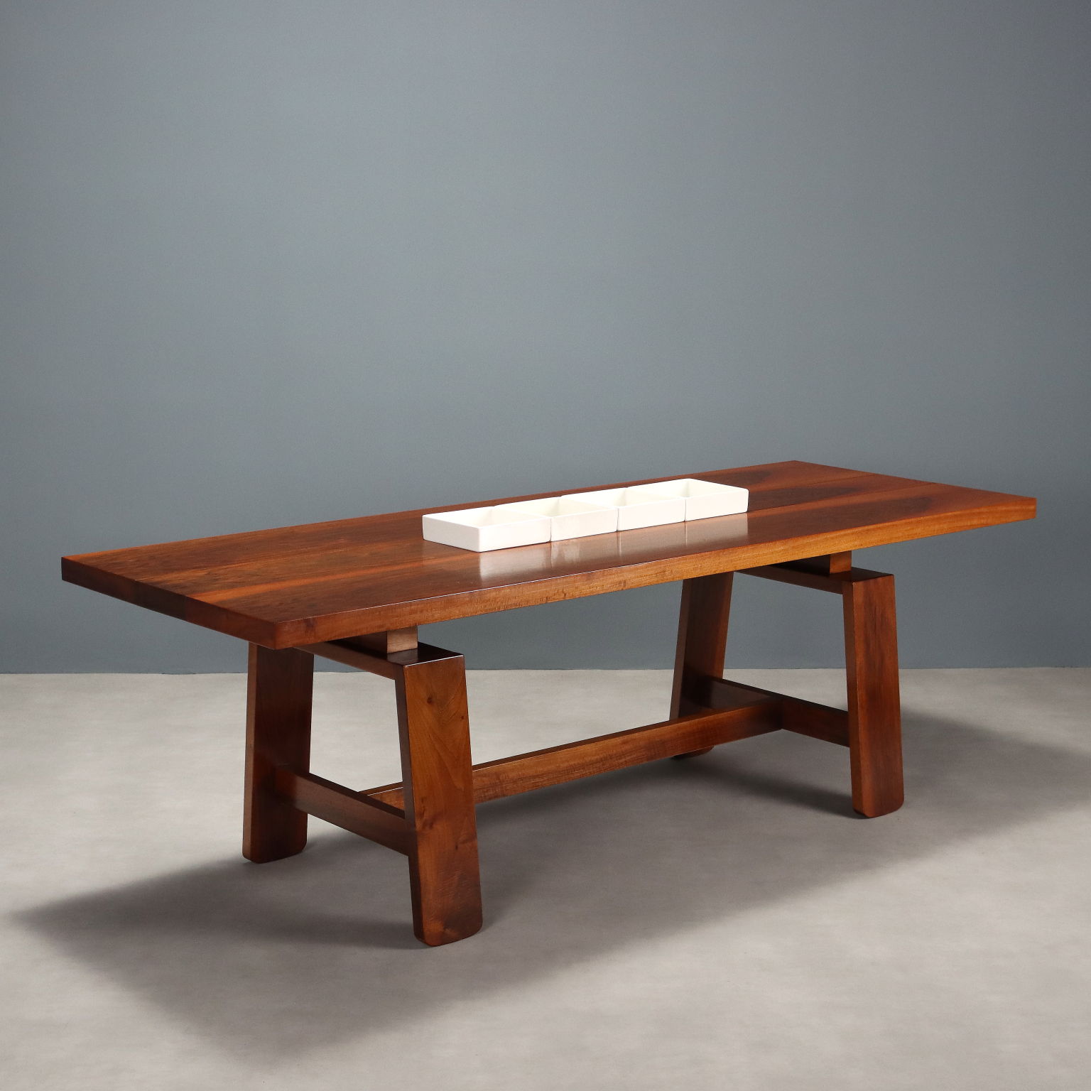Tavolo in legno massello impiallacciato noce con piano di forma rettangolare completo di accessori in ceramica che riportano il marchio della produzione. Restaurato nei nostri laboratori.