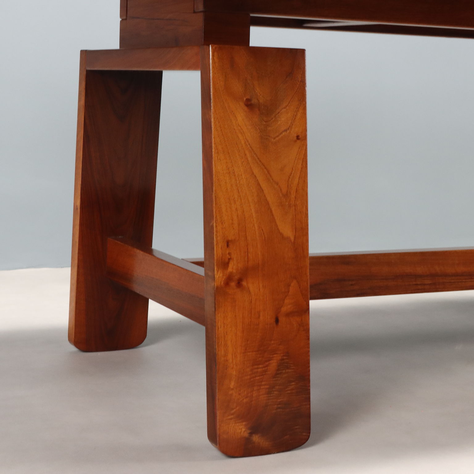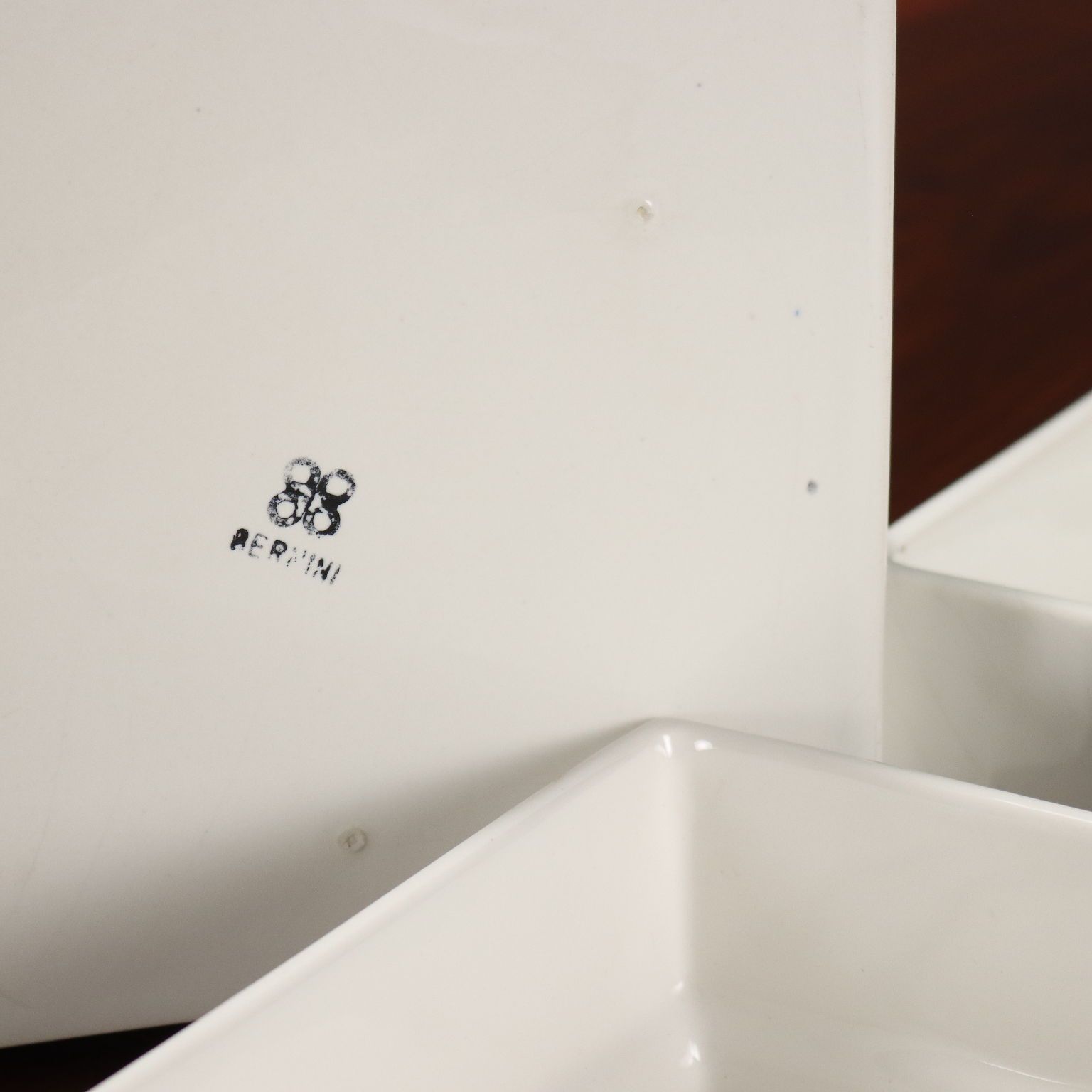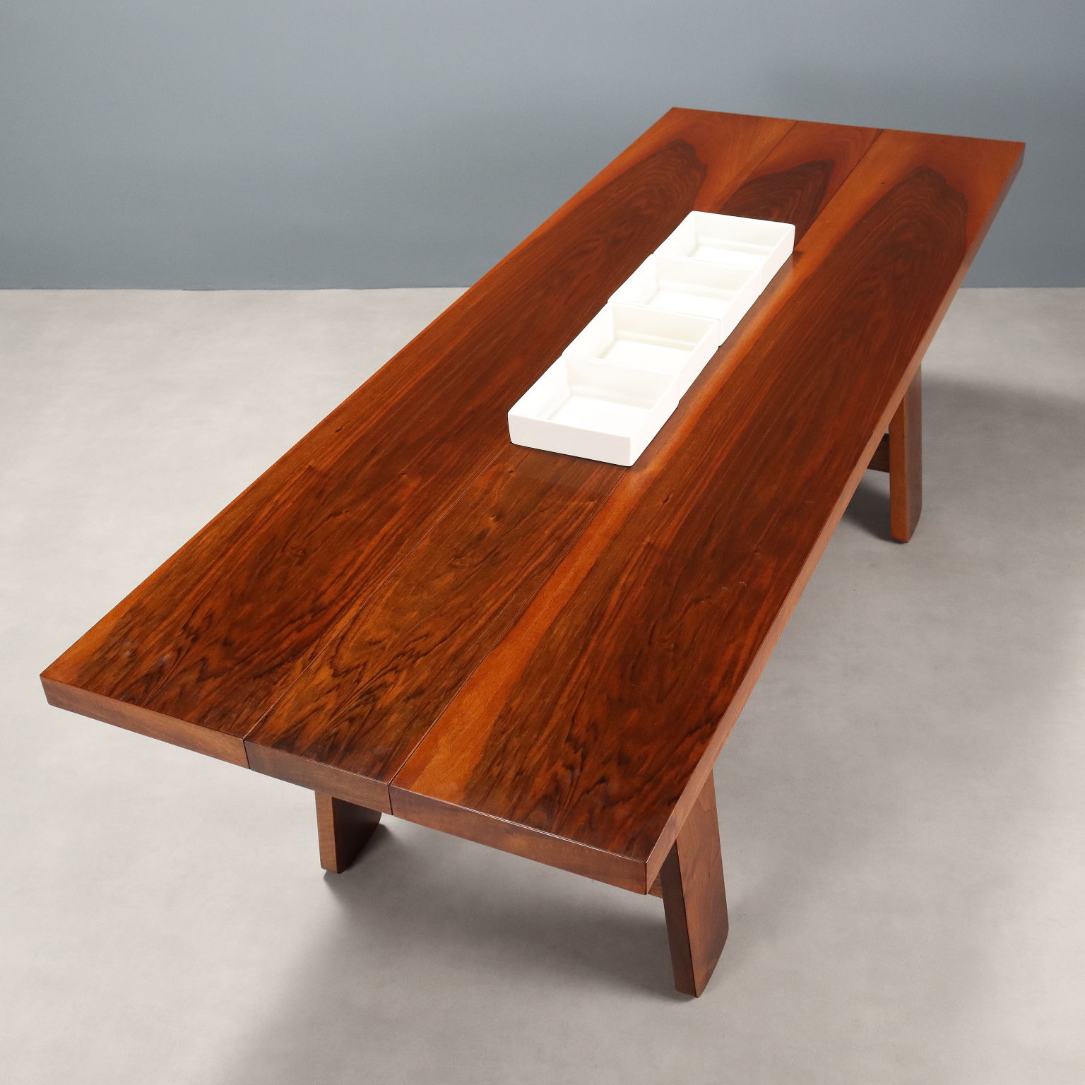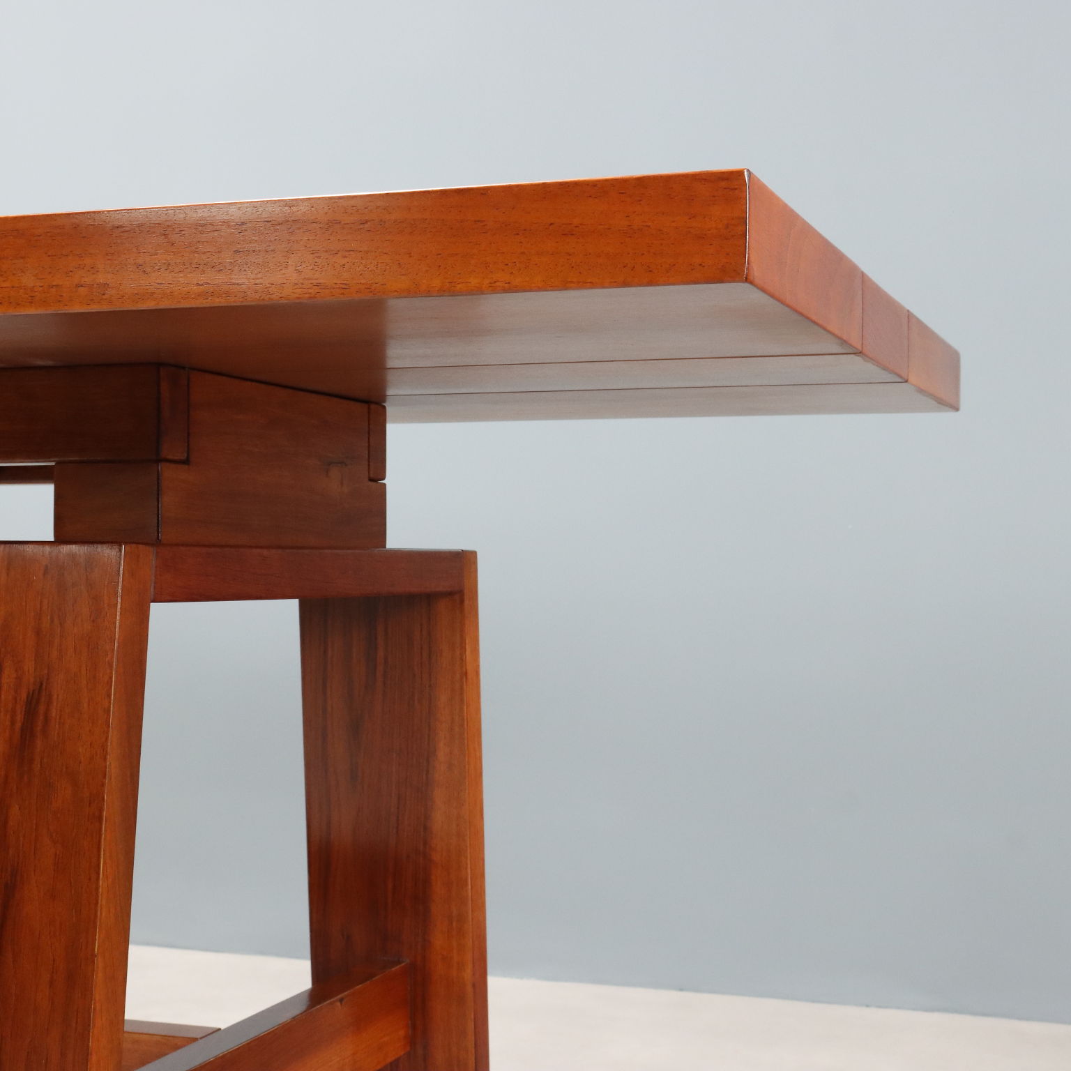 Tavolo in legno massello impiallacciato noce con piano di forma rettangolare completo di accessori in ceramica che riportano il marchio della produzione. Restaurato nei nostri laboratori.