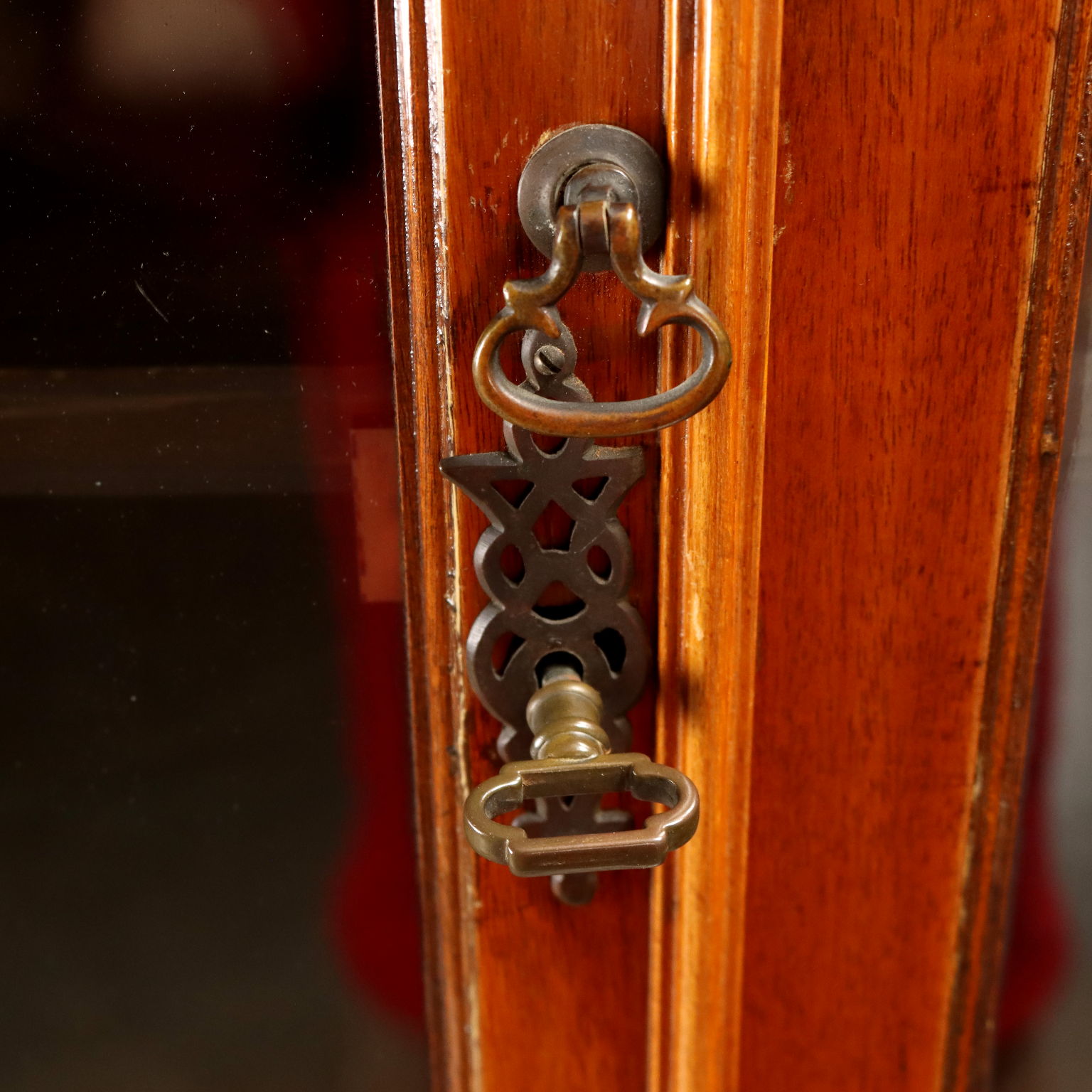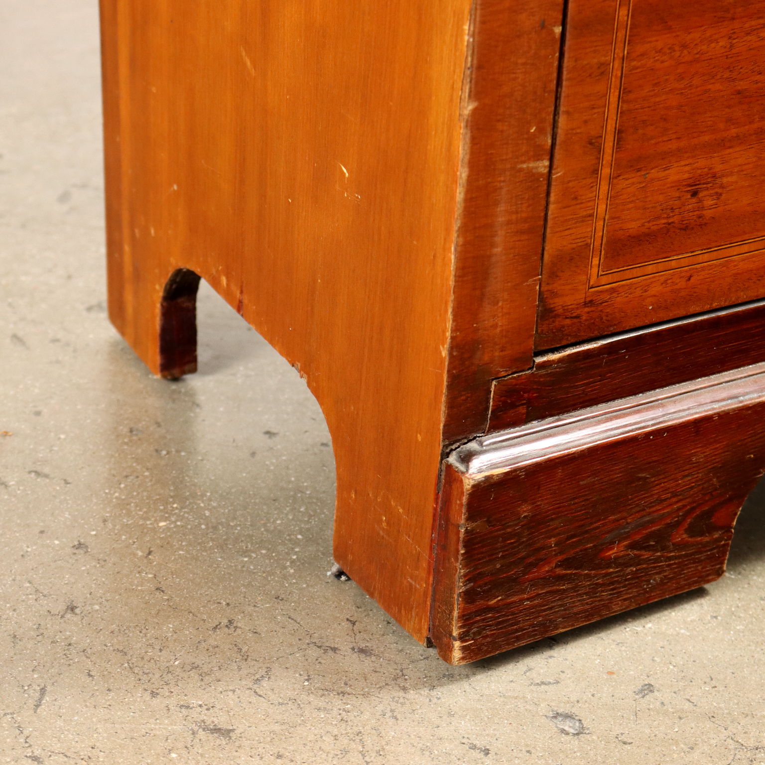 Coppia di librerie in mogano e abete impiallacciato mogano. Filettature in acero e bois de rose sul fronte dei cassetti e delle ante nella base, Alzata con ante a vetri soffiati montati su struttura lignea reticolata. Inghilterra, fine XIX Secolo.