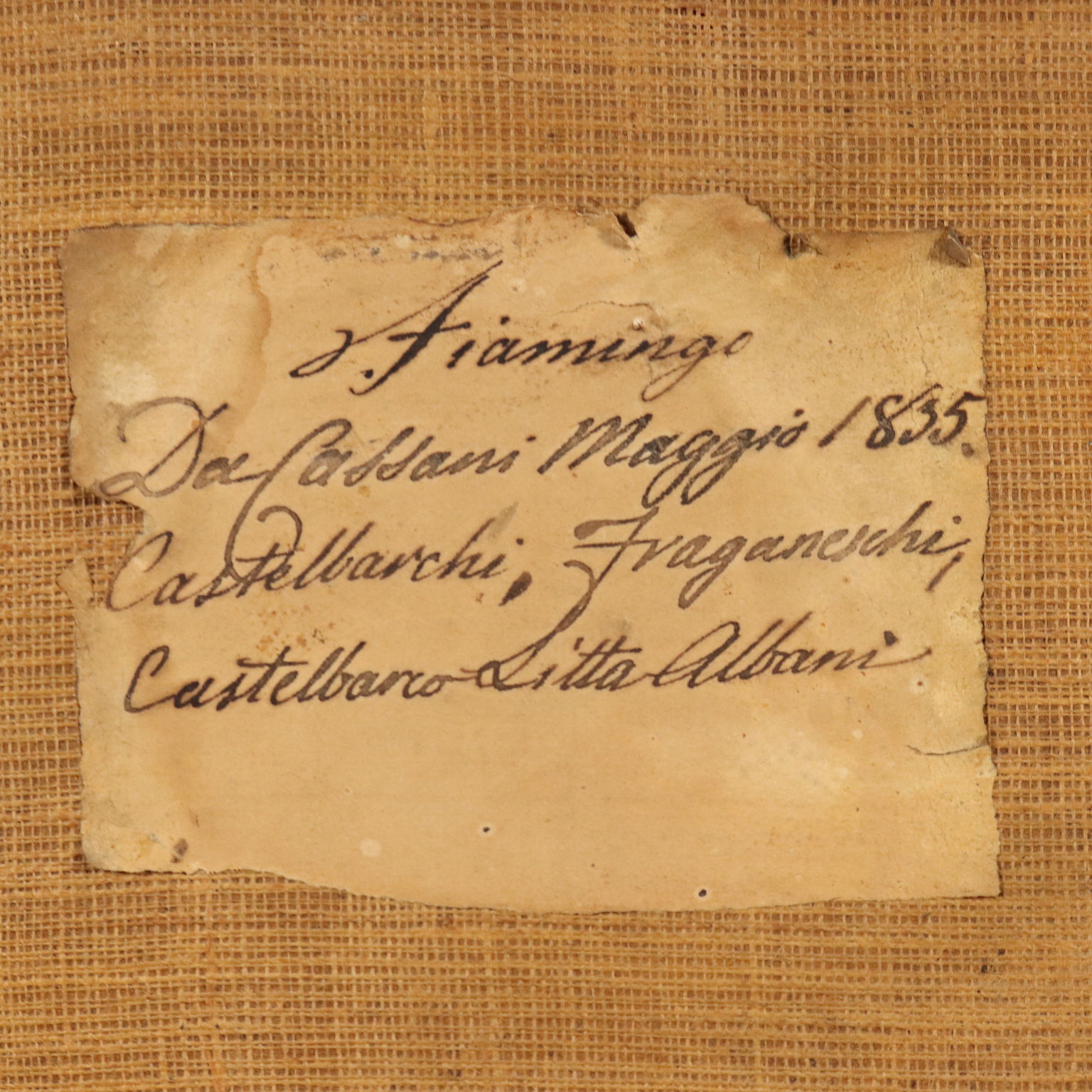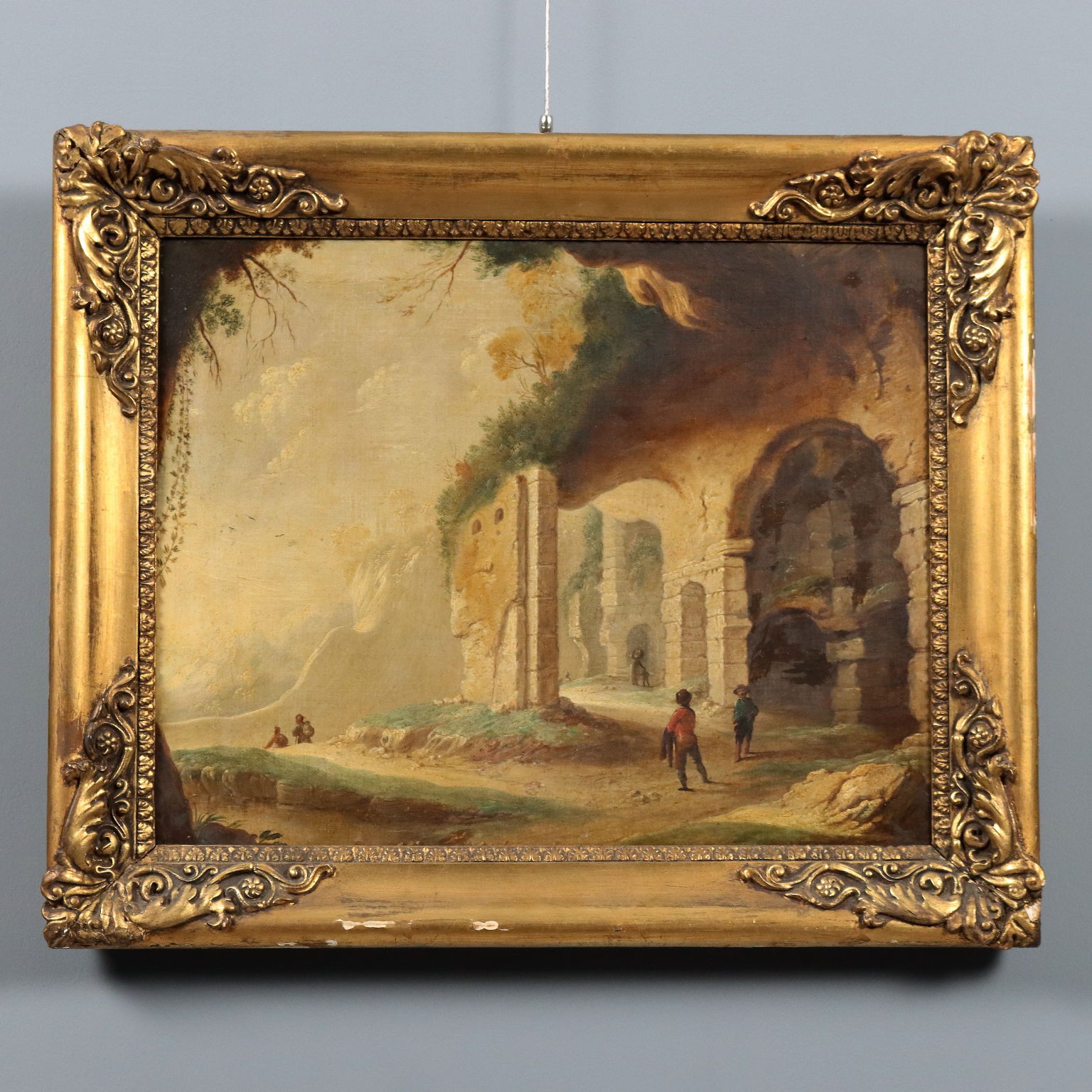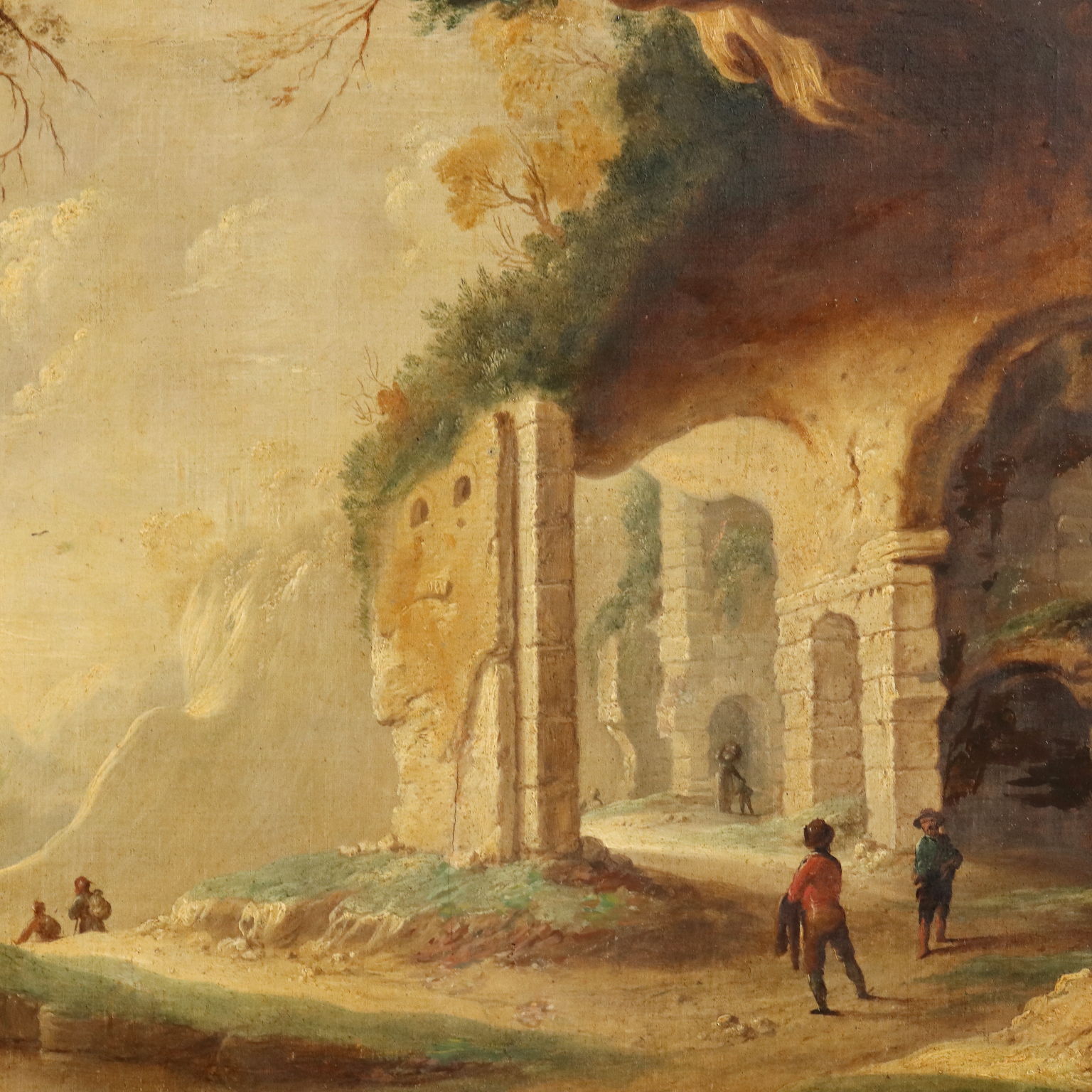 Olio su tela. Seconda metà del XVIII secolo. Al retro è presente cartiglio scritto a mano, datato Maggio 1835 e indicante diverse importanti famiglie (Castelbarchi, Fraganeschi, Castelbarco Litta Albani) del Nord Italia, che probabilmente furono proprietarie dell' opera. Nel dipinto è presentato un paesaggio nordico, di cui si intravvedono cime rocciose sulla sinistra, nel quale sono inserite delle rovine architettoniche, con figure di viandanti che transitano nelle sue vicinanze. Il dipinto è presentato in cornice in stile.