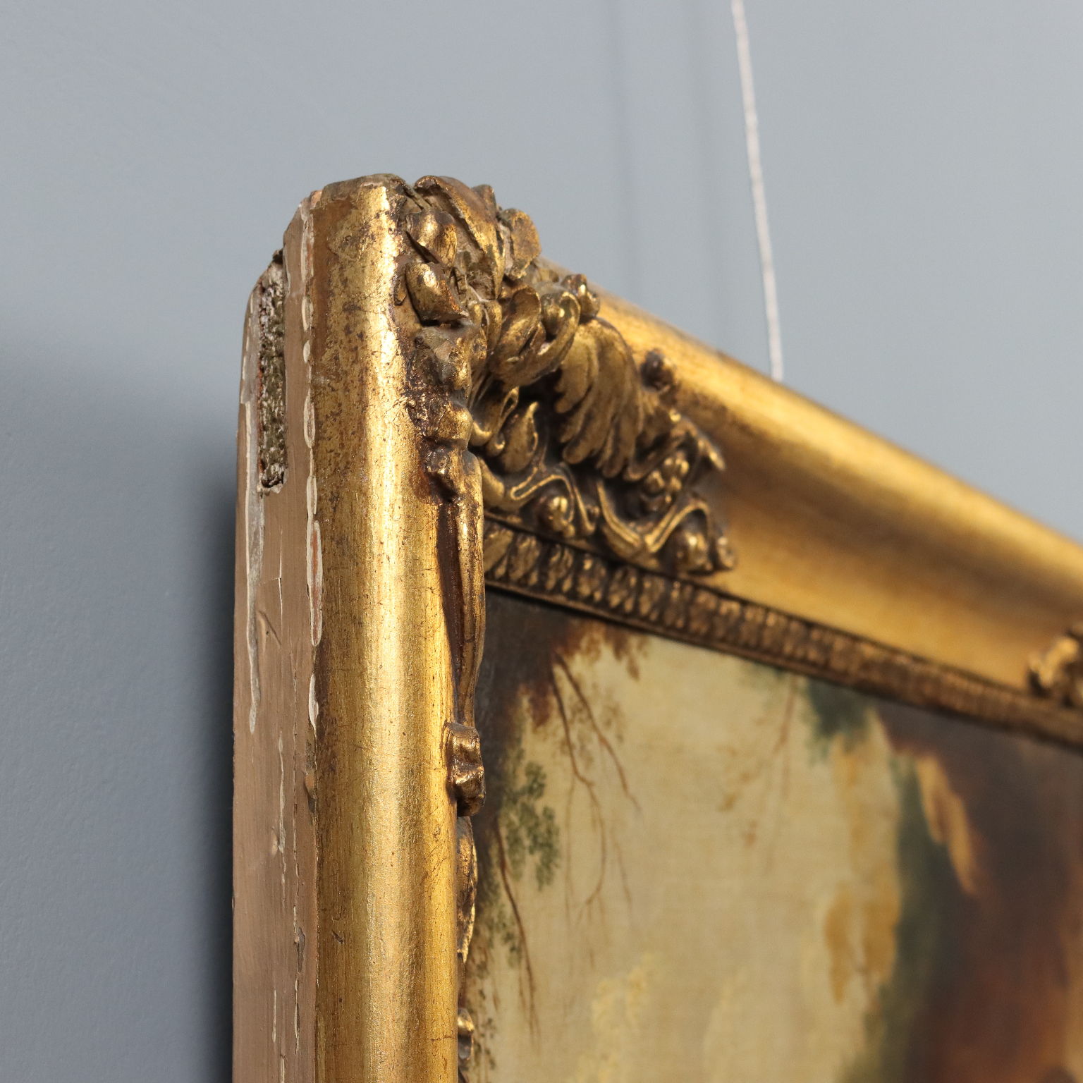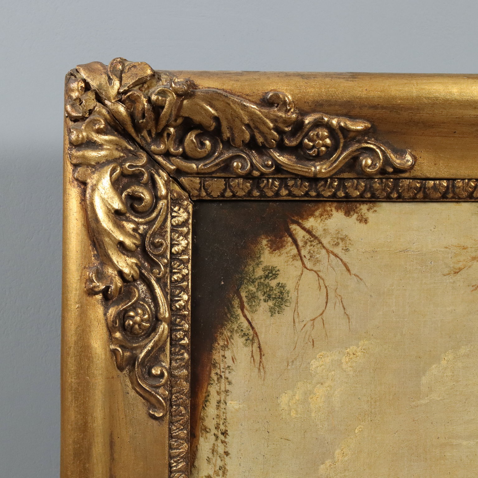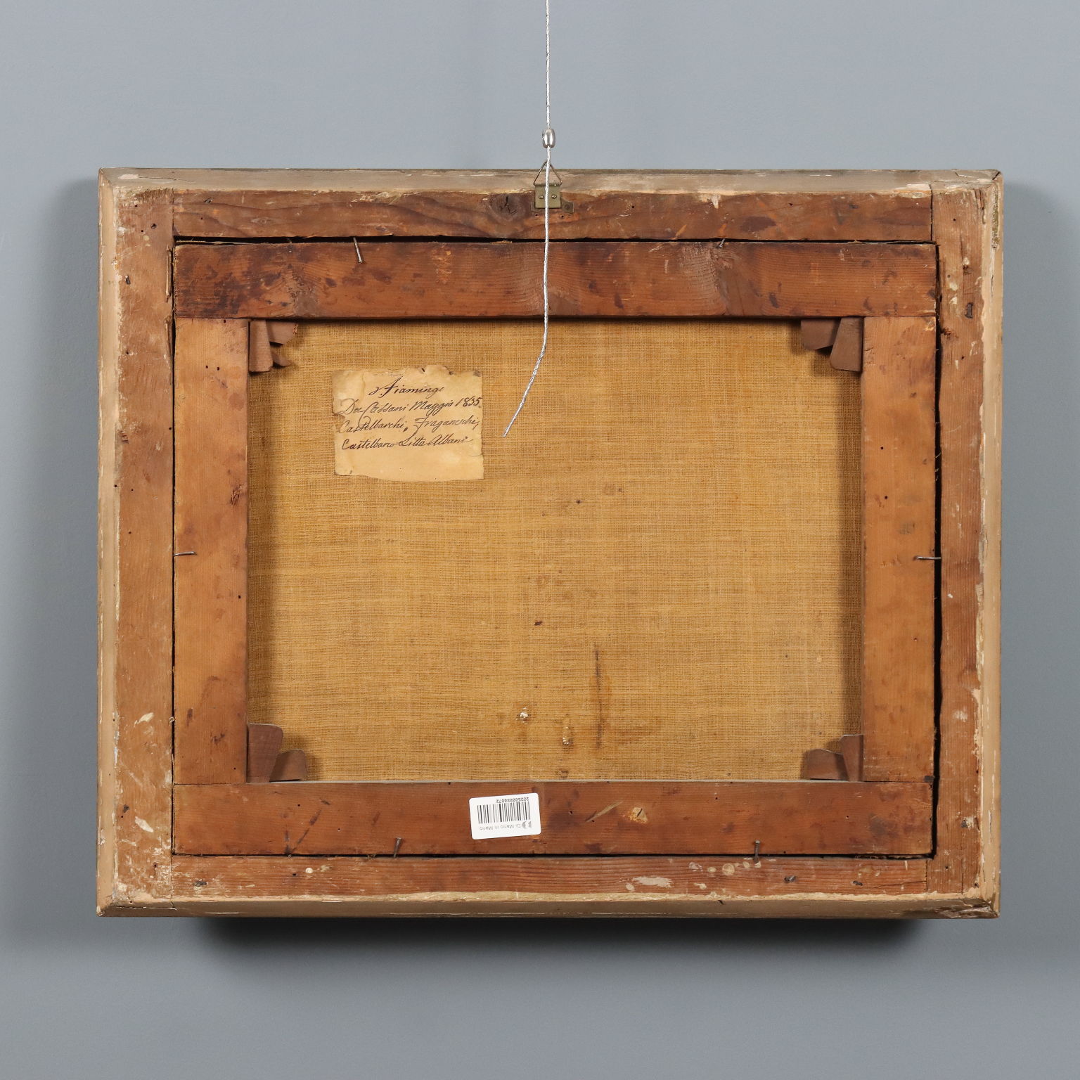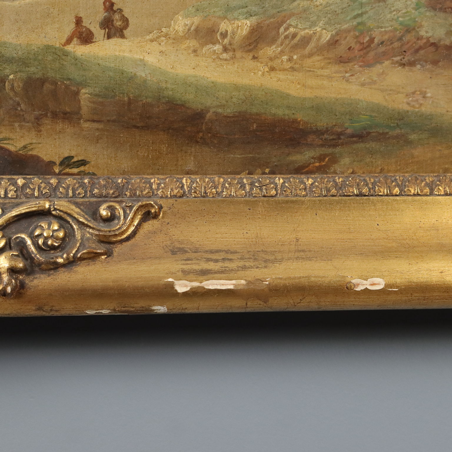 Olio su tela. Seconda metà del XVIII secolo. Al retro è presente cartiglio scritto a mano, datato Maggio 1835 e indicante diverse importanti famiglie (Castelbarchi, Fraganeschi, Castelbarco Litta Albani) del Nord Italia, che probabilmente furono proprietarie dell' opera. Nel dipinto è presentato un paesaggio nordico, di cui si intravvedono cime rocciose sulla sinistra, nel quale sono inserite delle rovine architettoniche, con figure di viandanti che transitano nelle sue vicinanze. Il dipinto è presentato in cornice in stile.