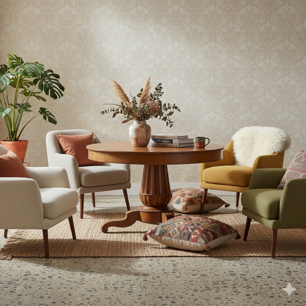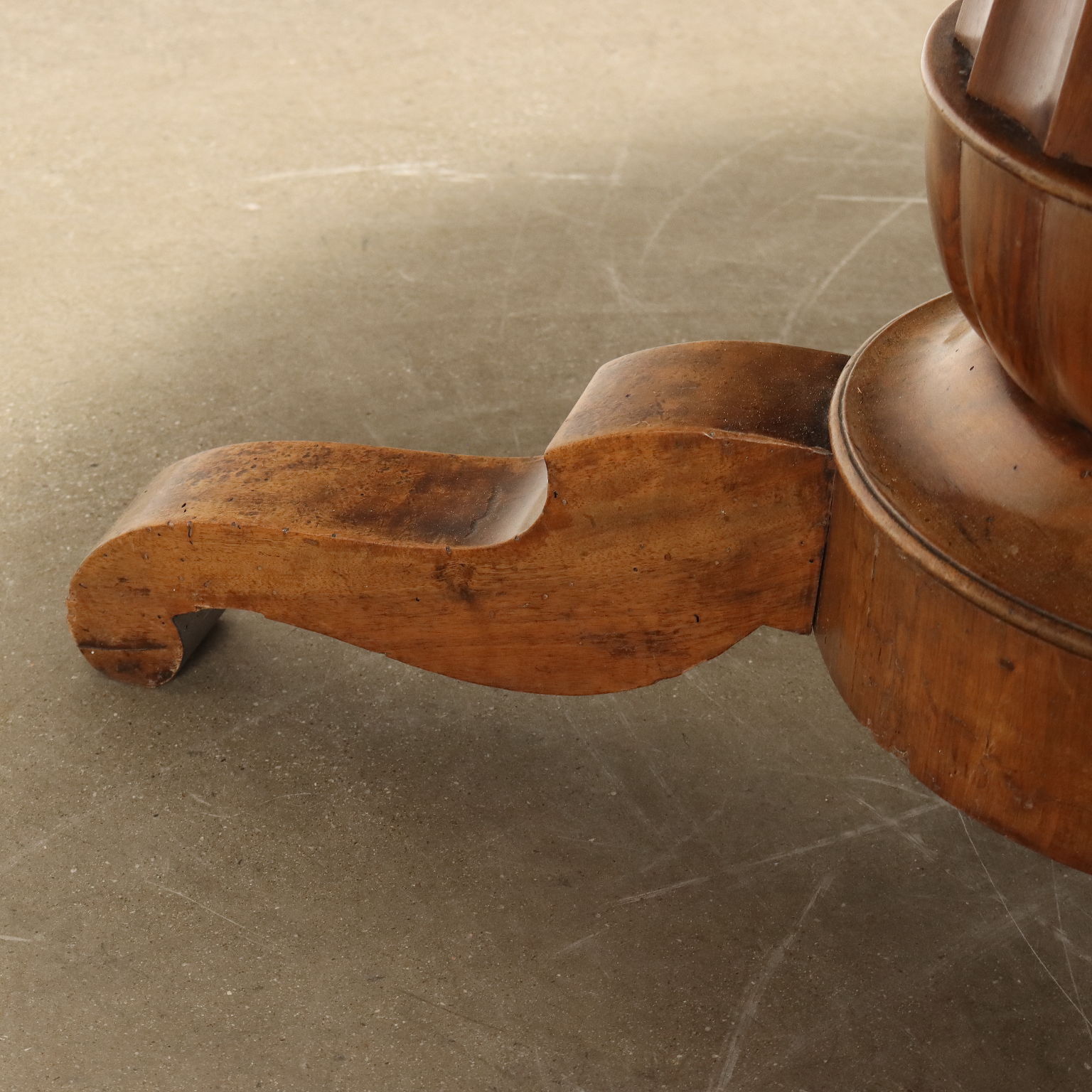 Tavolo rotondo in noce, cassetto nella fascia sotto piano, gamba centrale poggiante su tre piedi mossi. Mancanze Italia, XIX Secolo.