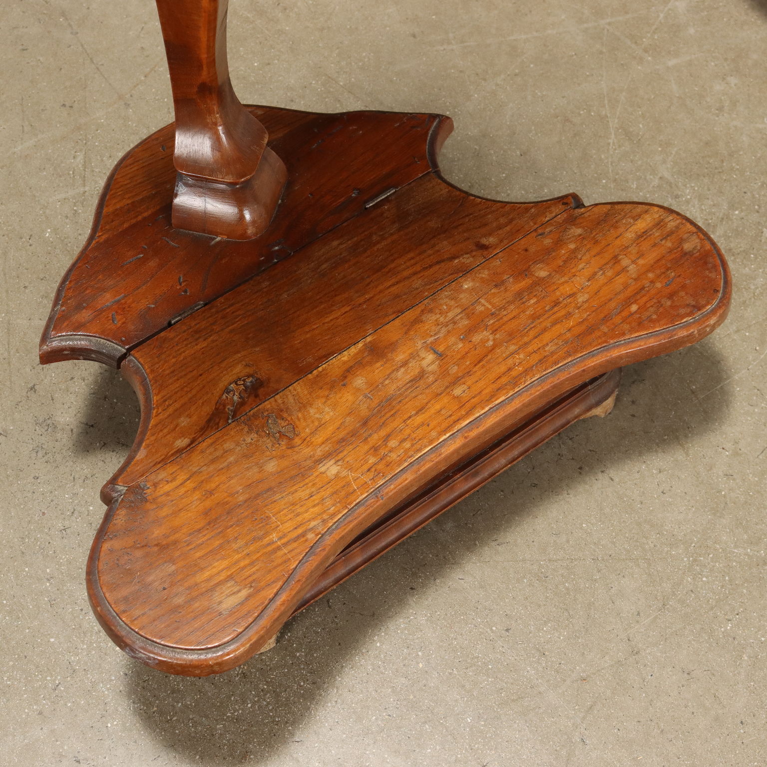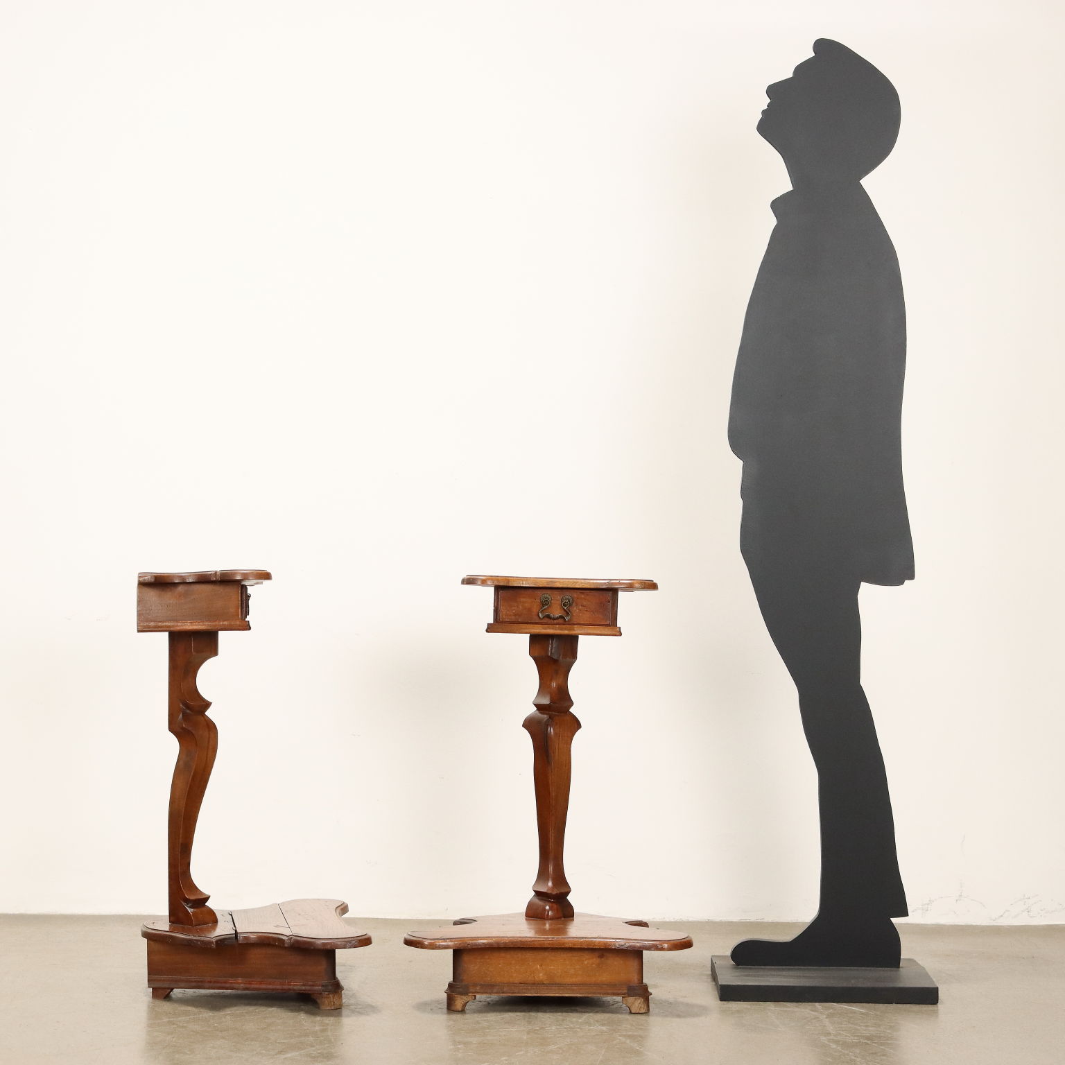 Coppia di comodini a inginocchiatoio in stile Barocco, faggio tinto noce. Cassettino sottopiano, gamba centrale mossa, piano a ribalta celante vano a giorno nell'inginocchiatoio. Italia, fine XIX Secolo.