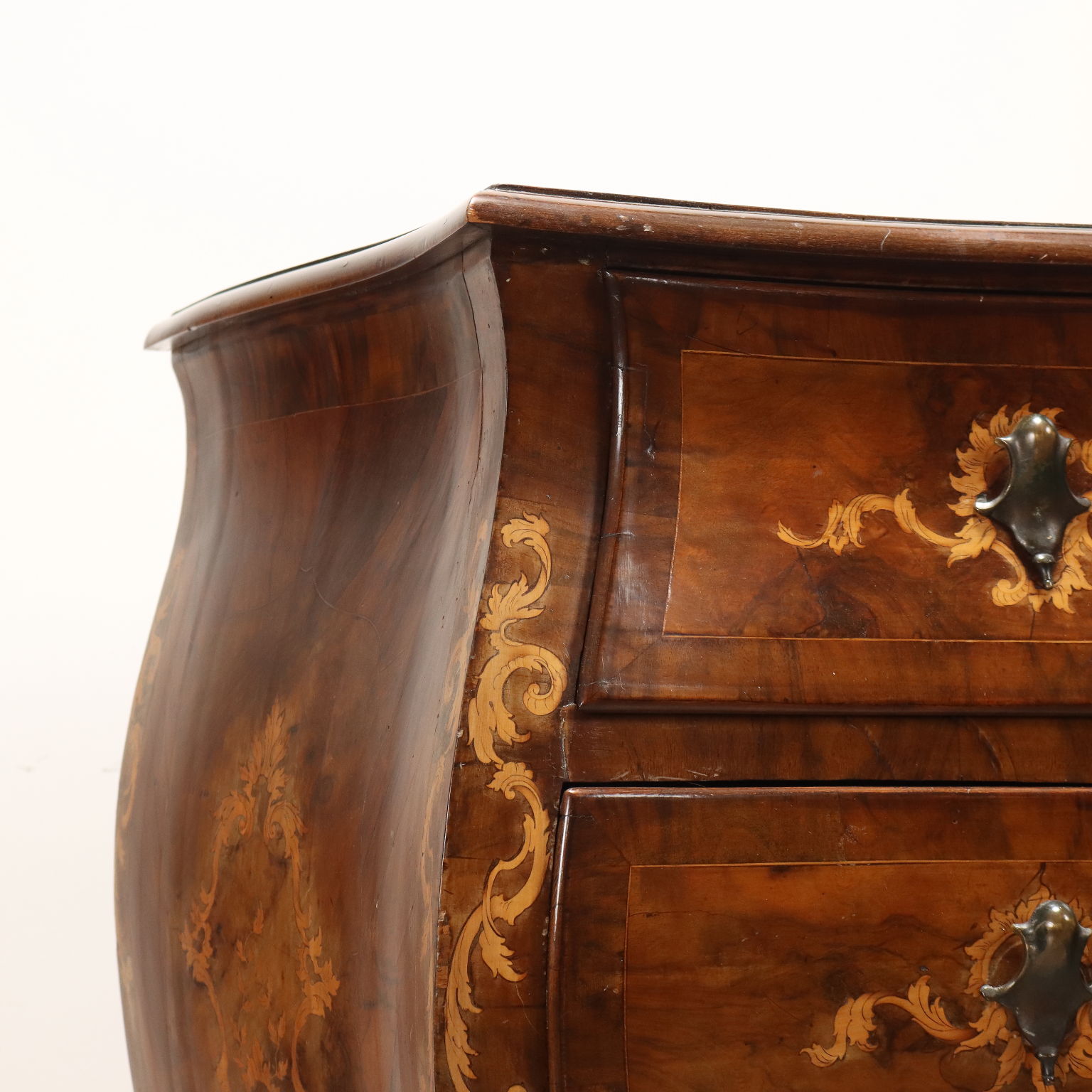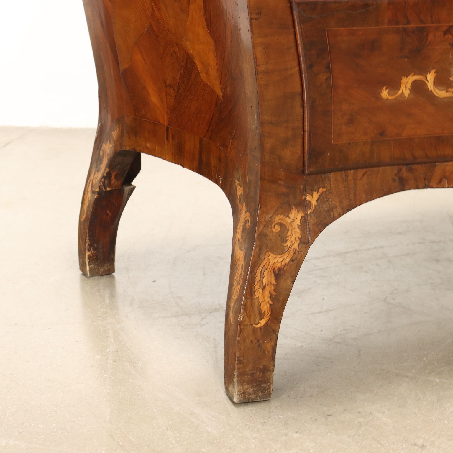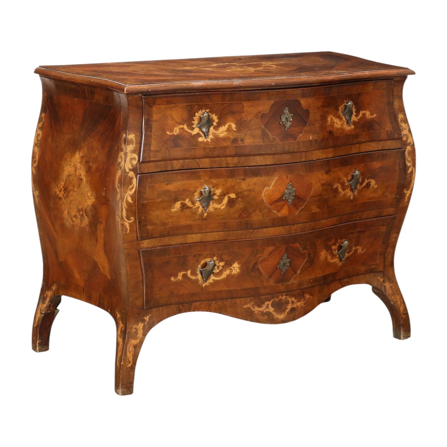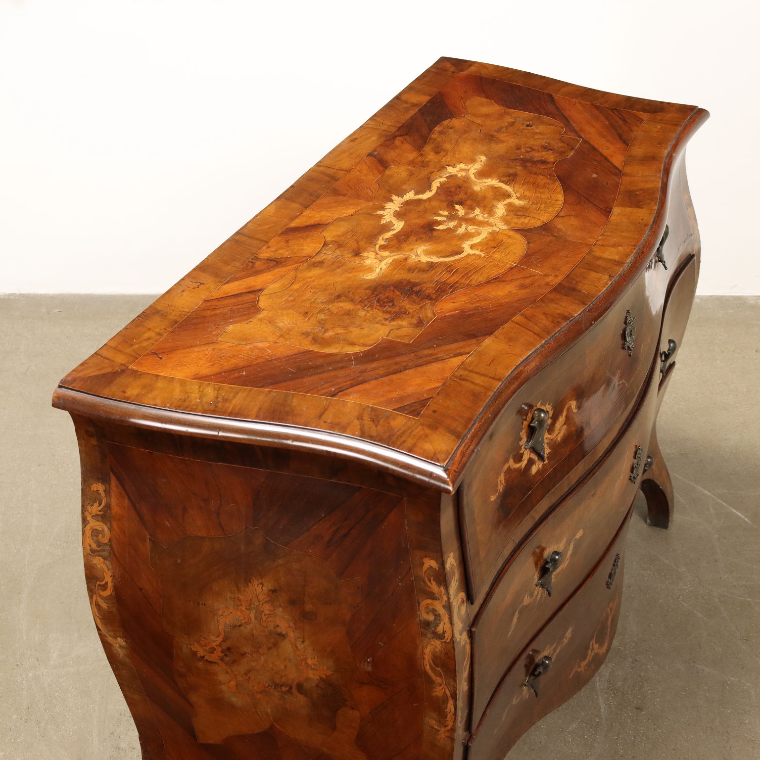 Cassettone in stile Barocchetto bombato nelle forme, in abete impiallacciato noce e radica di noce, intarsi fogliacei e volute in acero su tutta la superficie. Fronte a tre cassetti, interni in abete, maniglie e bocchette in bronzo. Italia, XX Secolo.