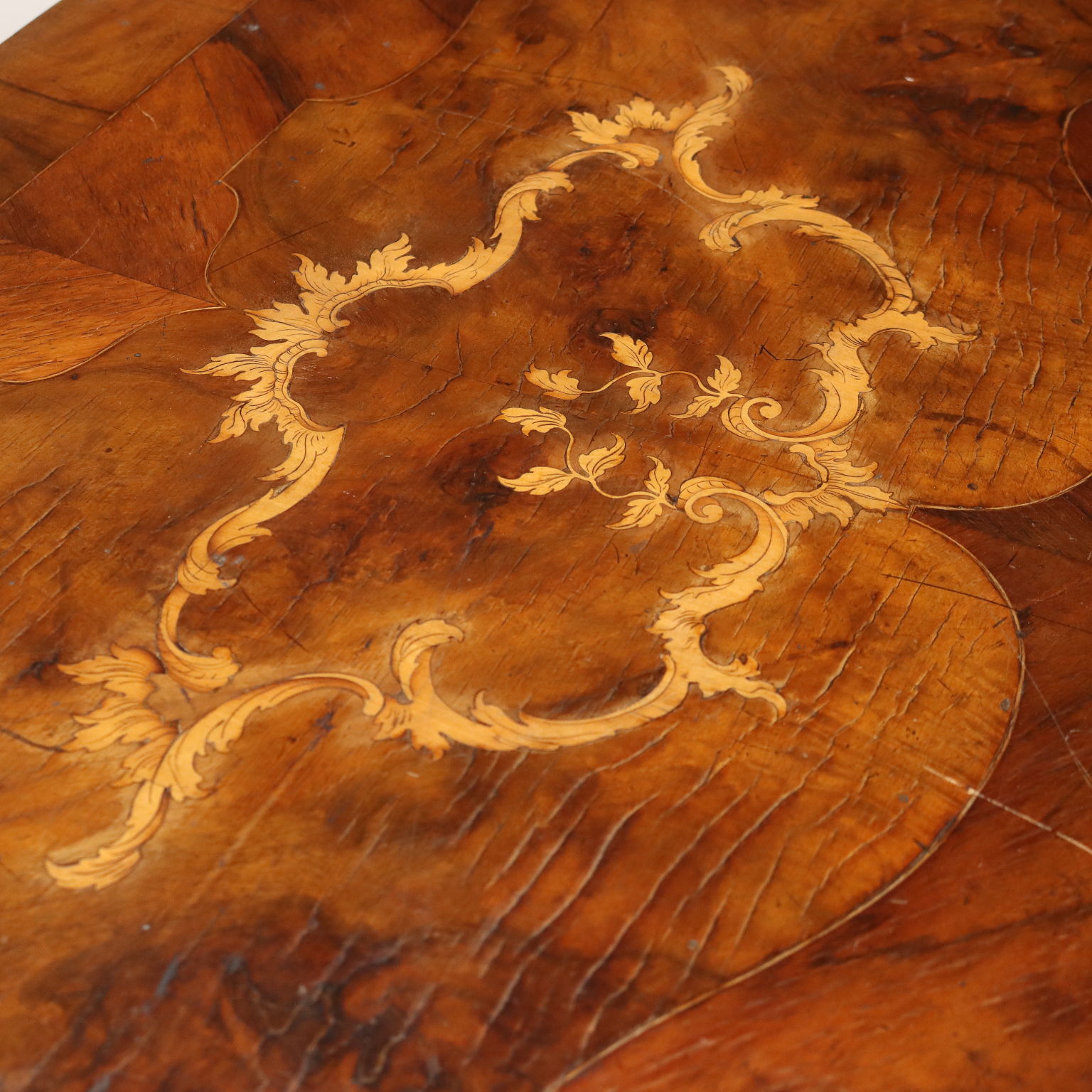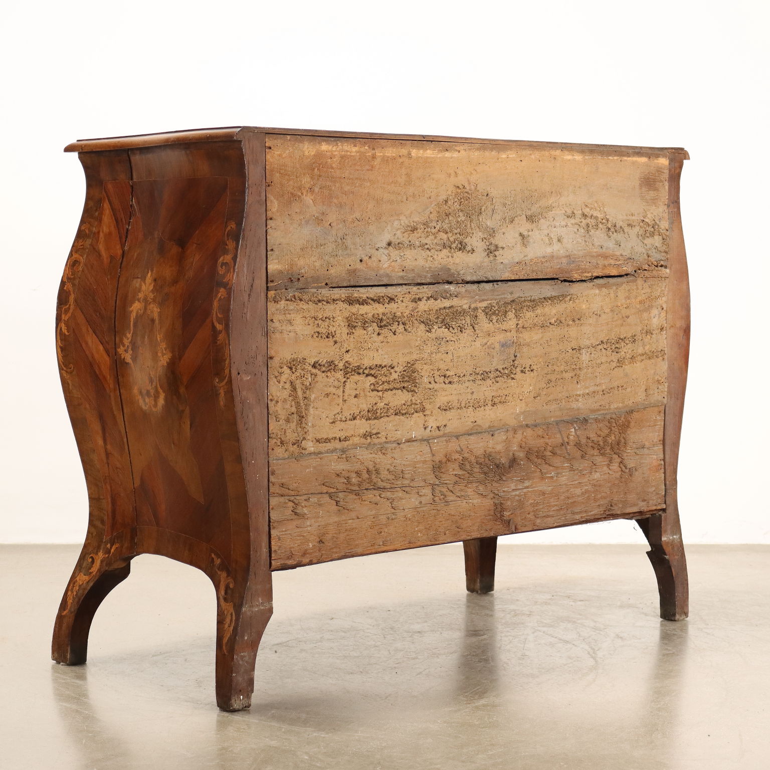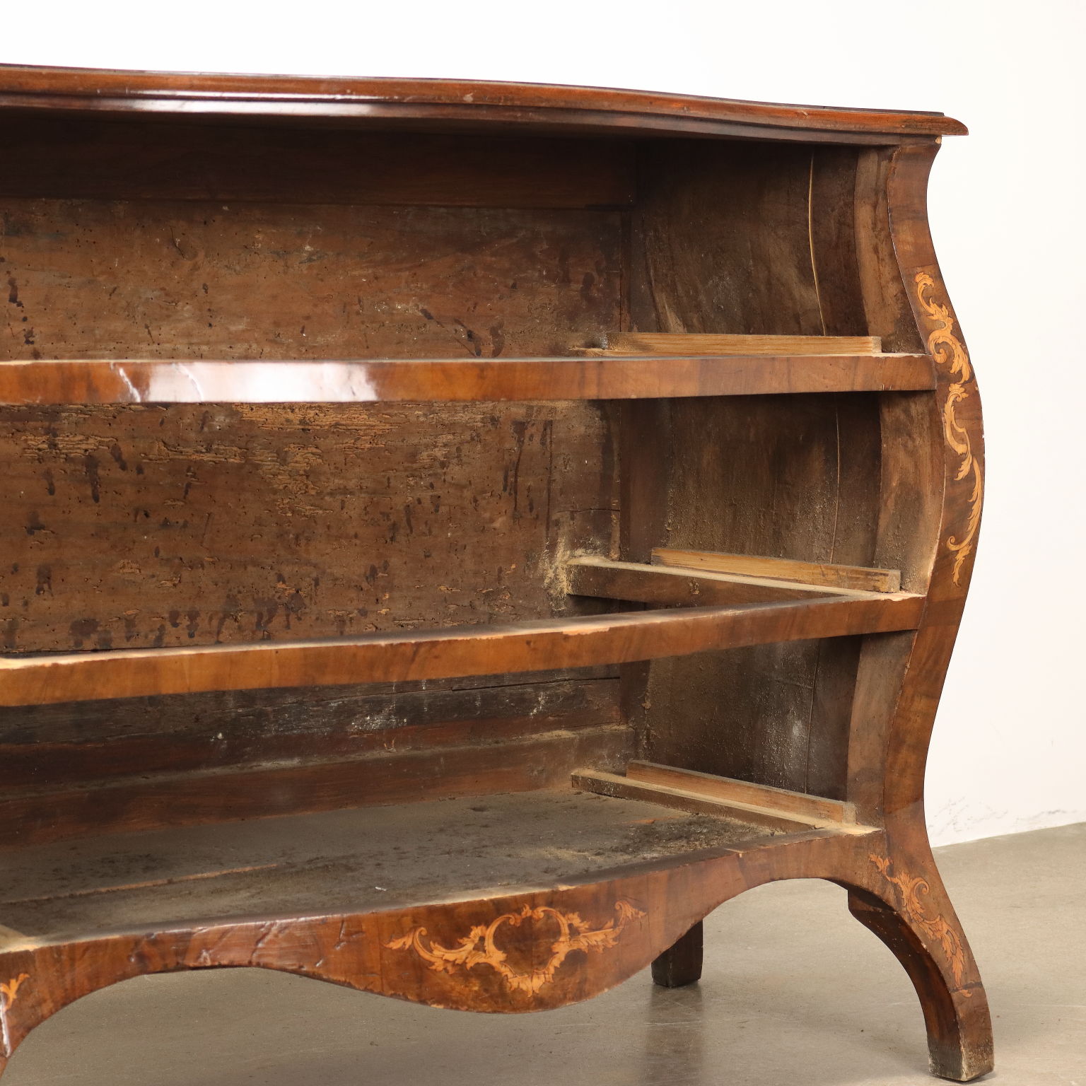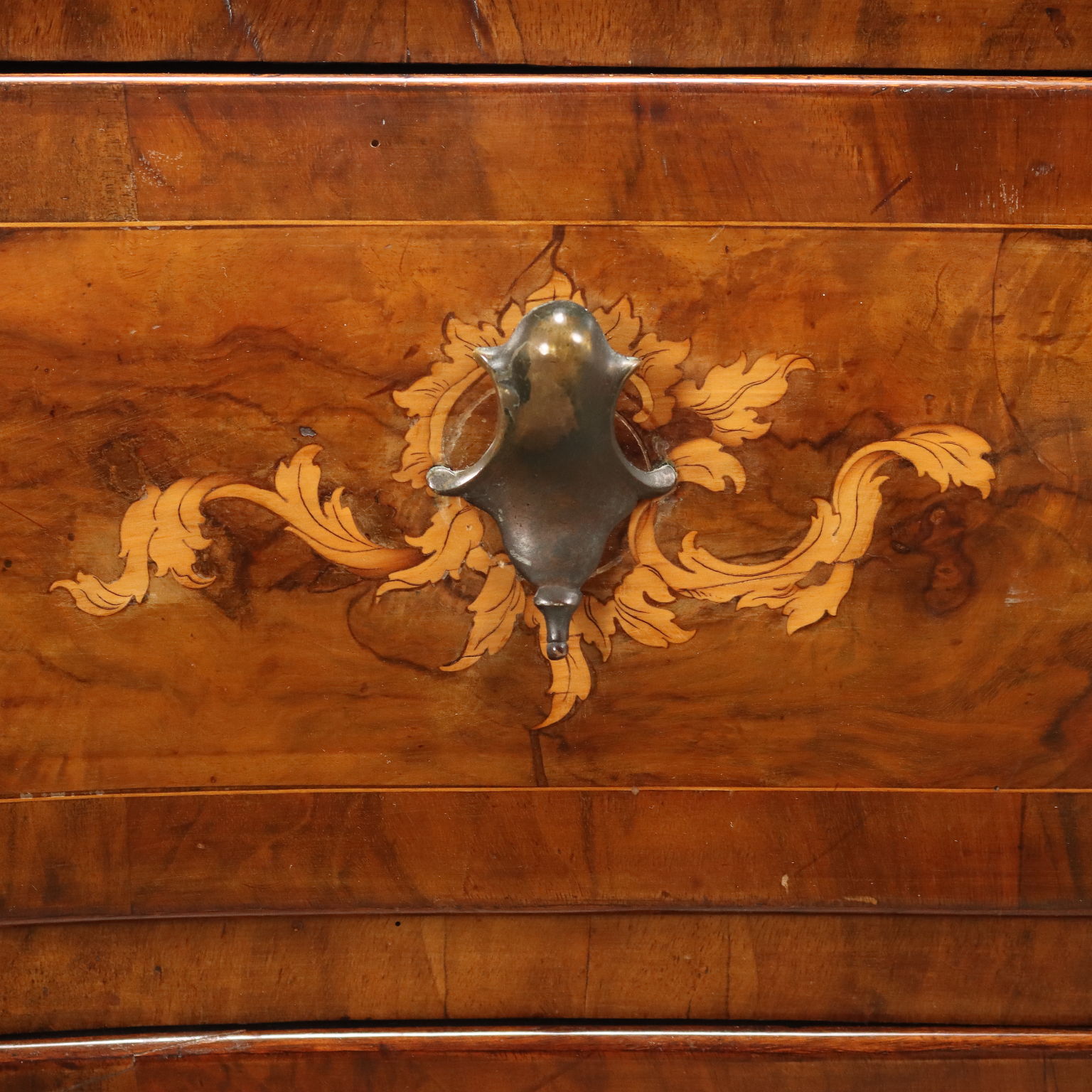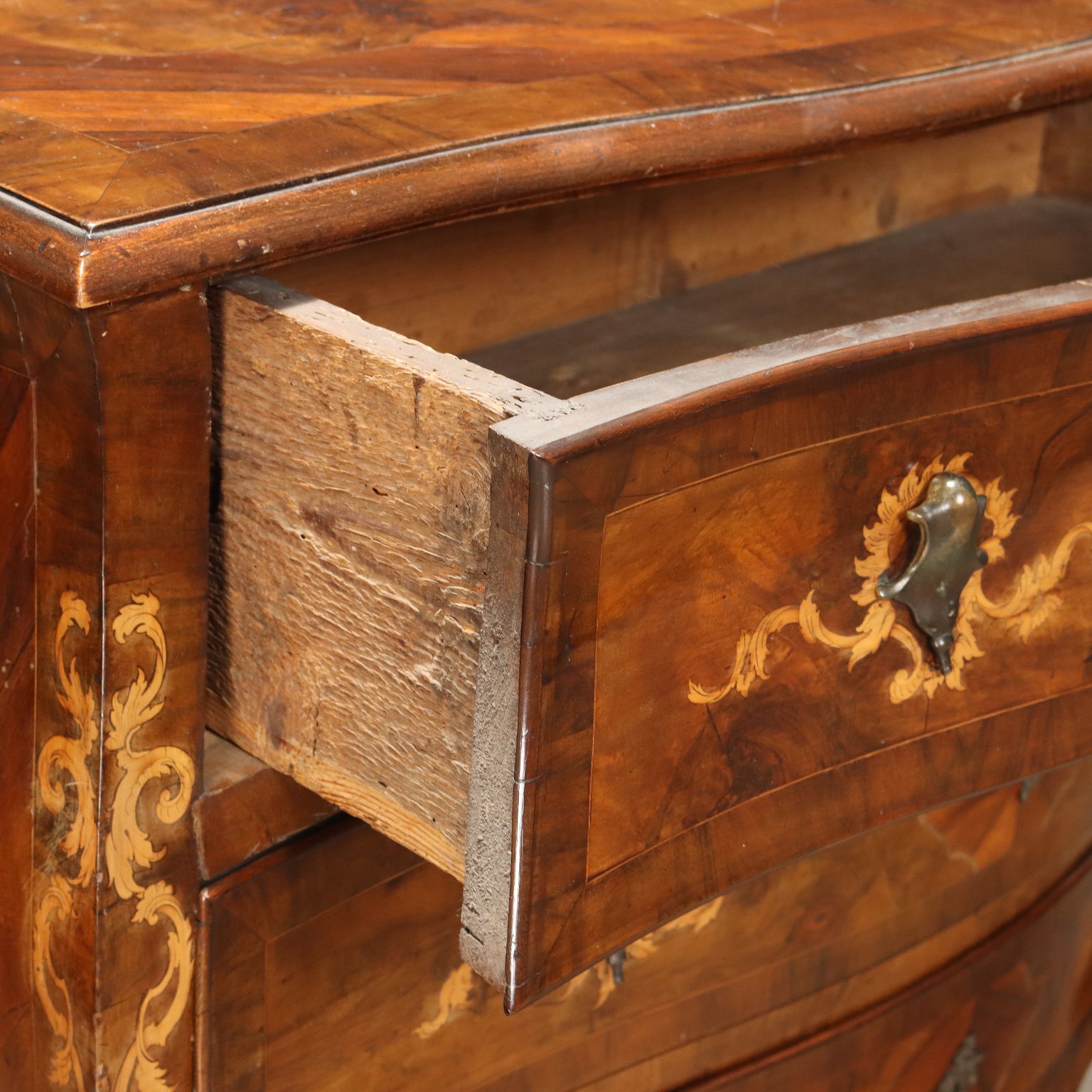 Cassettone in stile Barocchetto bombato nelle forme, in abete impiallacciato noce e radica di noce, intarsi fogliacei e volute in acero su tutta la superficie. Fronte a tre cassetti, interni in abete, maniglie e bocchette in bronzo. Italia, XX Secolo.