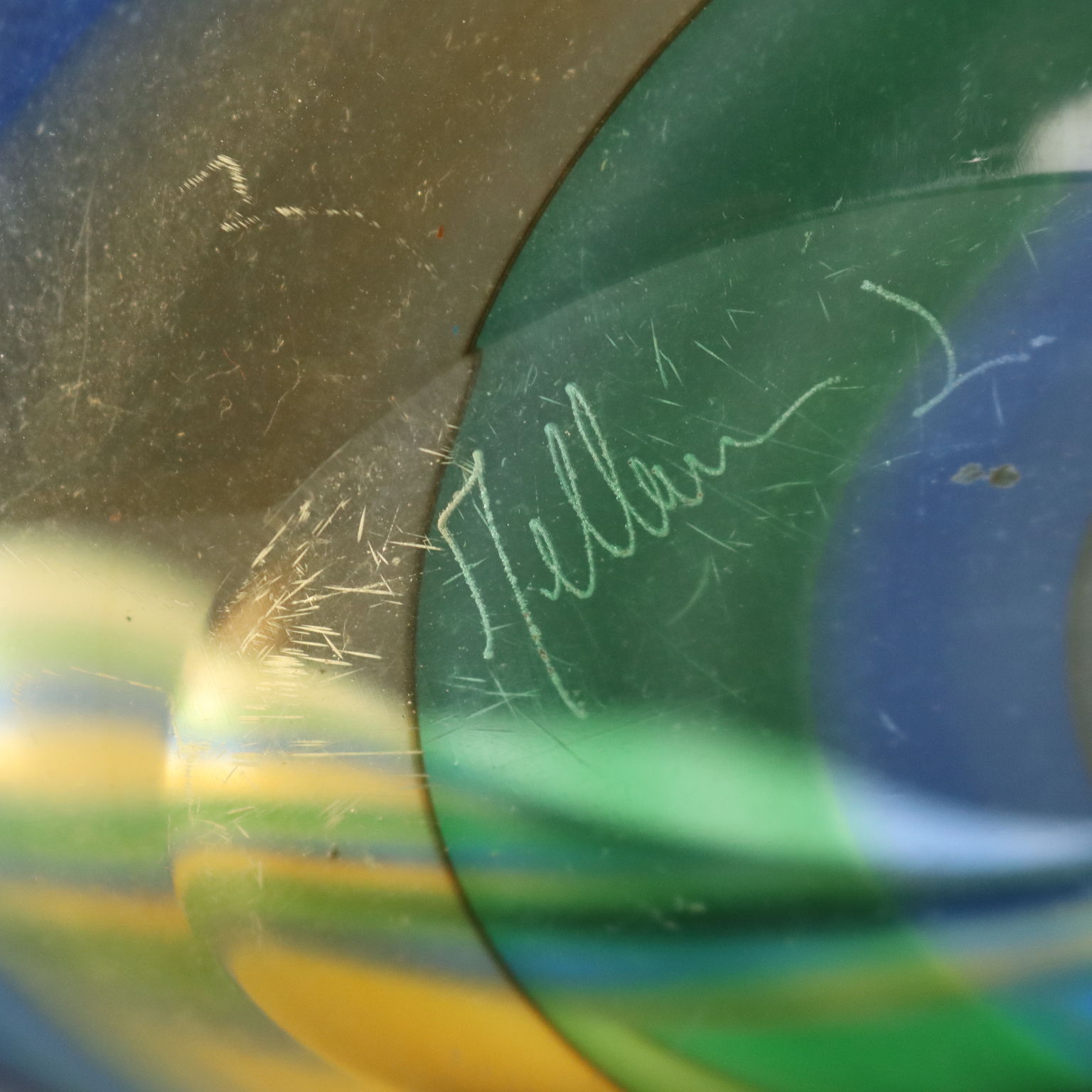 Centrotavola di forma irregolare allungata in vetro di Murano nei colori del blu, verde e giallo. Sotto la base firma del designer non identificata.