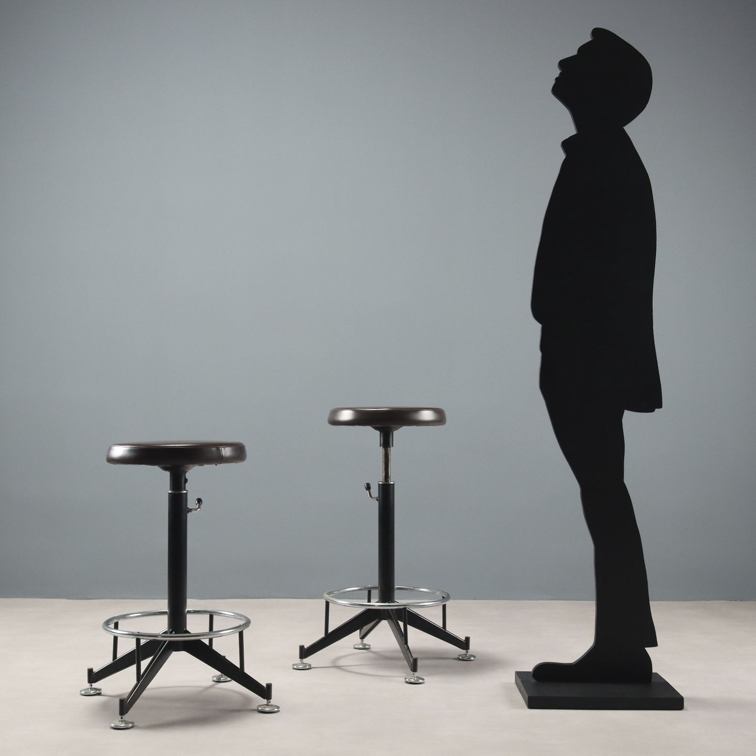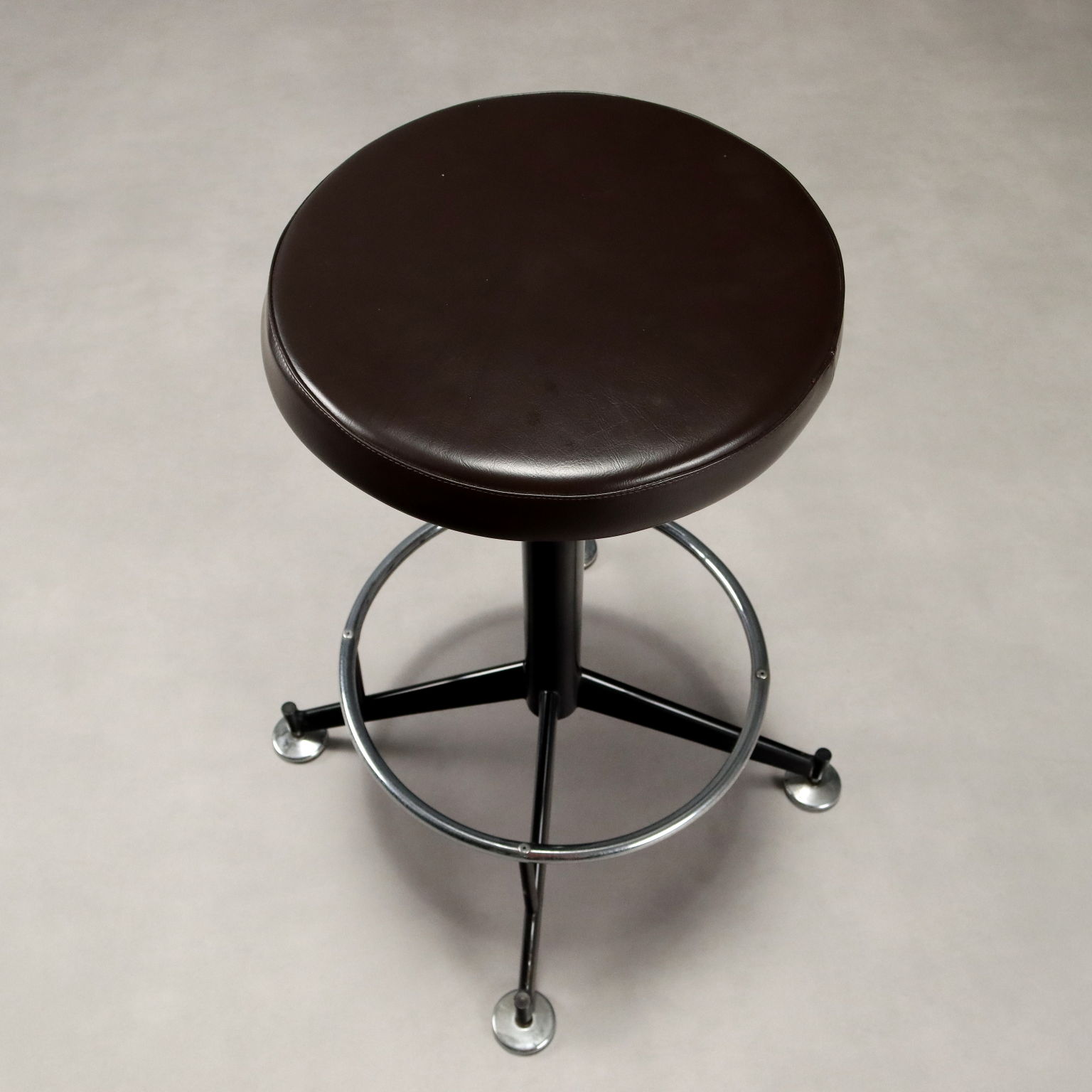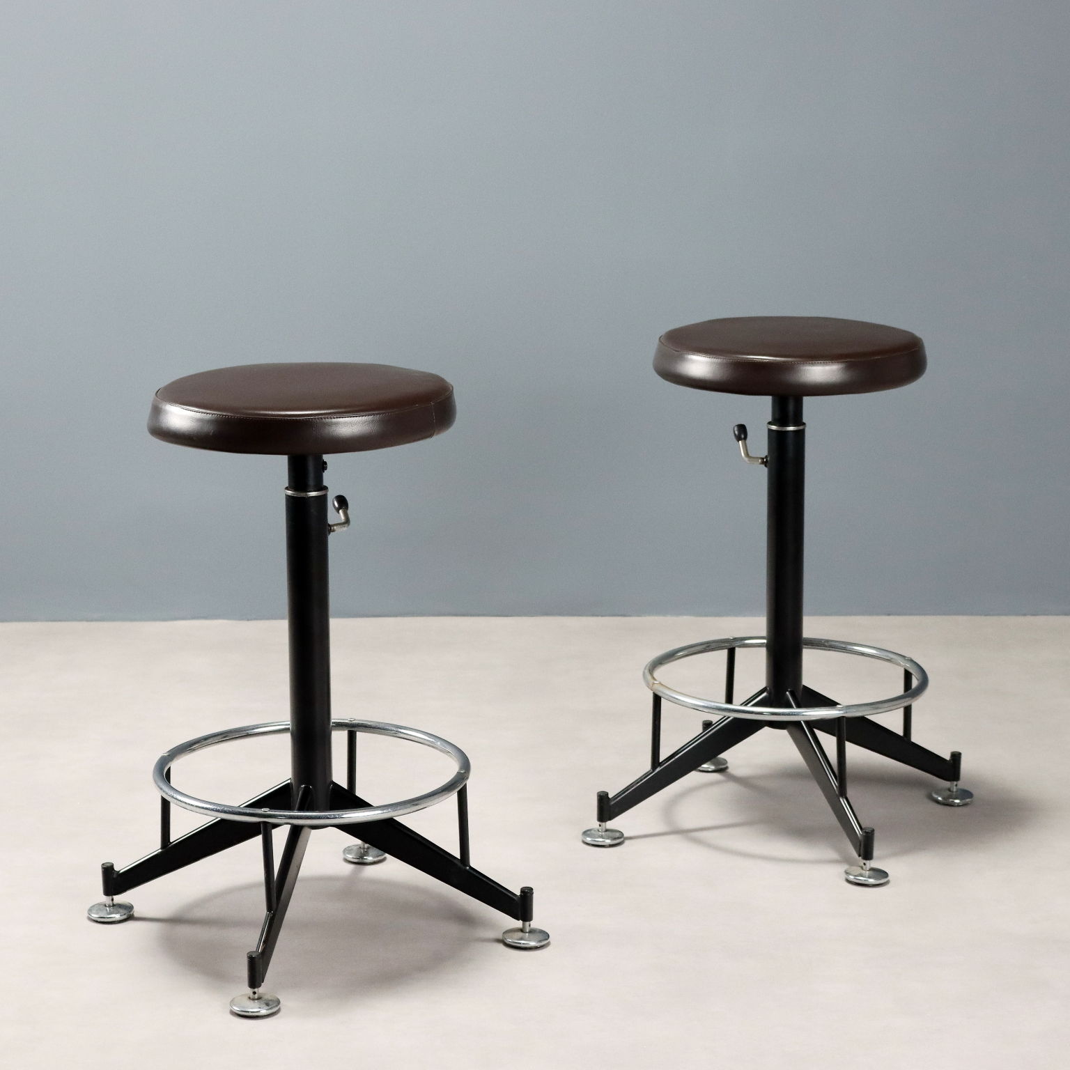 Coppia di sgabelli vintage ad altezza regolabile con struttura in metallo smaltato nero e seduta in similpelle marrone.