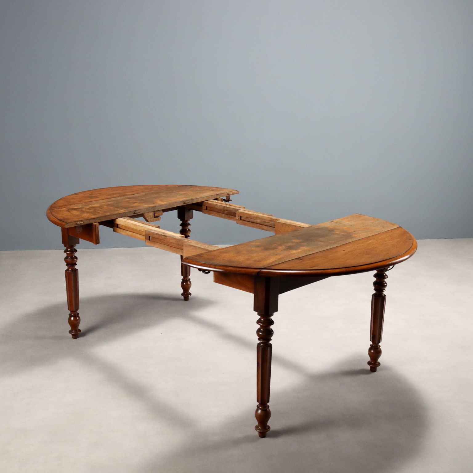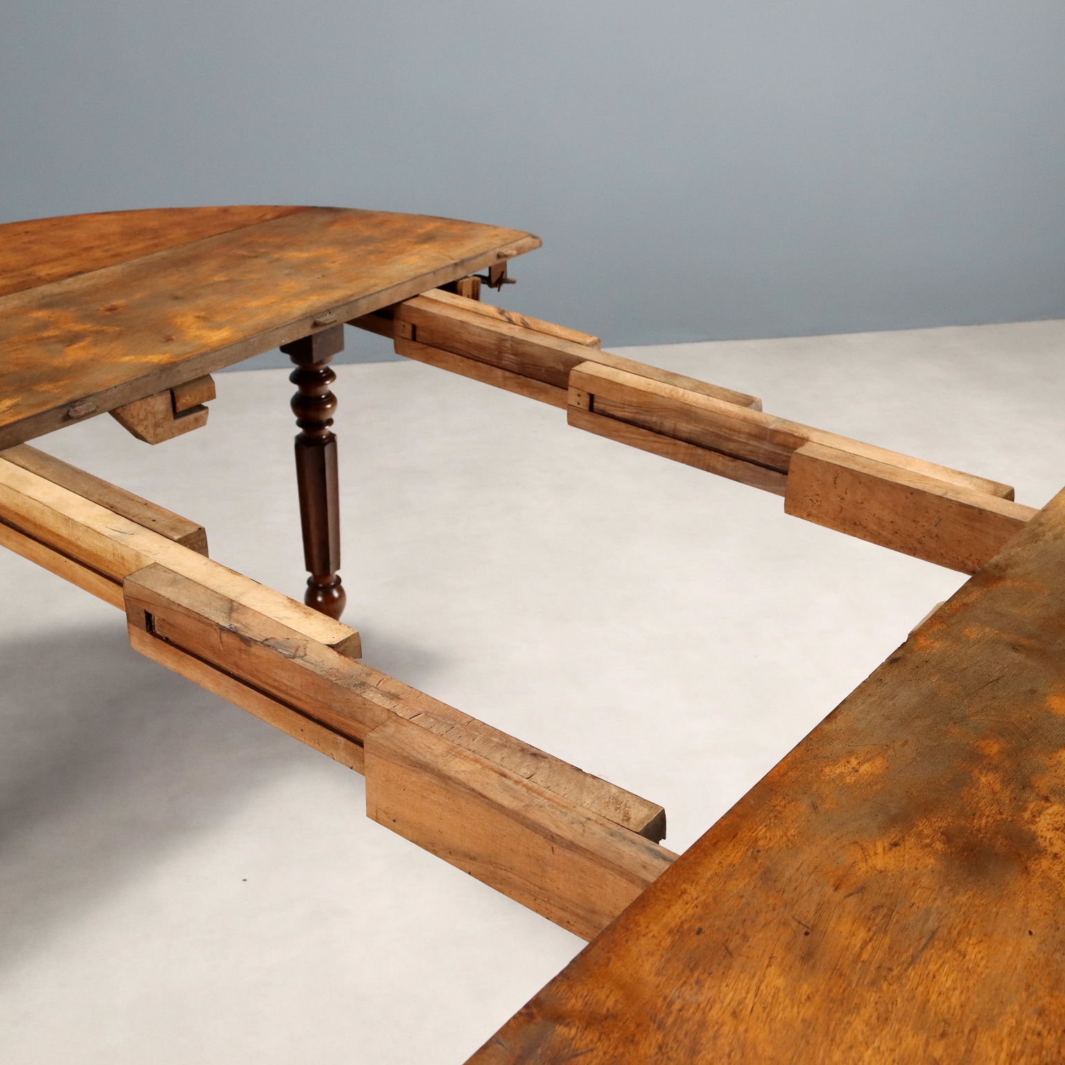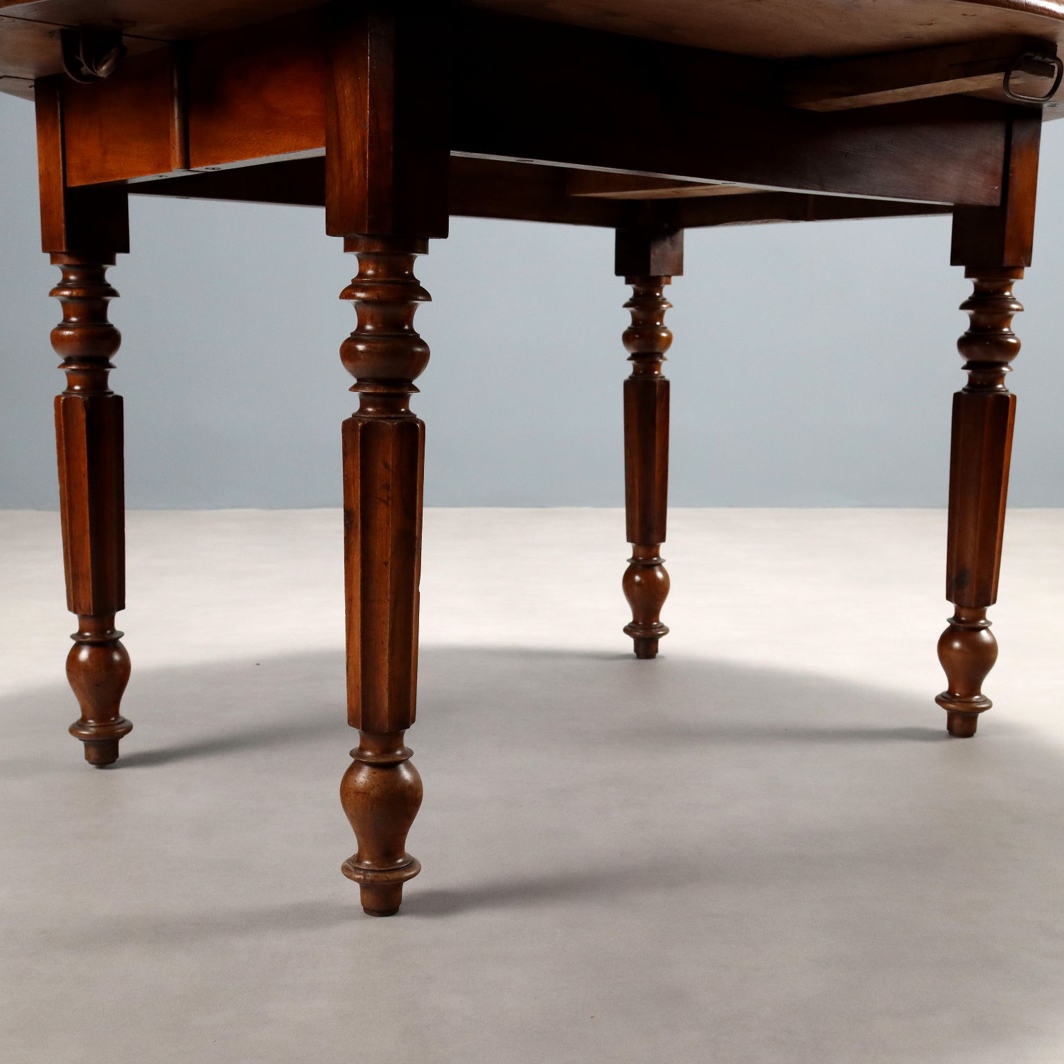 Tavolo a bandelle in noce allungabile, sorretto da quattro gambe tornite e sgorbiate. Prolunghe mancanti. Italia, fine XIX Secolo.