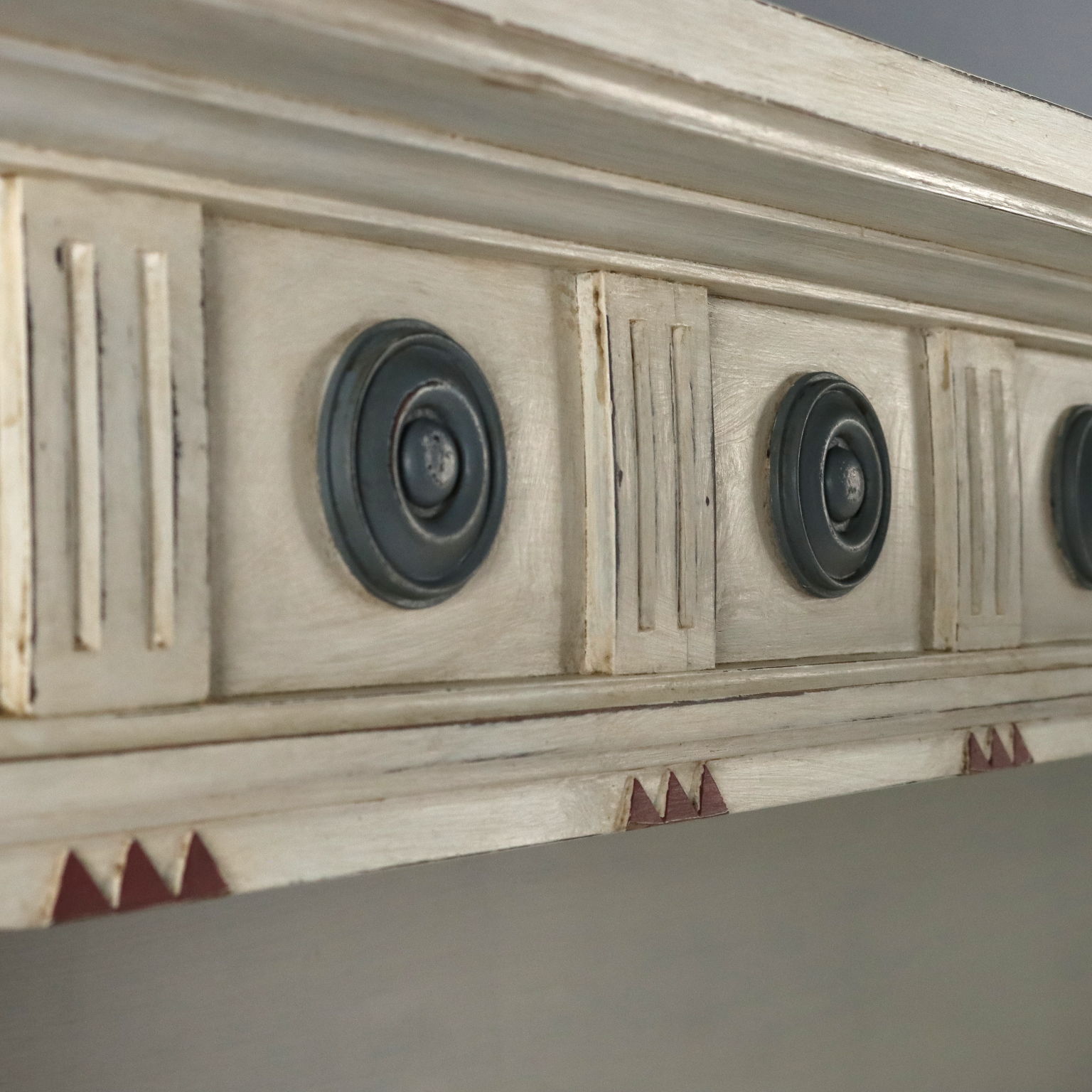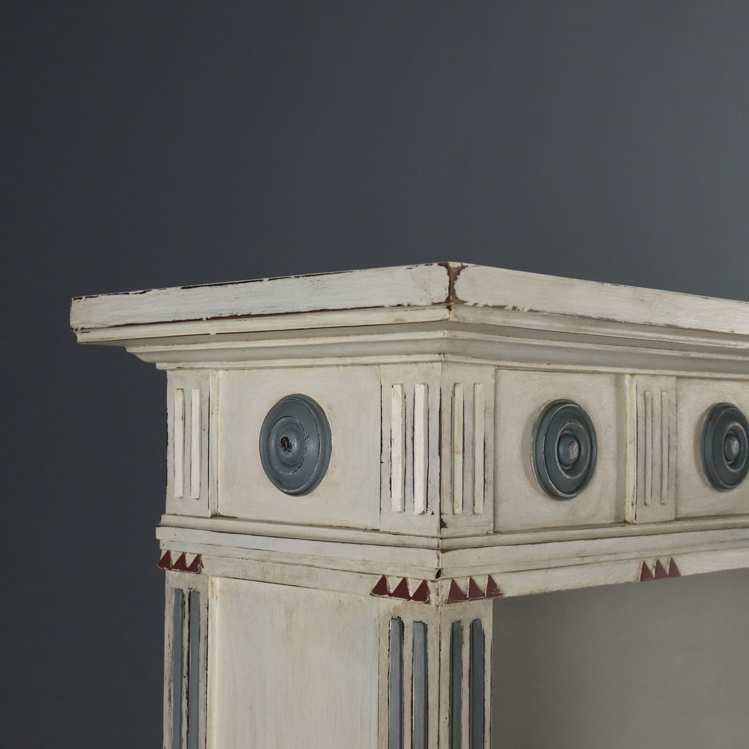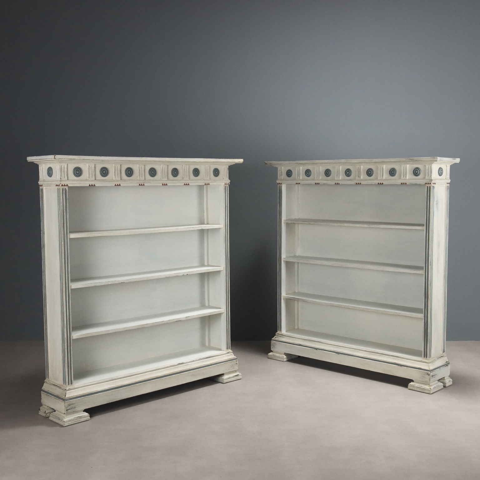 Coppia di librerie a giorno in stile, in noce, rivisitate e dipinte. Quattro ripiani, piedi a mensola intagli nel cappello. Italia, inizio XX Secolo.