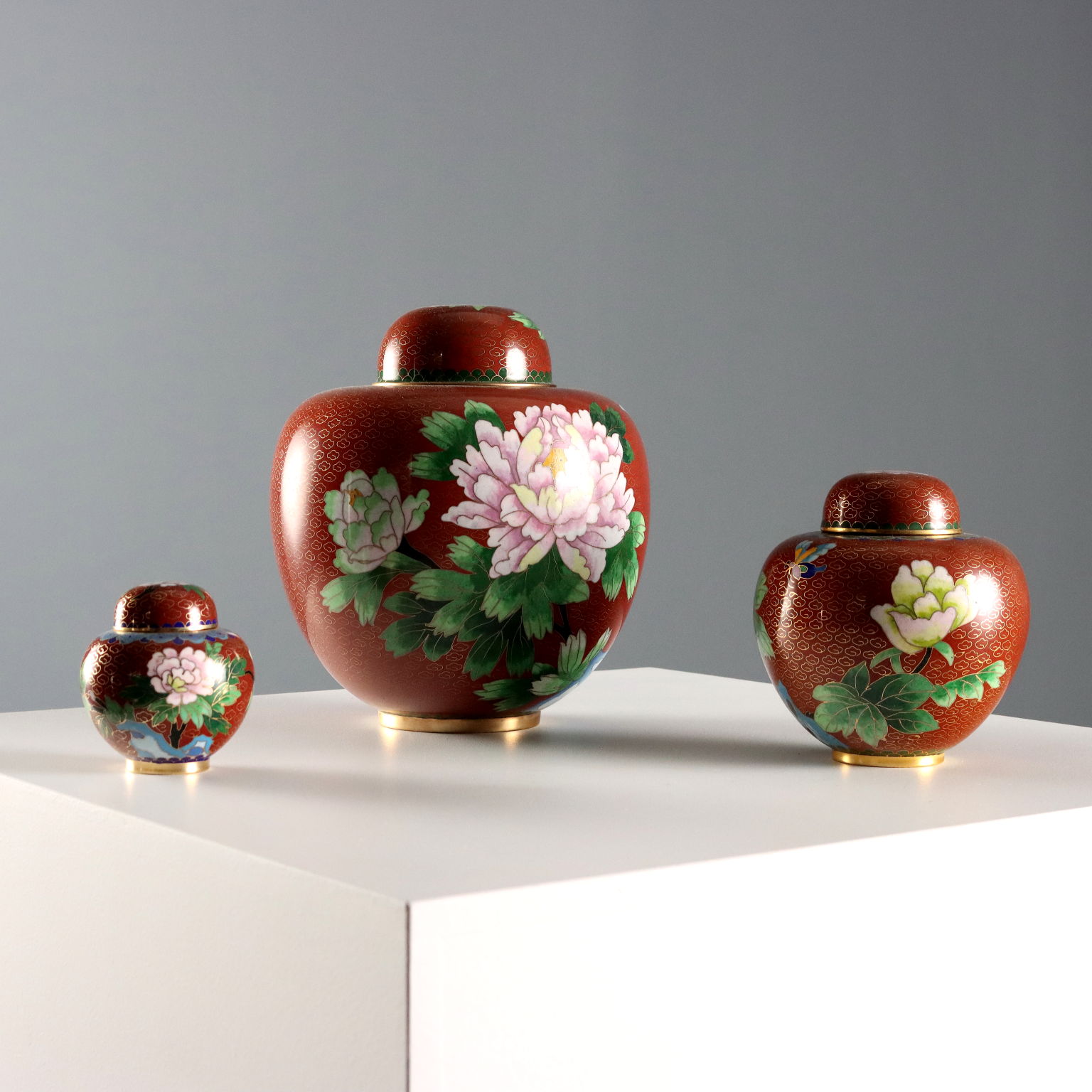 Tris di vasi cloisonné con decori policromi a rametti di fiori, peonie e farfalle.