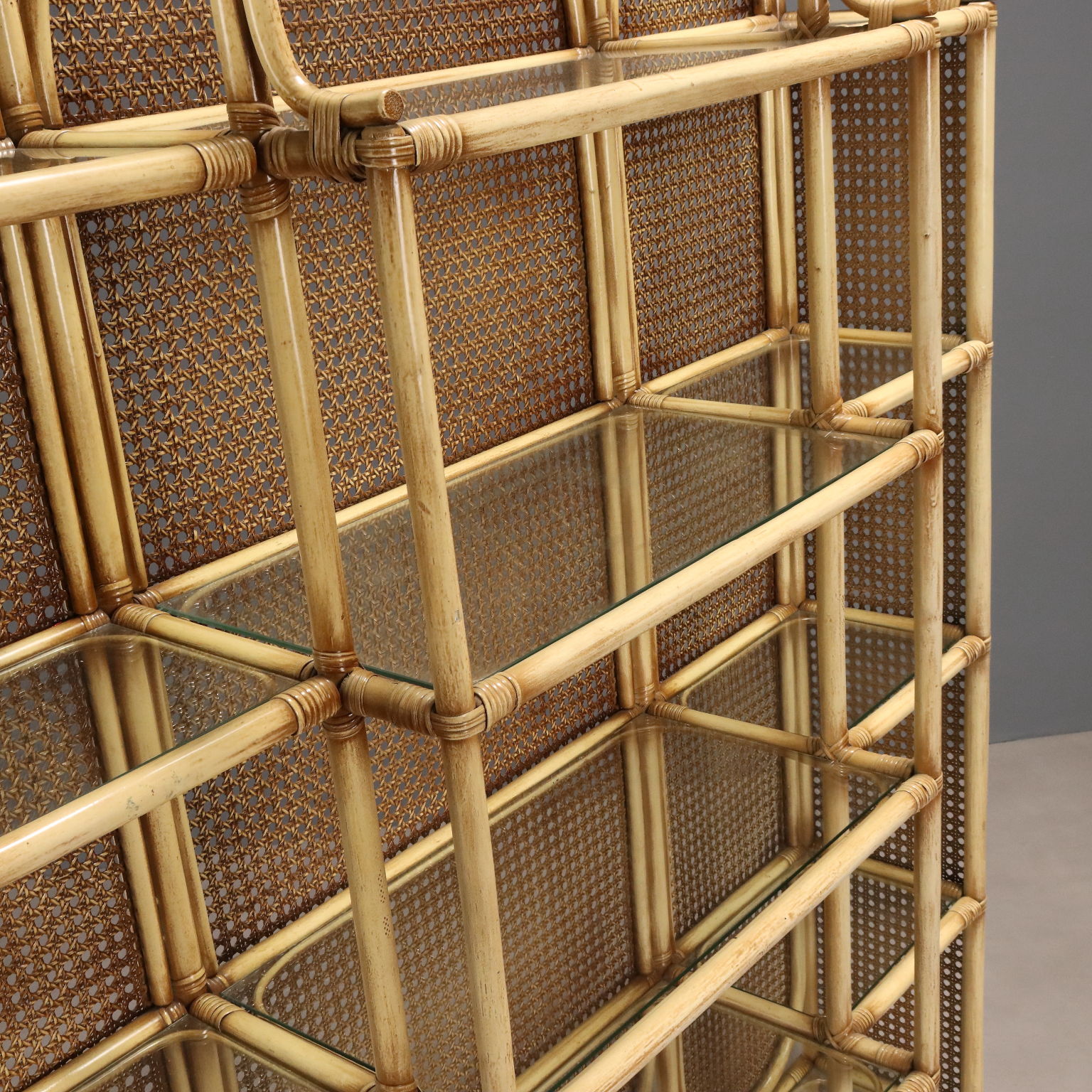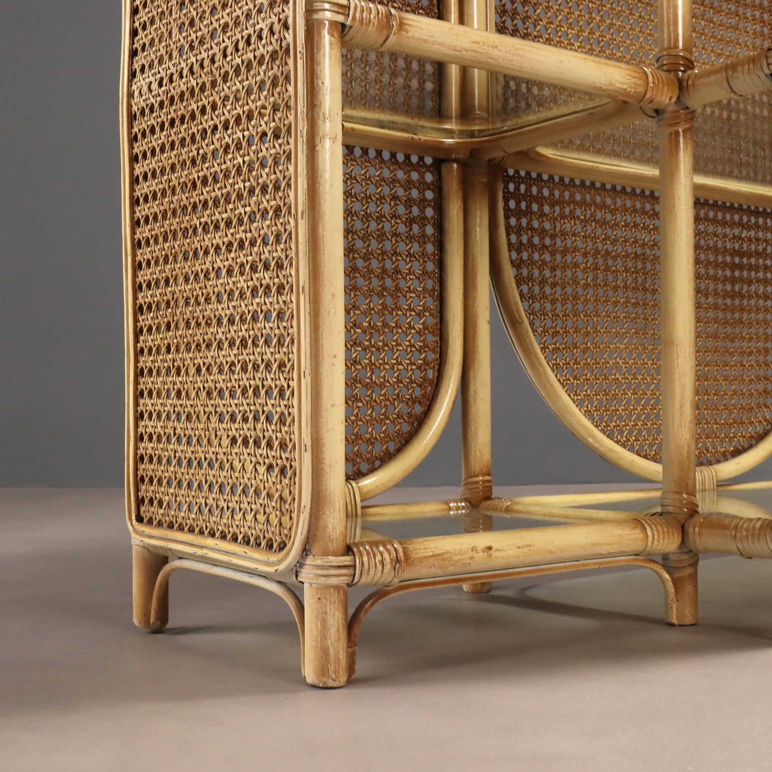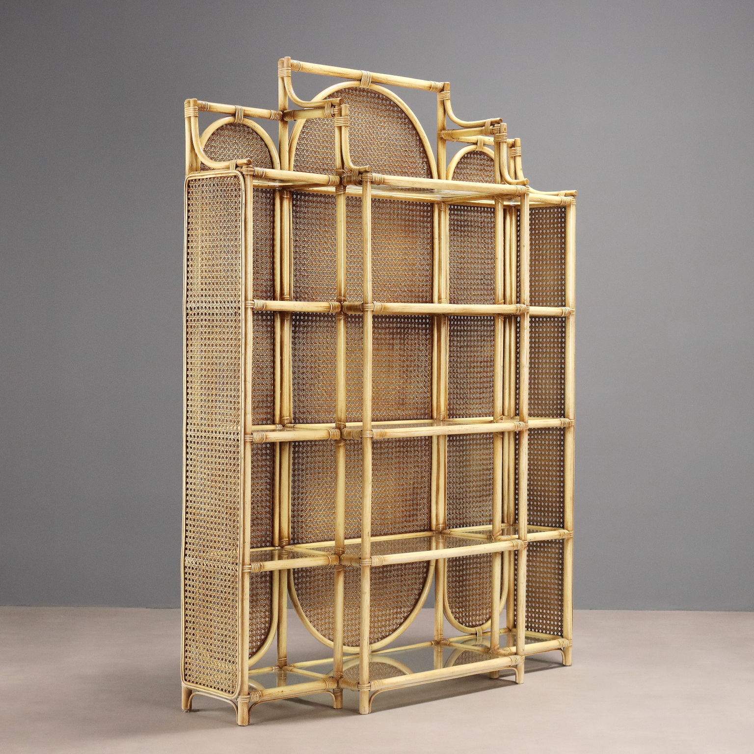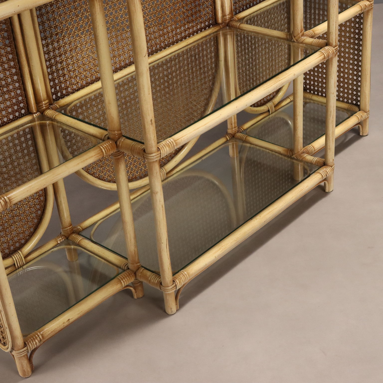 Libreria vintage a tre campate con struttura in bambù, fianchi e fondo in vimini, ripiani in vetrò fumè.