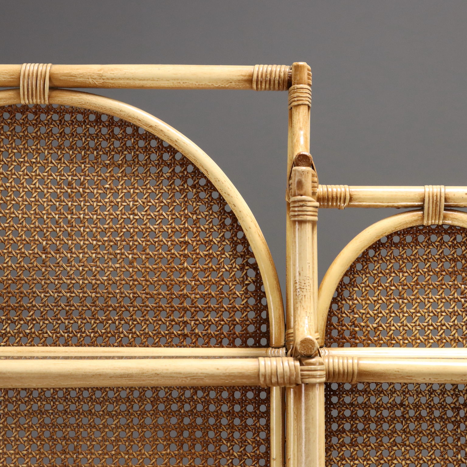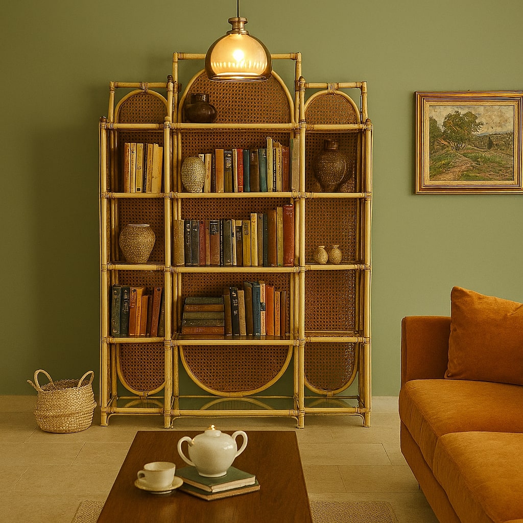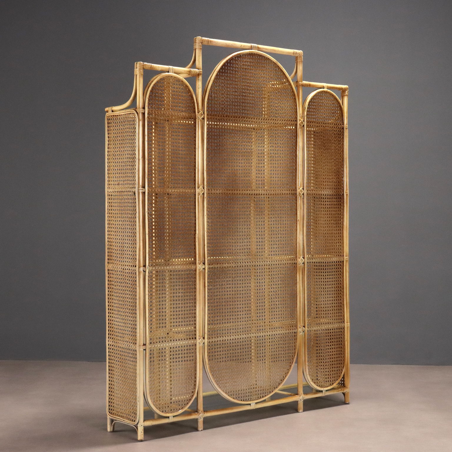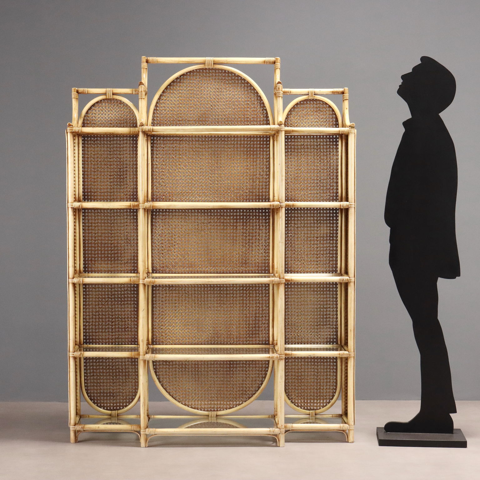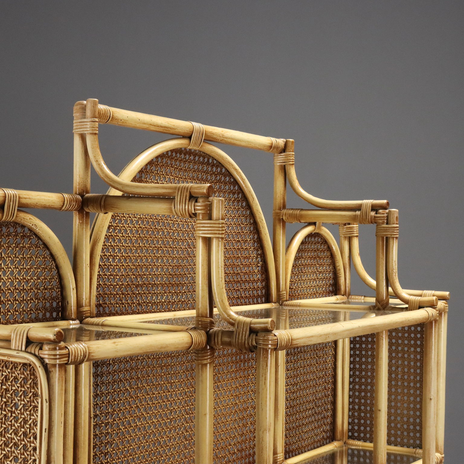 Libreria vintage a tre campate con struttura in bambù, fianchi e fondo in vimini, ripiani in vetrò fumè.