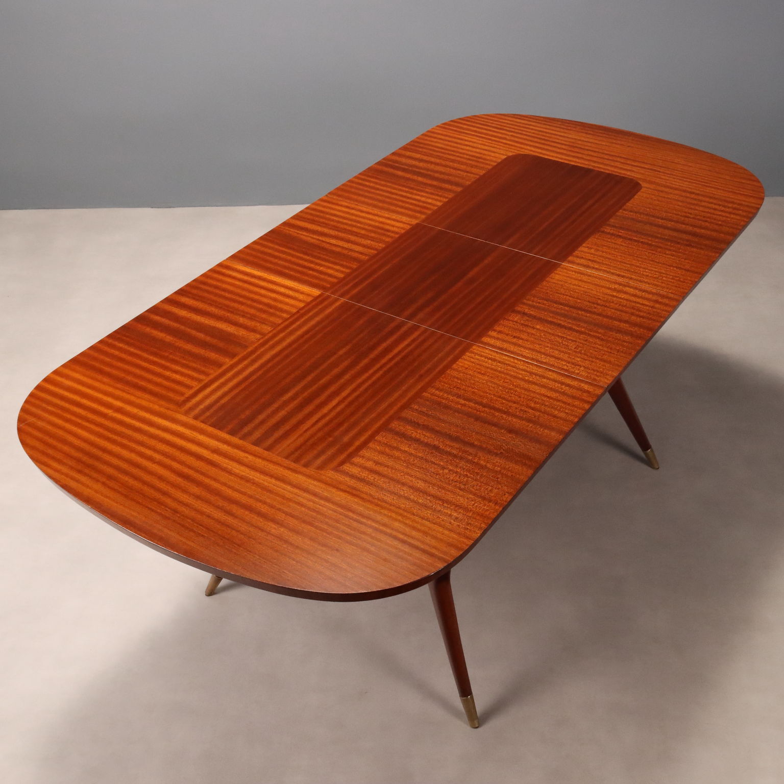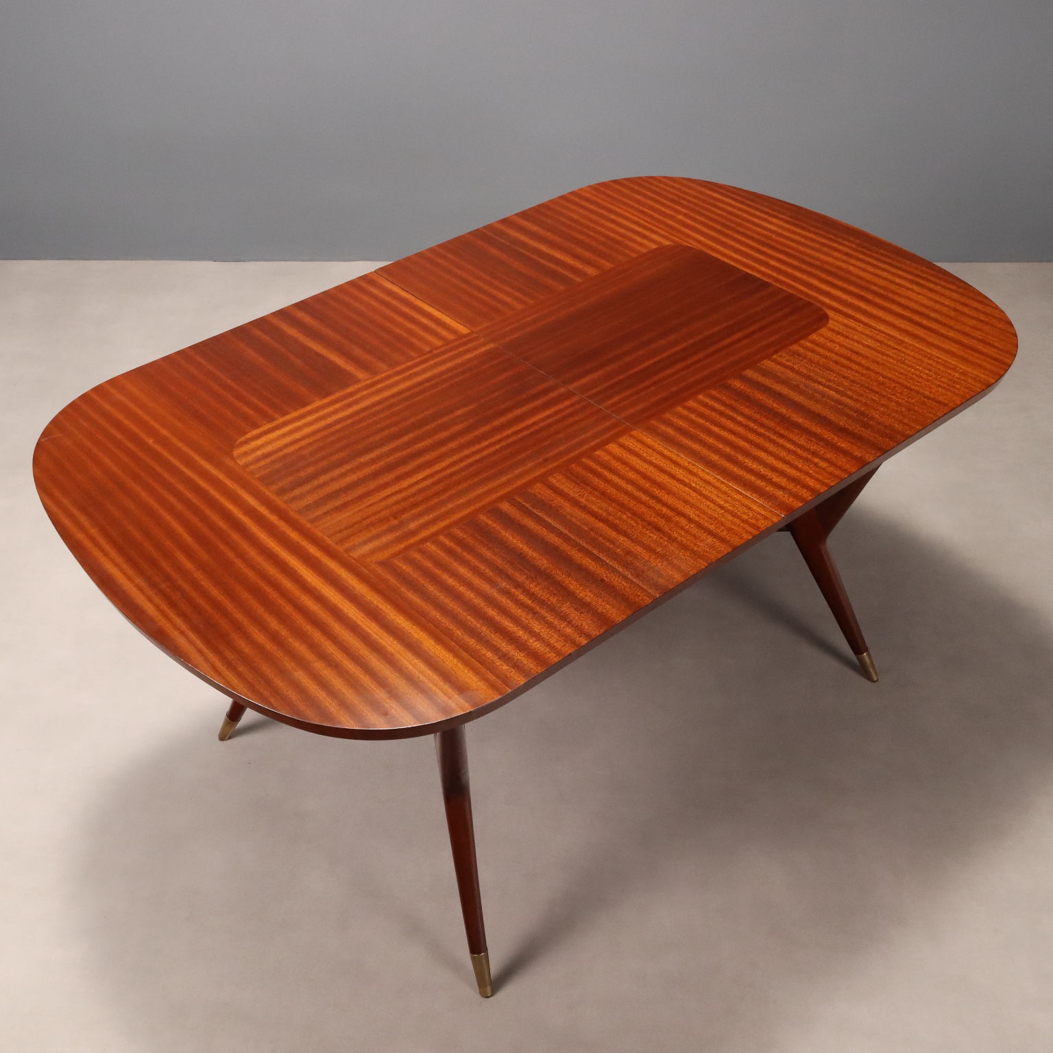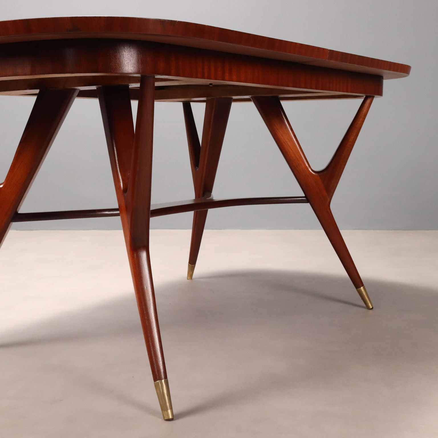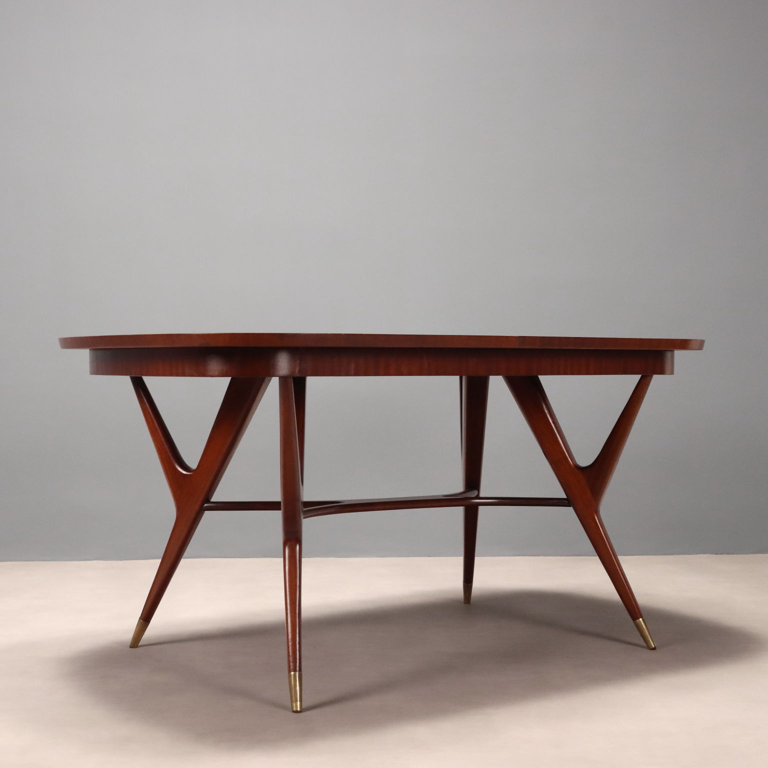 Elegante tavolo da pranzo di manifattura italiana del XX secolo con piano ovale allungabile e gambe dalla forma sinuosa che terminano con puntali in ottone; in legno impiallacciato mogano.