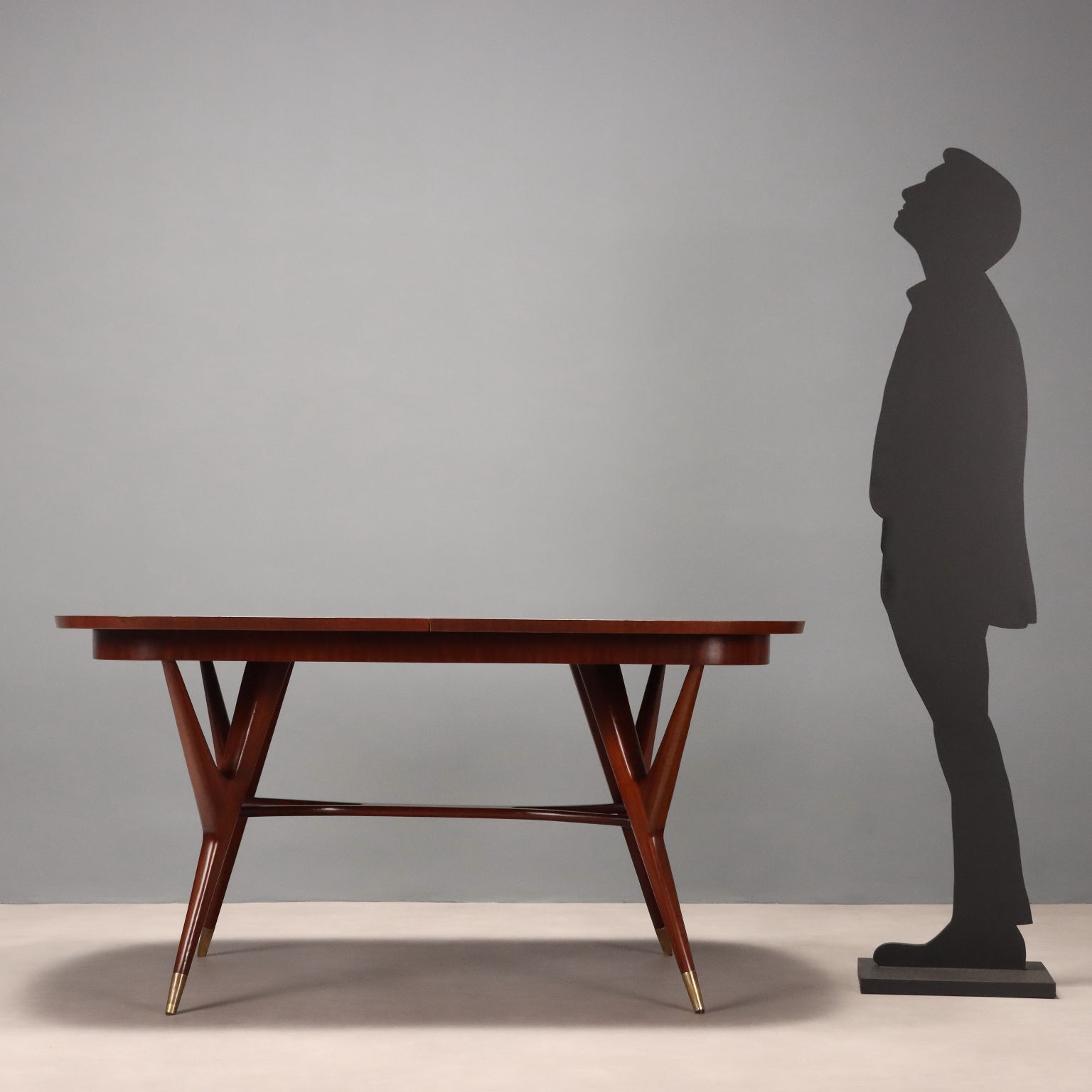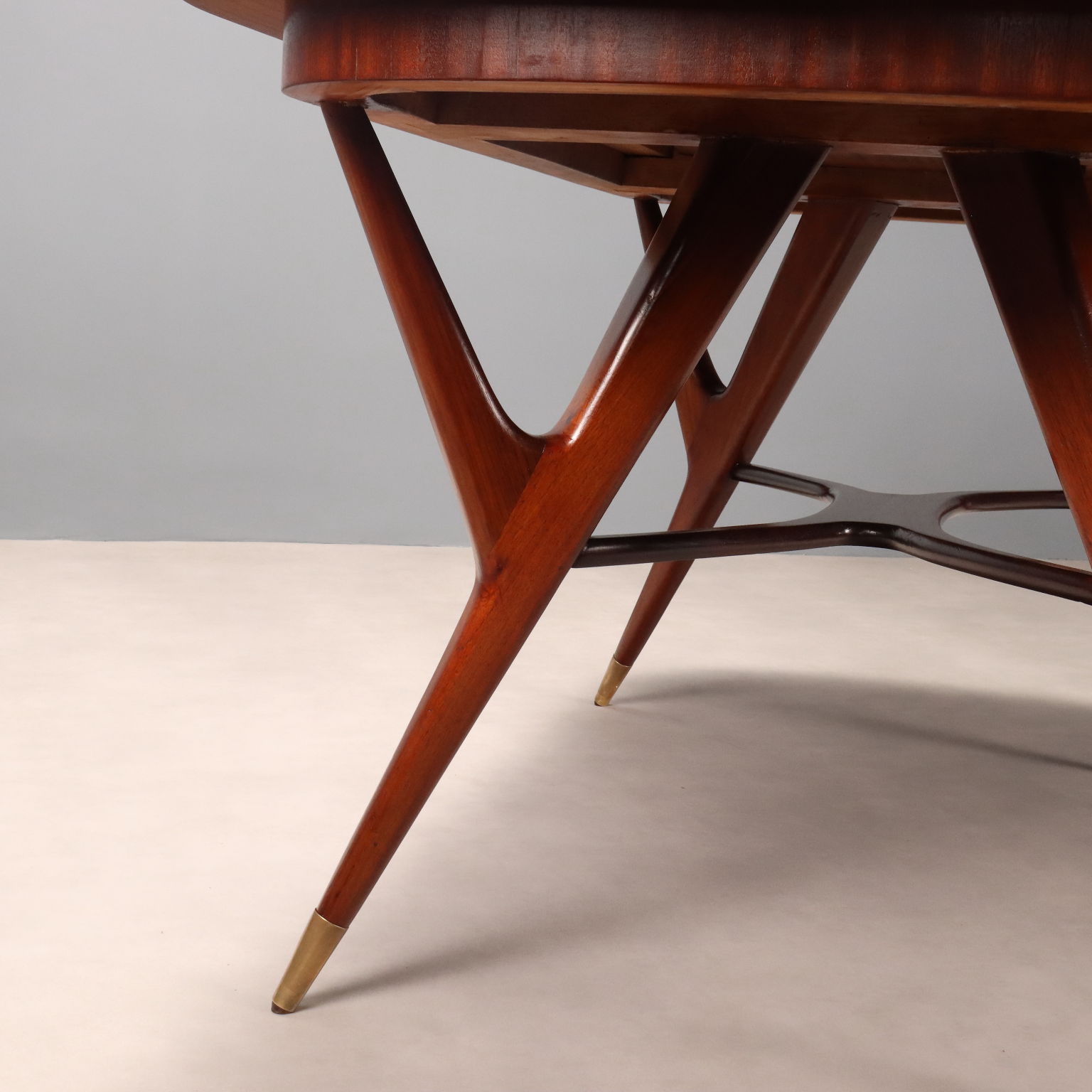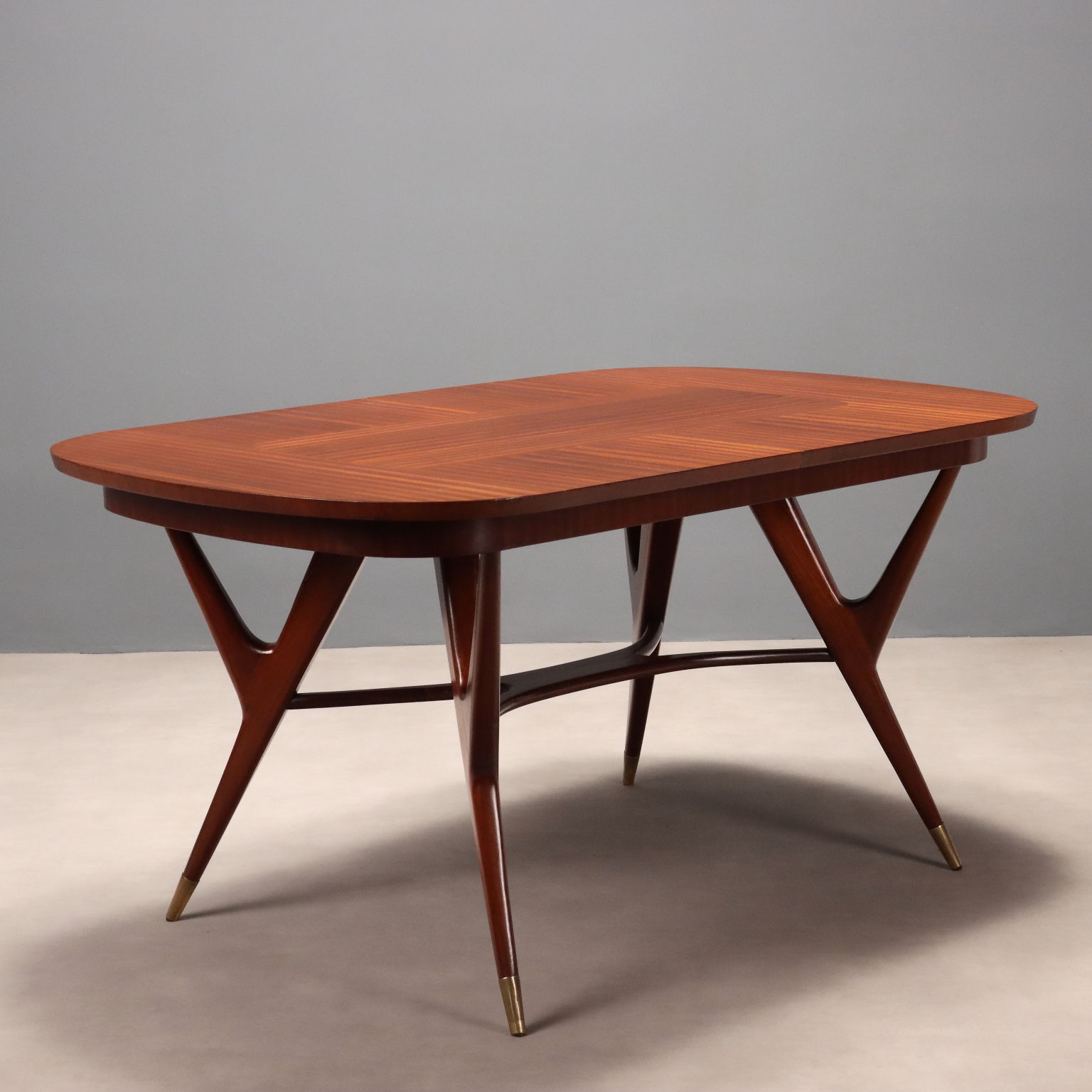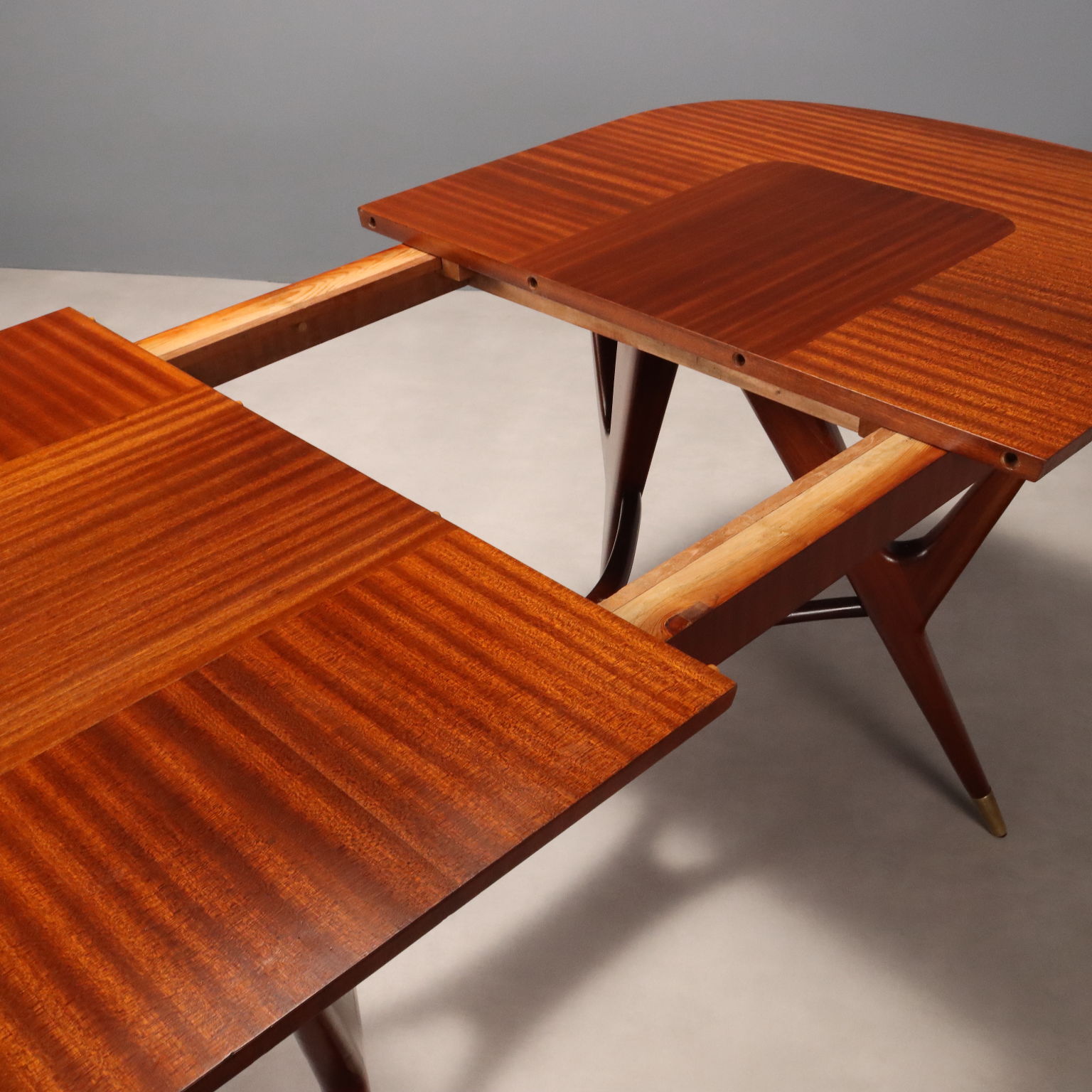 Elegante tavolo da pranzo di manifattura italiana del XX secolo con piano ovale allungabile e gambe dalla forma sinuosa che terminano con puntali in ottone; in legno impiallacciato mogano.