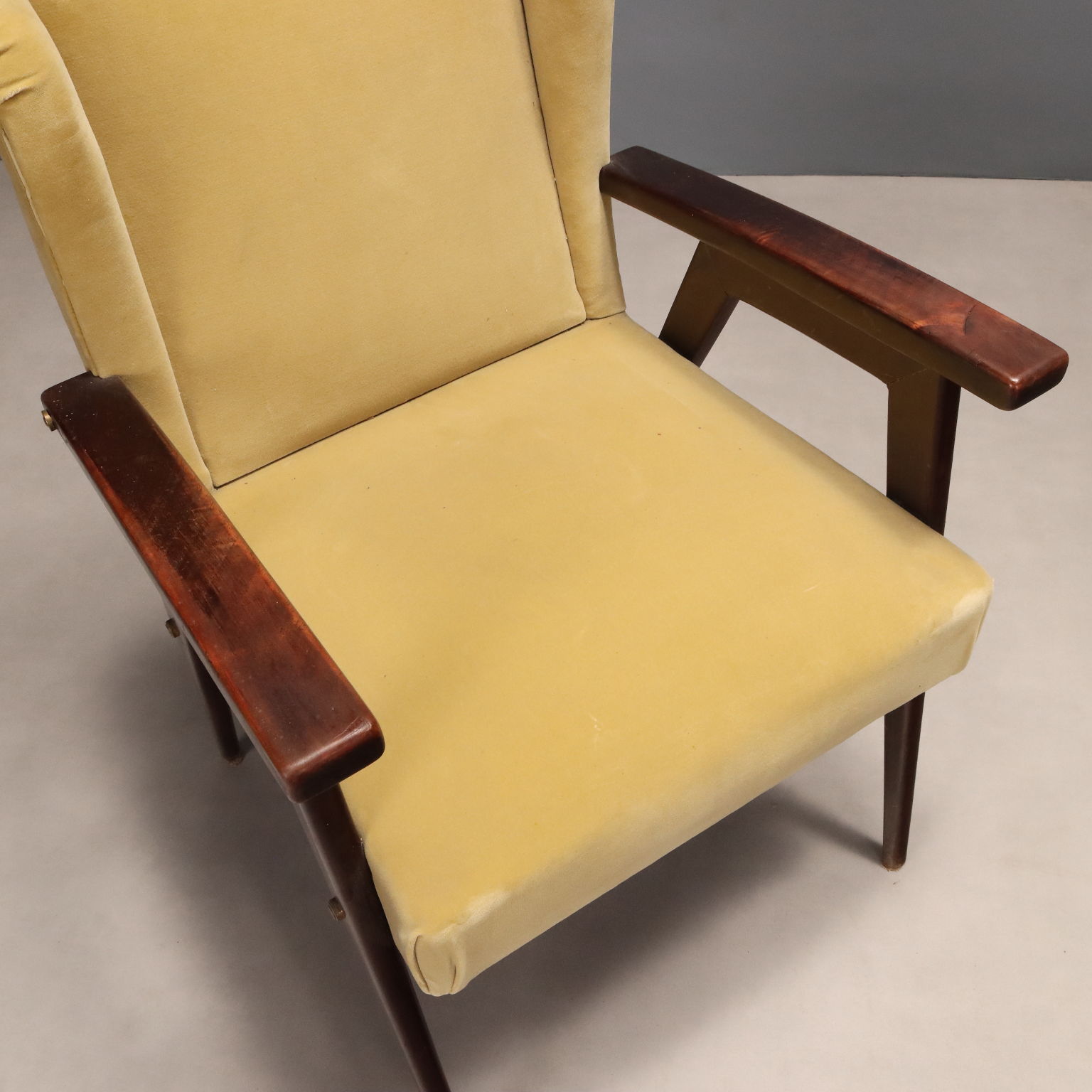 Due poltroncine vintage di manifattura italiana con struttura in legno a vista, seduta e schienale con imbottitura in espanso e rivestimento originale del periodo nei toni del giallo. Sedute che si prestano ad essere restaurate nella parte lignea e rinnovate nel tessuto scegliendo tra le numerose proposte presenti nei nostri magazzini.
