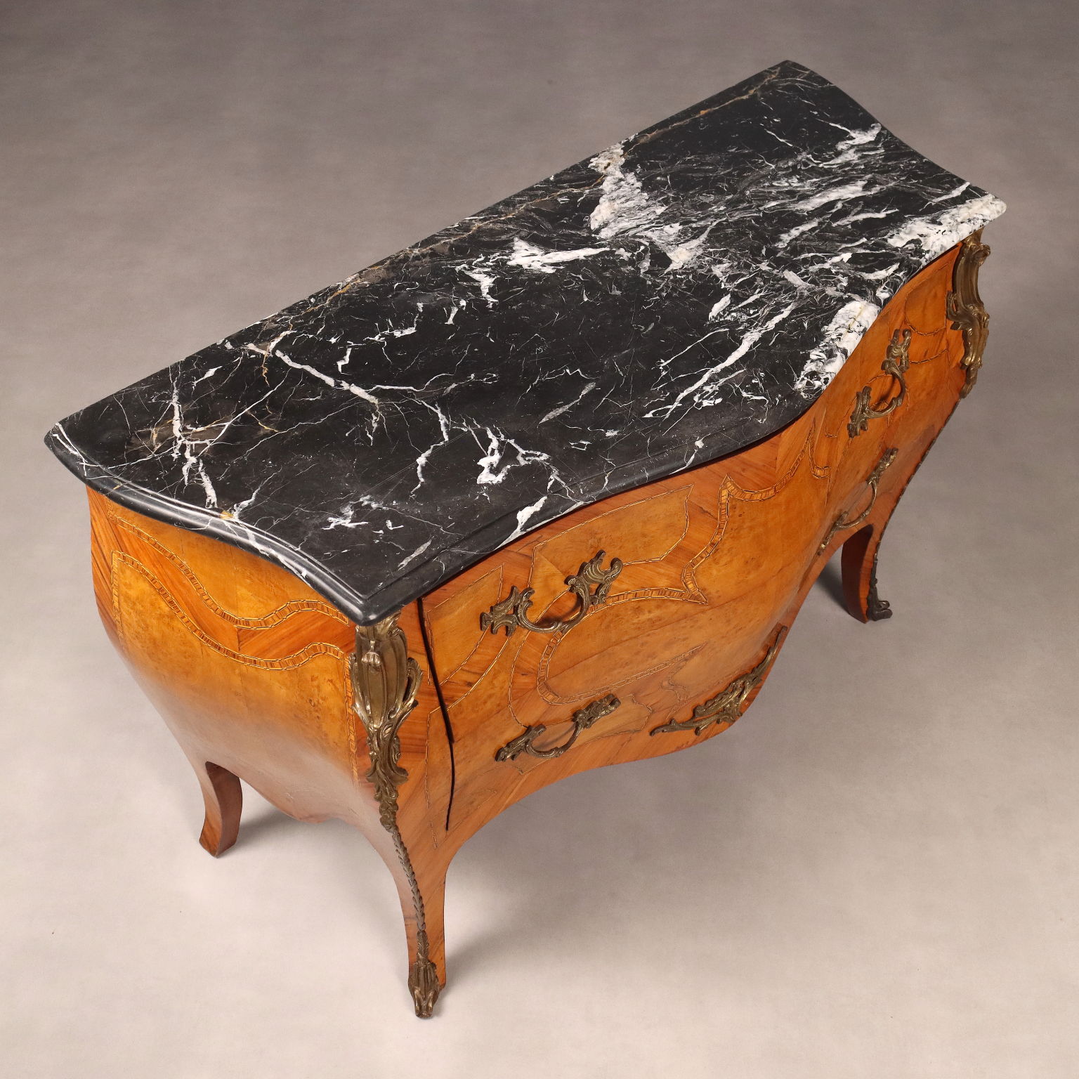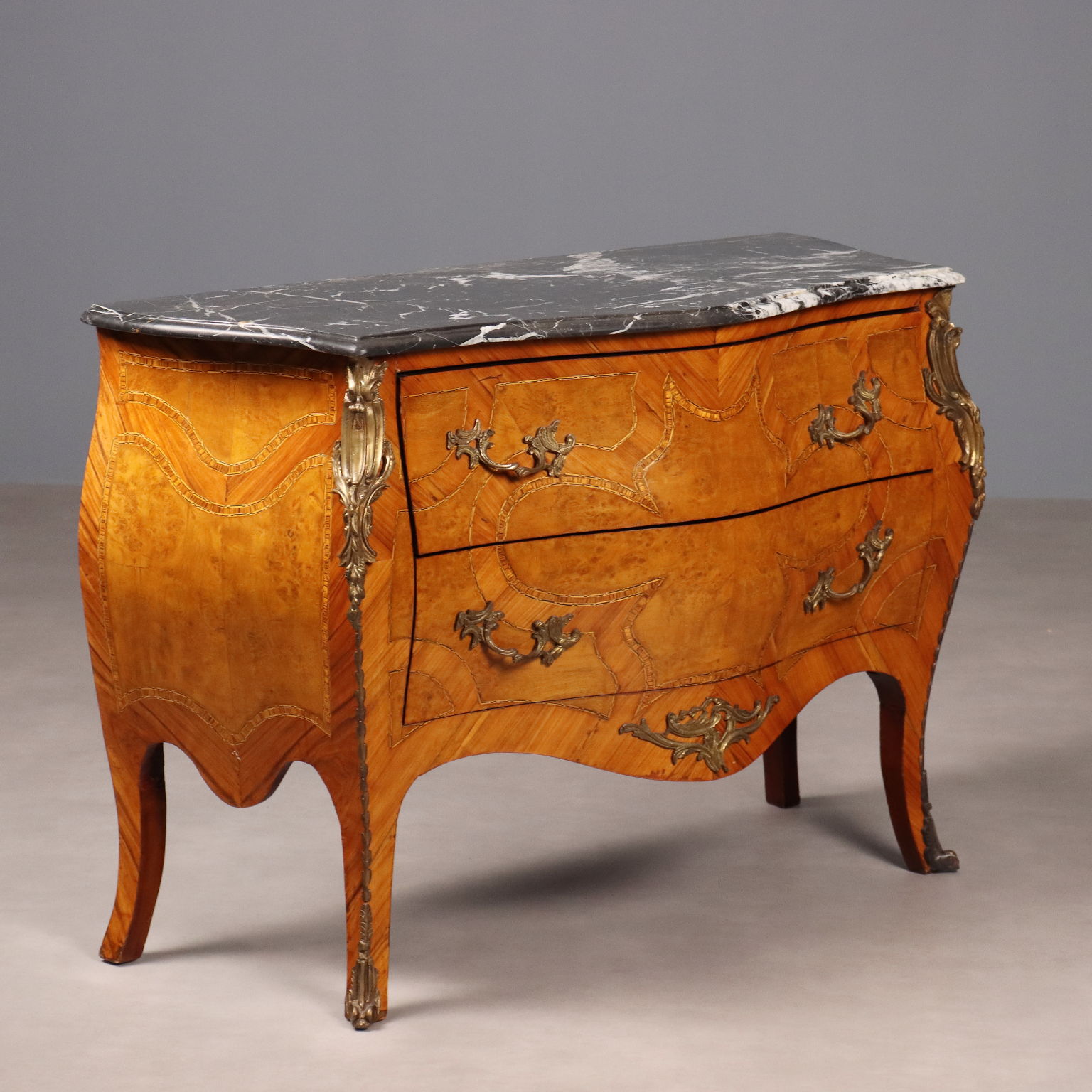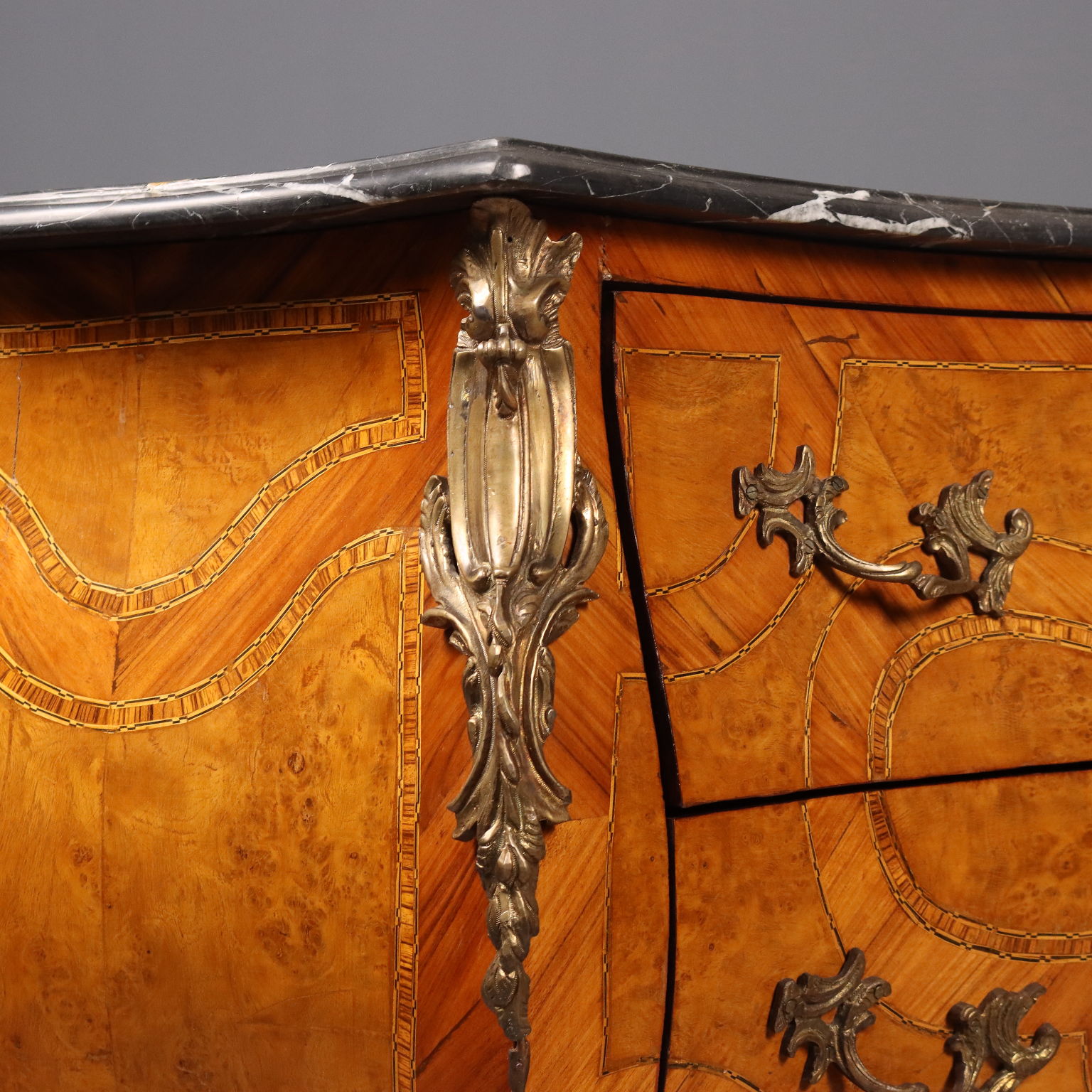 Cassettone in stile Barocchetto, impiallacciatura in bois de rose e radica di acero, filettature in essenze varie. Applicazioni e maniglie in bronzo. Piano in marmo nero. Italia, inizio XX Secolo.