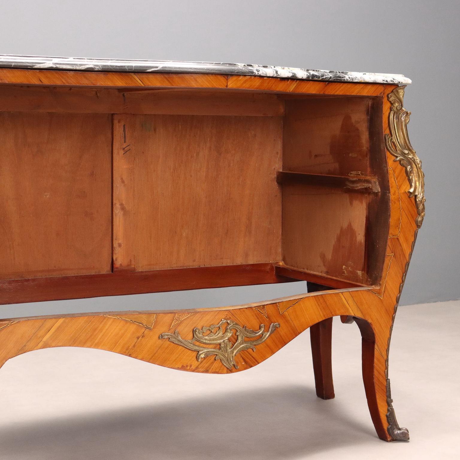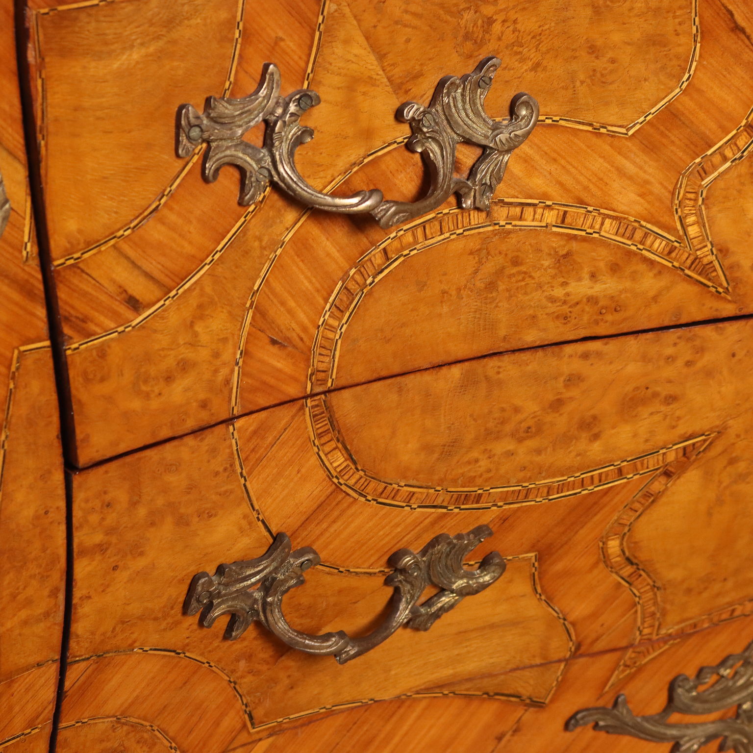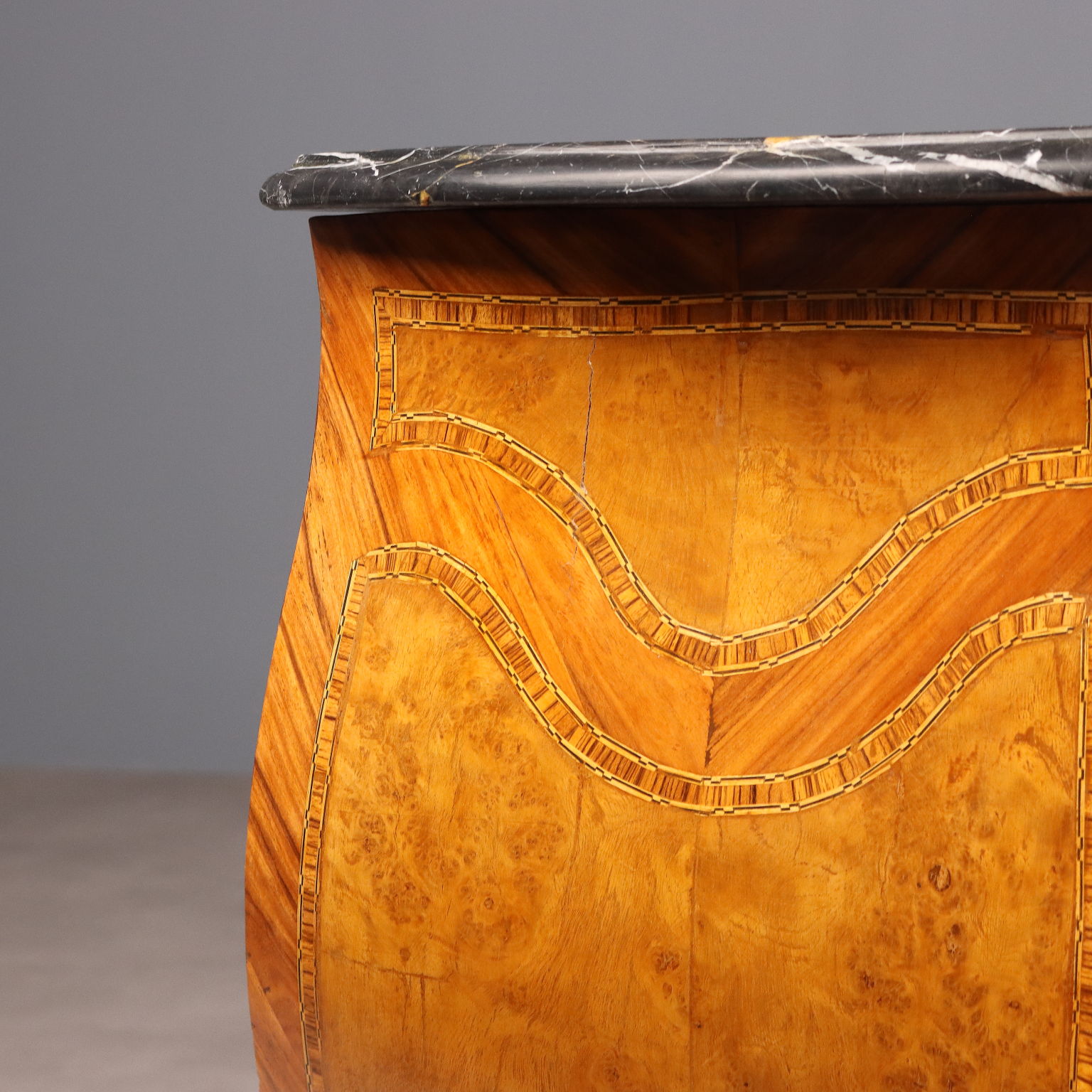 Cassettone in stile Barocchetto, impiallacciatura in bois de rose e radica di acero, filettature in essenze varie. Applicazioni e maniglie in bronzo. Piano in marmo nero. Italia, inizio XX Secolo.