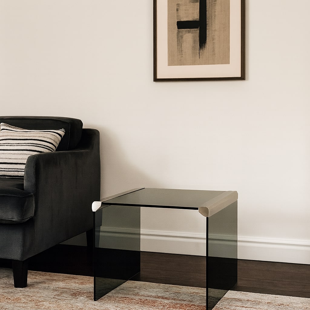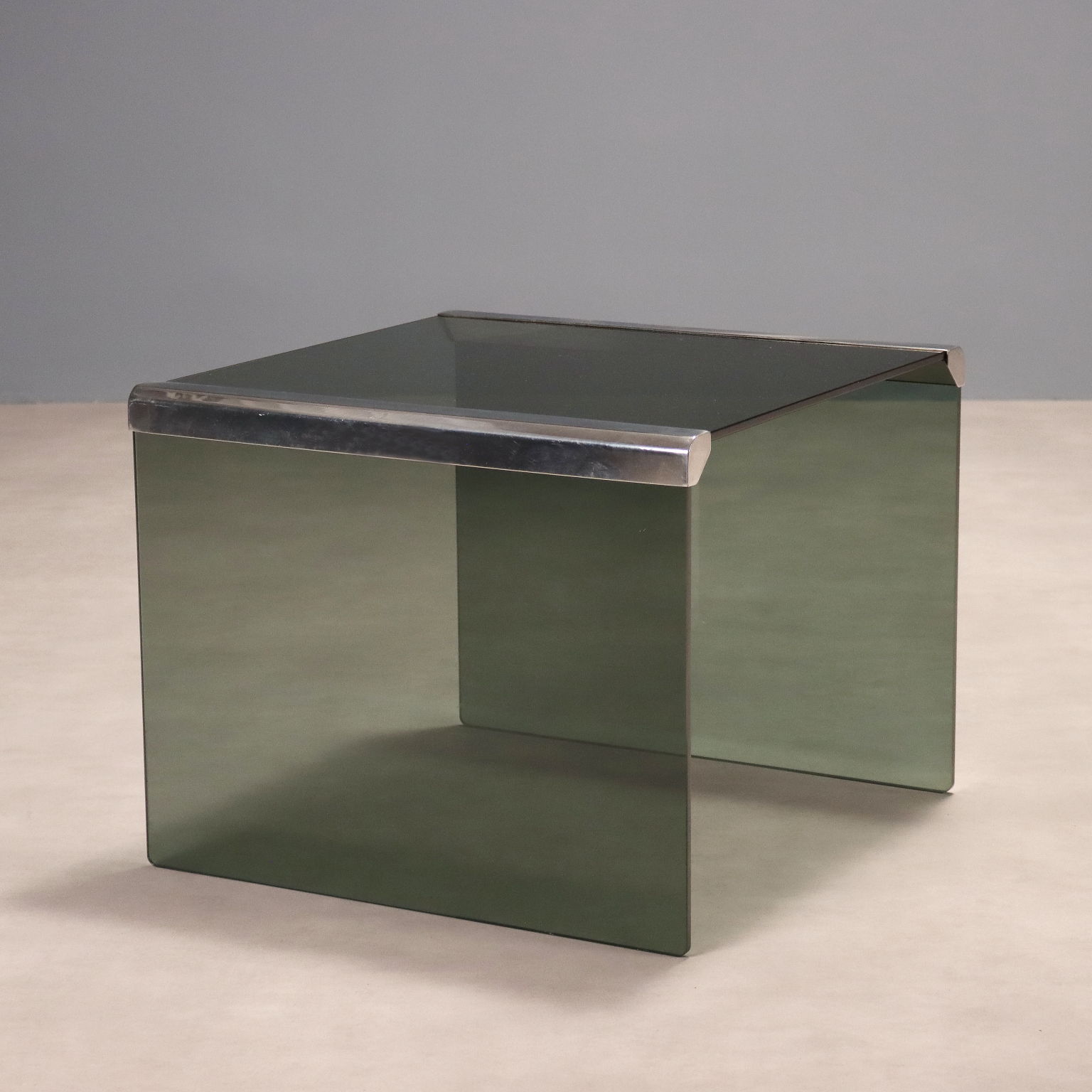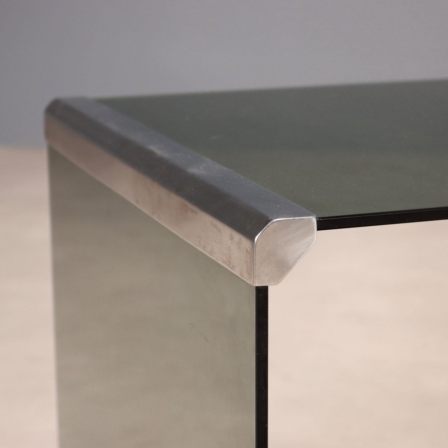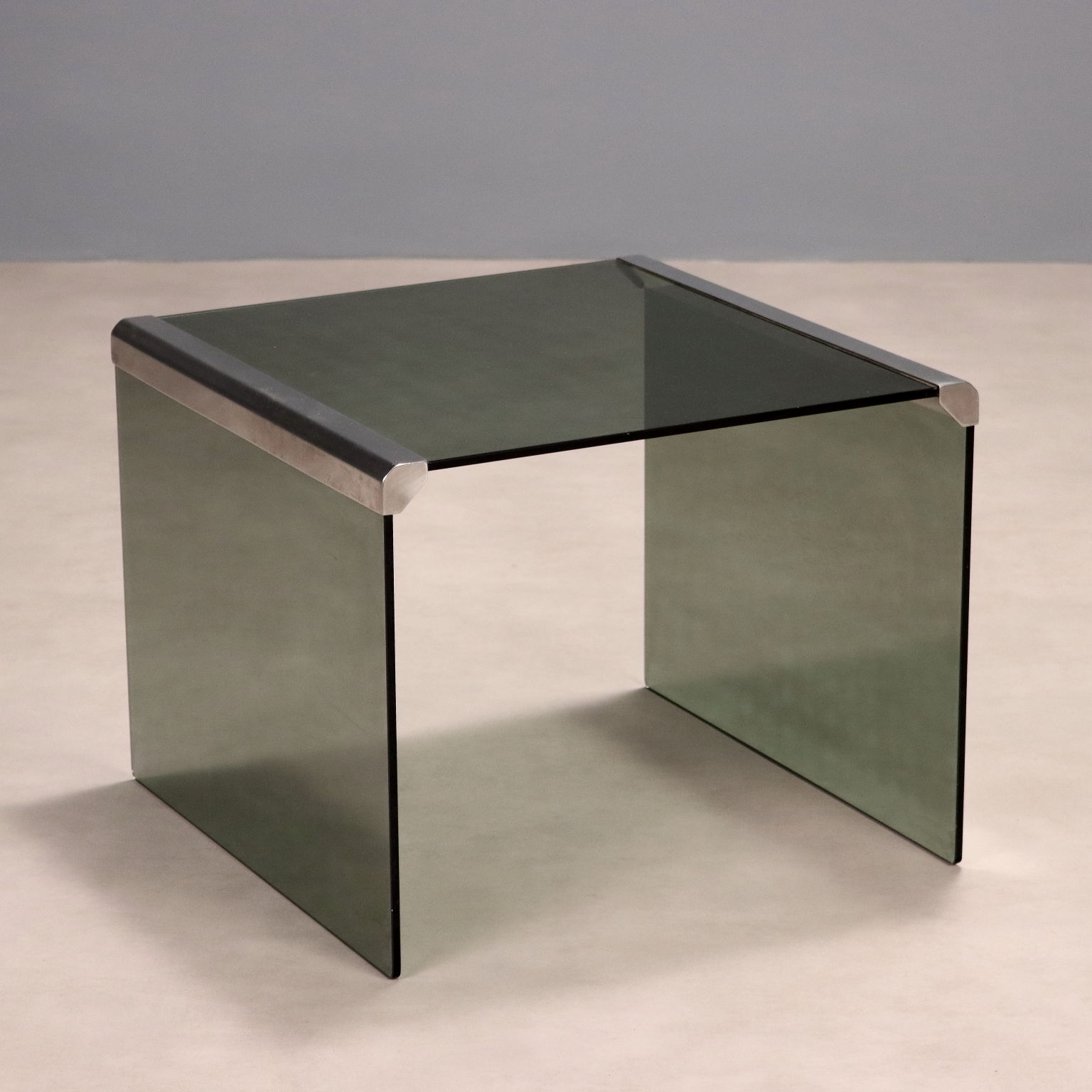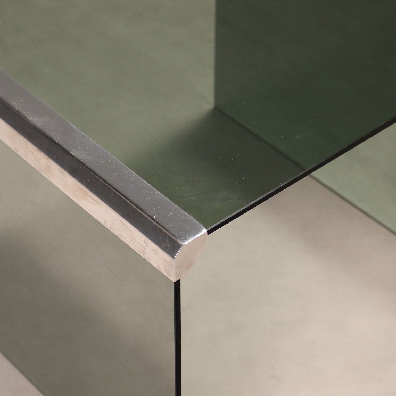 Tavolino vintage realizzato in vetro fumè con profili in ottone nichelato.