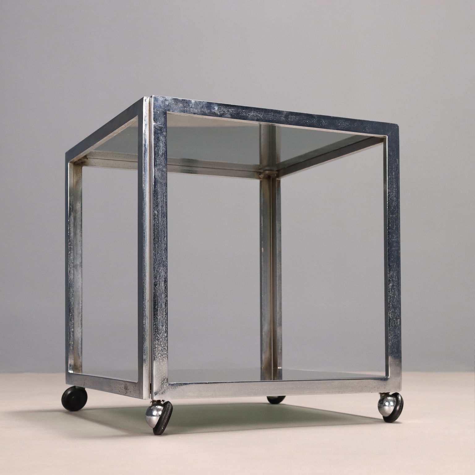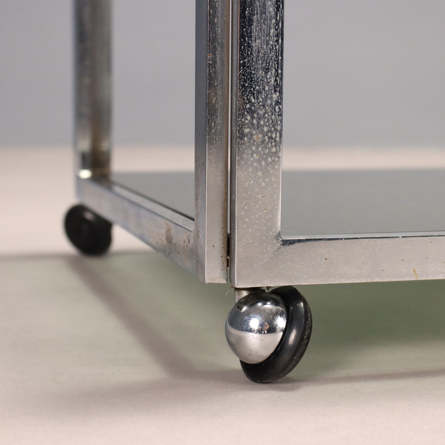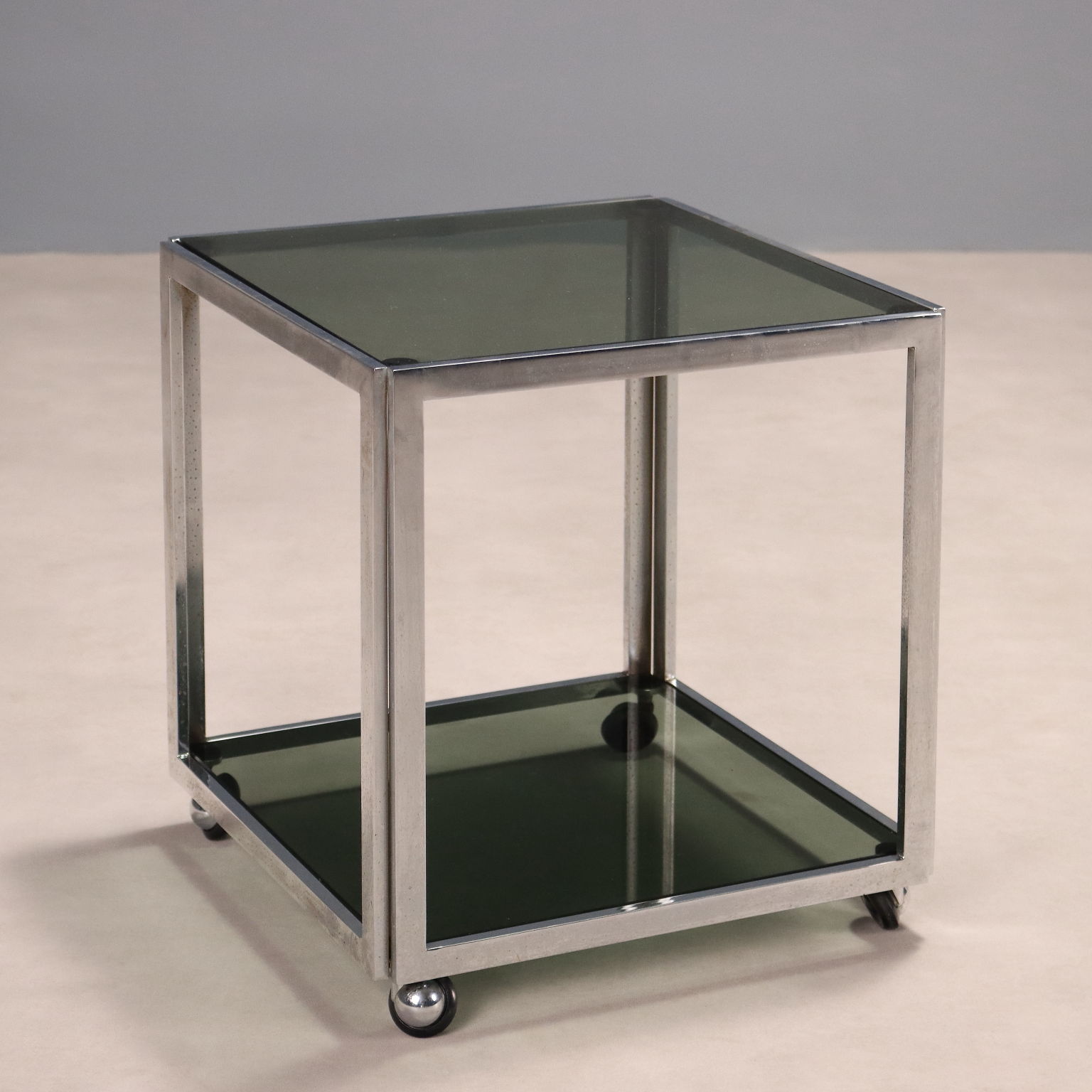 Tavolino da appoggio con struttura in metallo cromato, doppio piano in vetro fumè e rotelle.