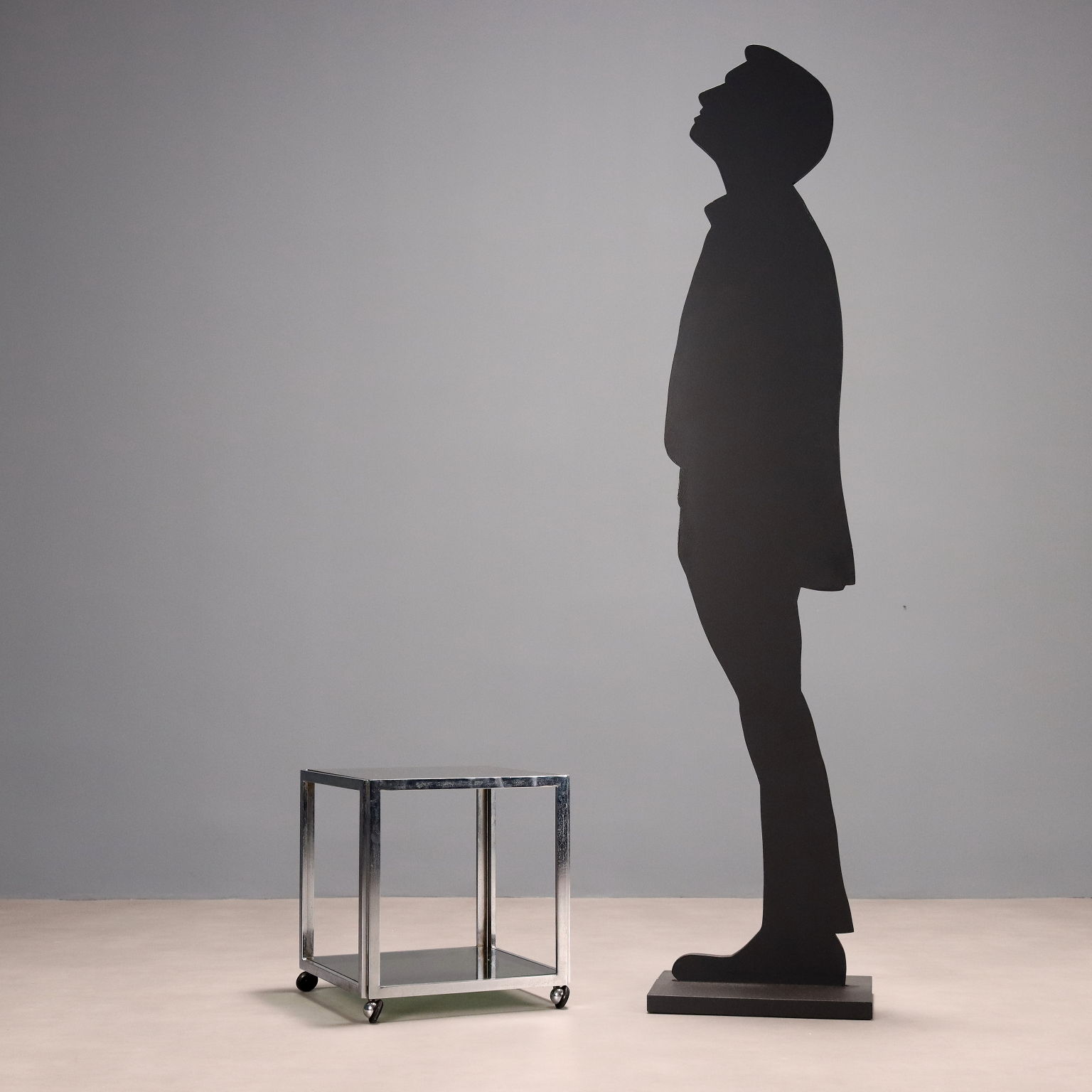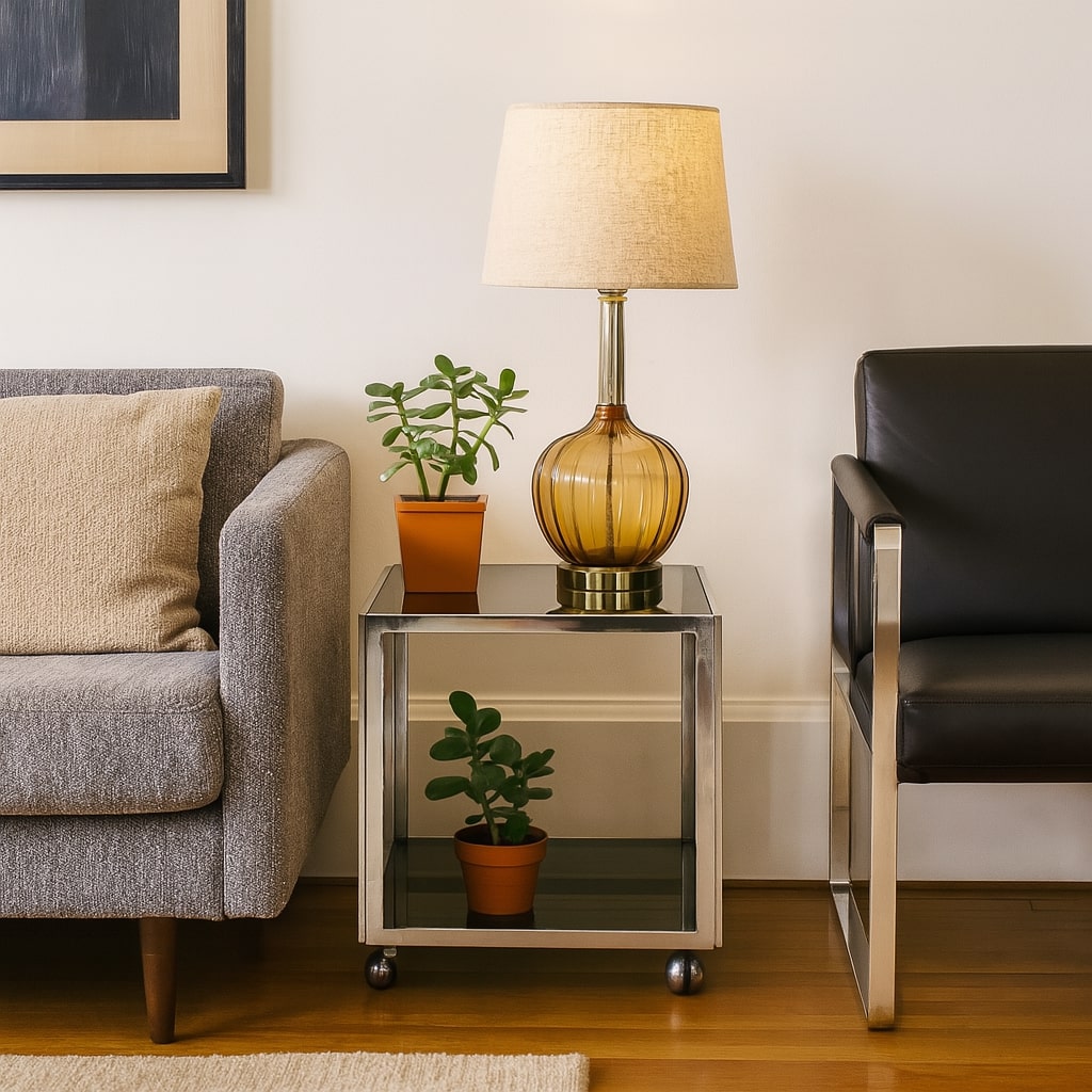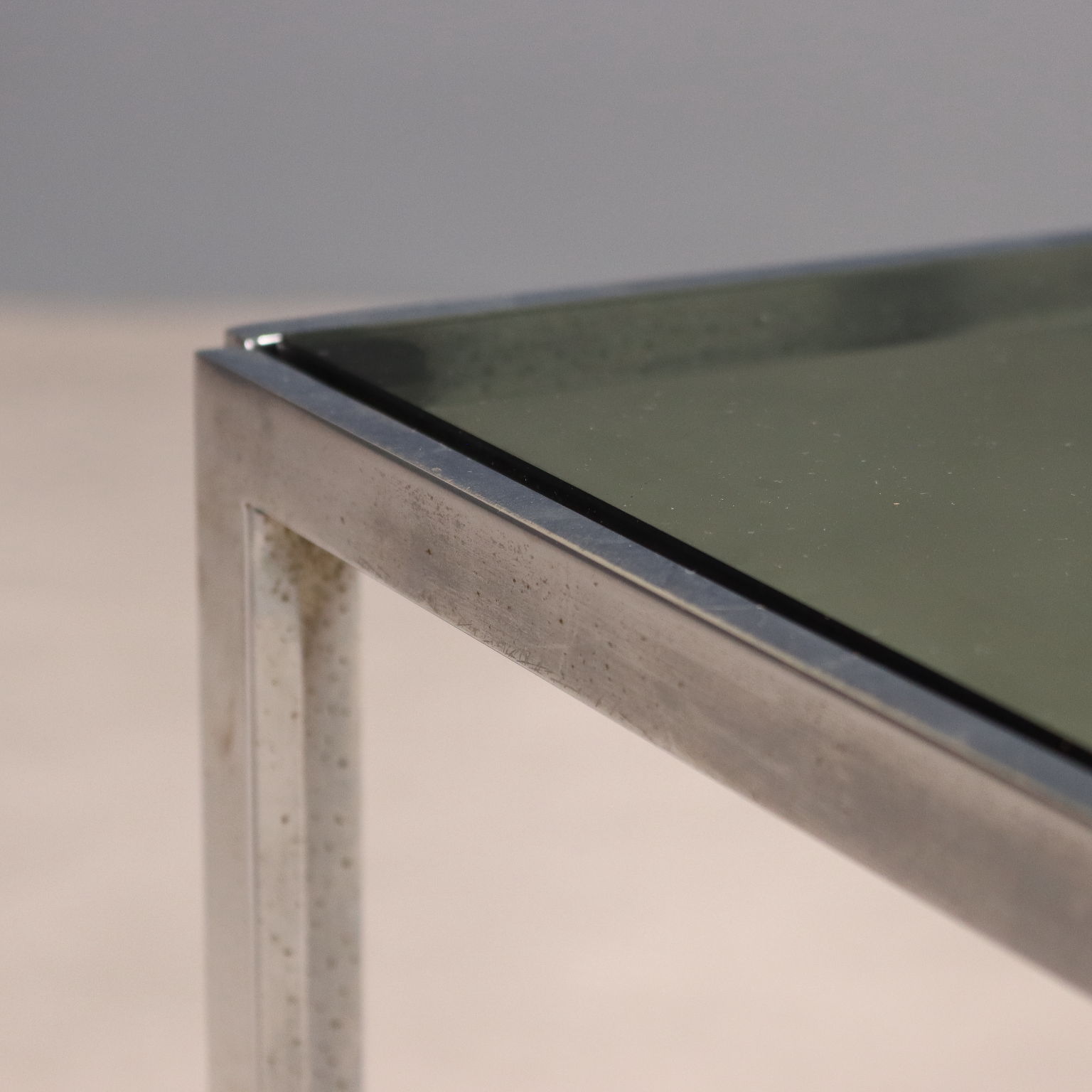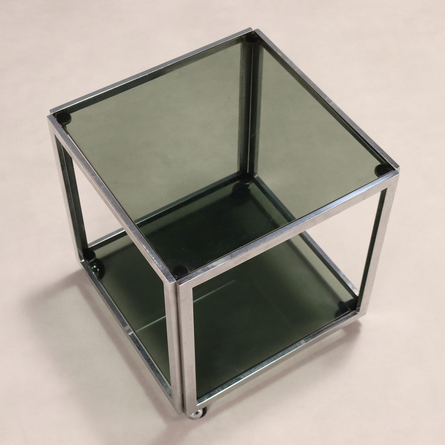 Tavolino da appoggio con struttura in metallo cromato, doppio piano in vetro fumè e rotelle.