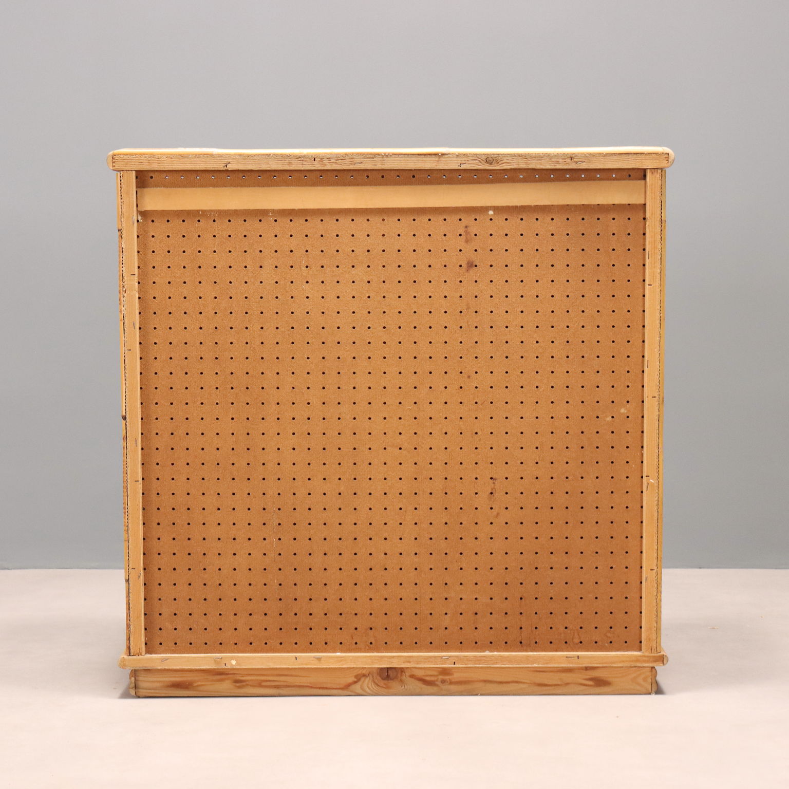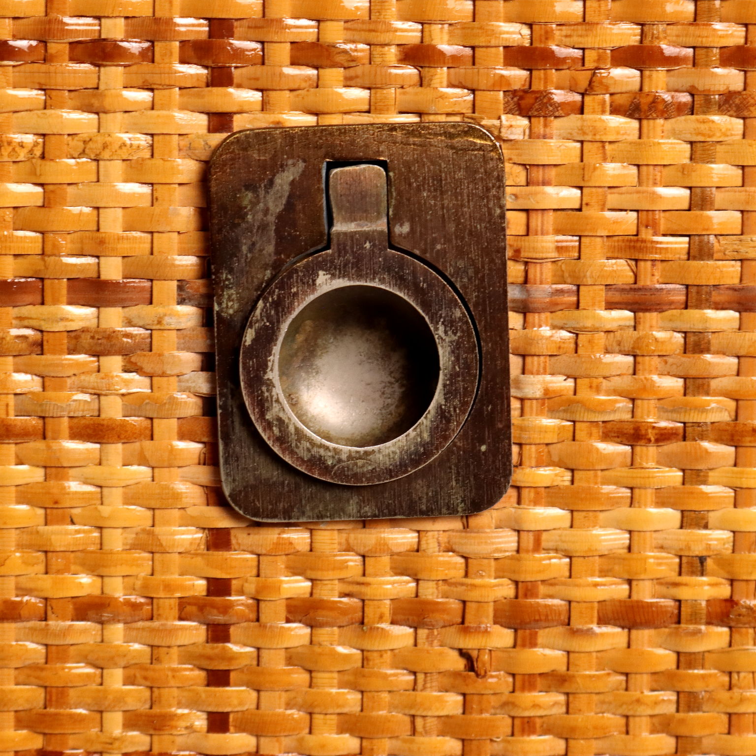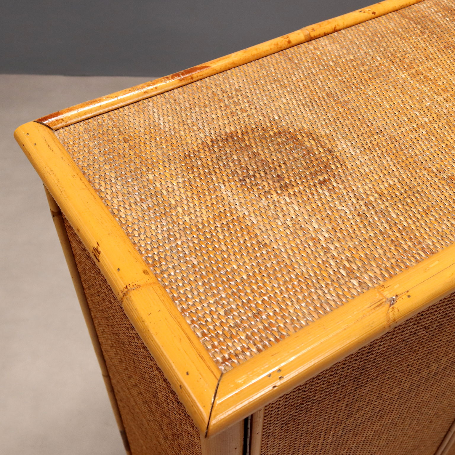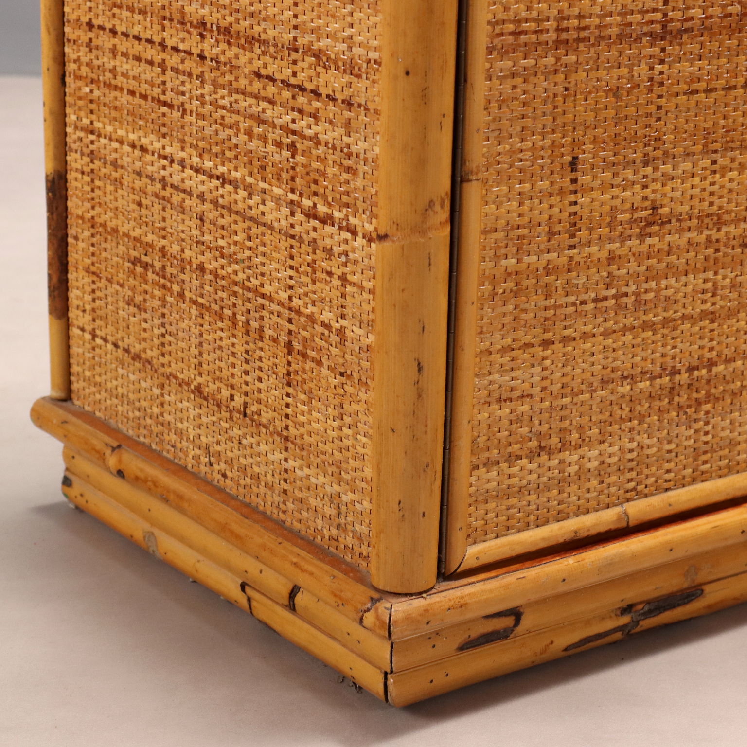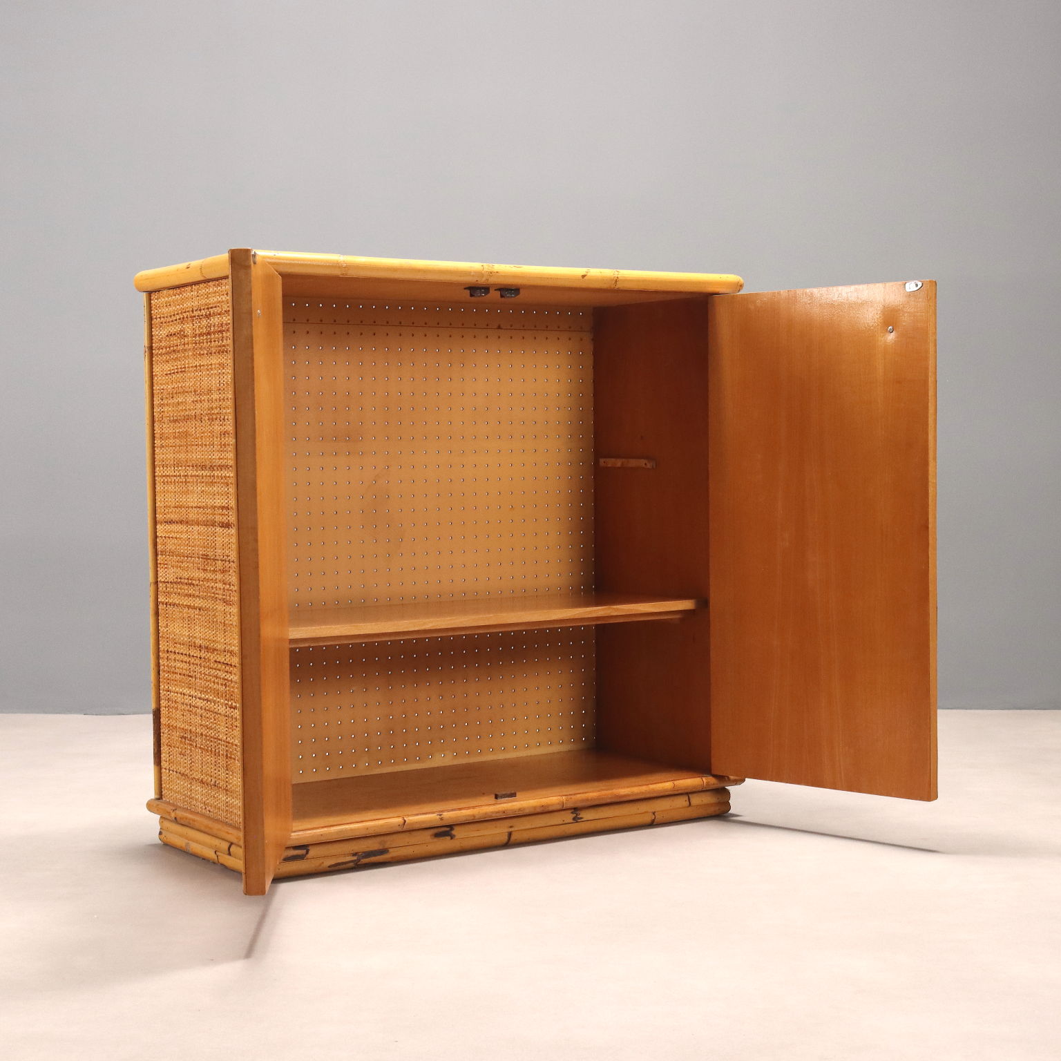 Credenza vintage con profili in bambù a due ante con maniglie in ottone, piano e lati in vimini.