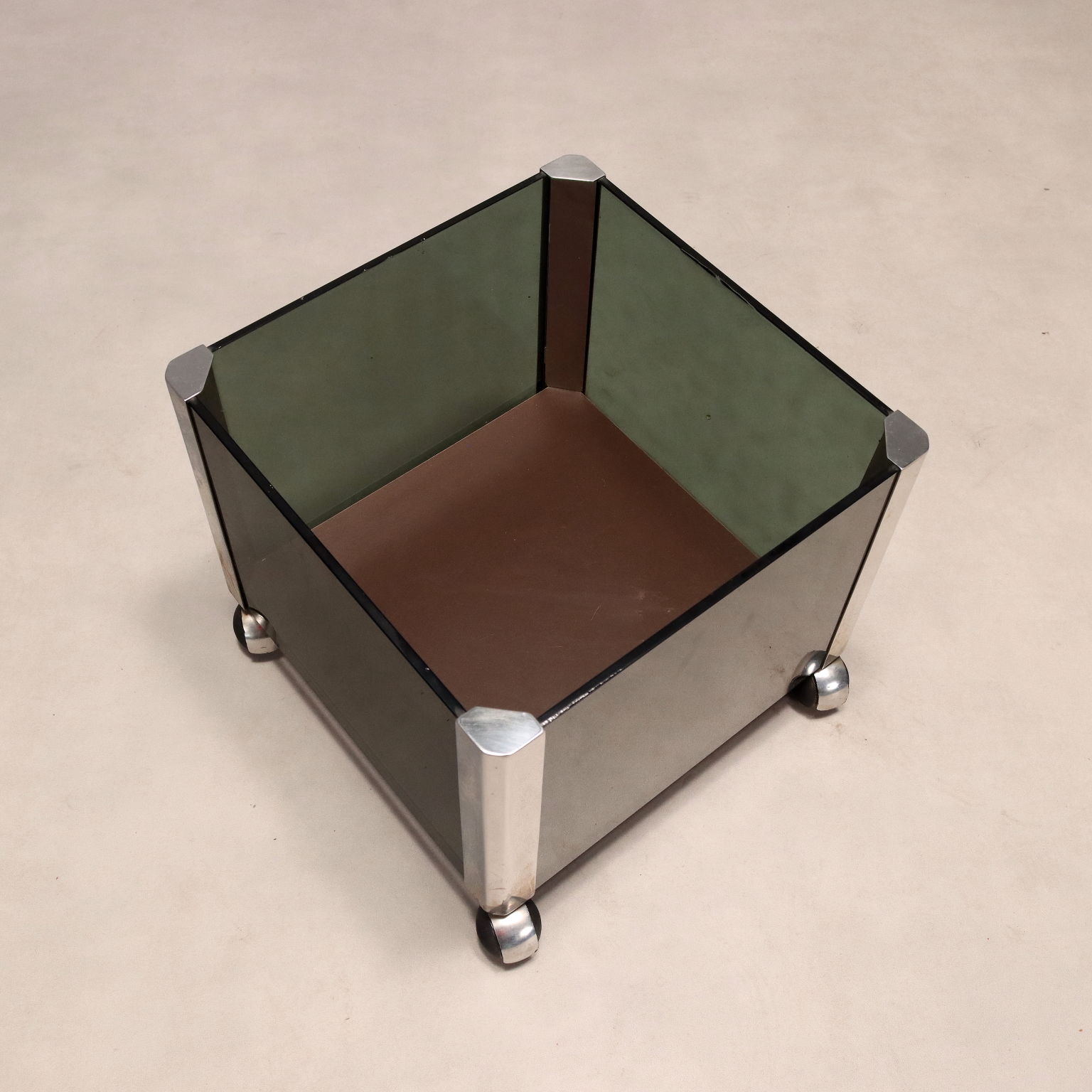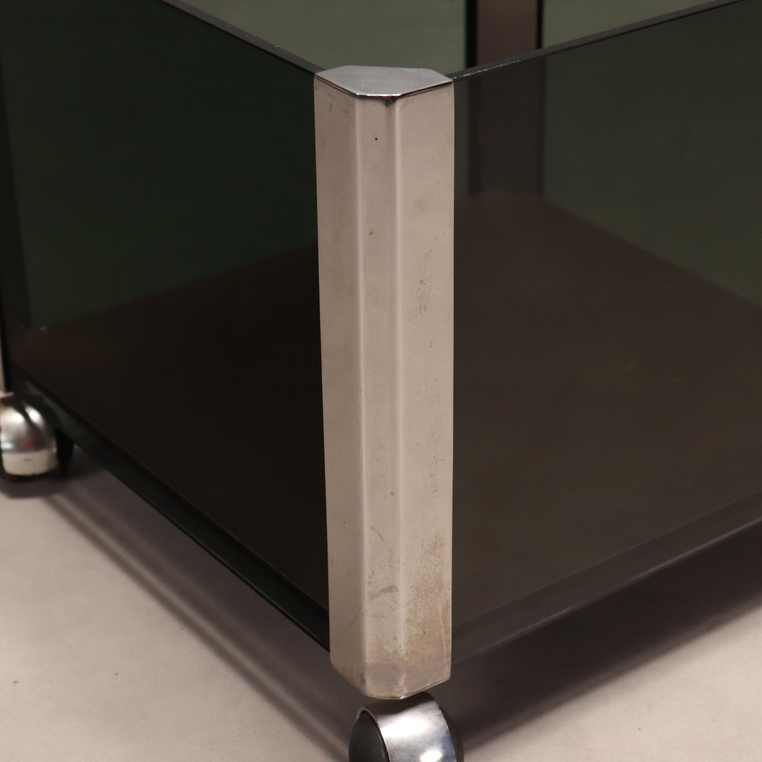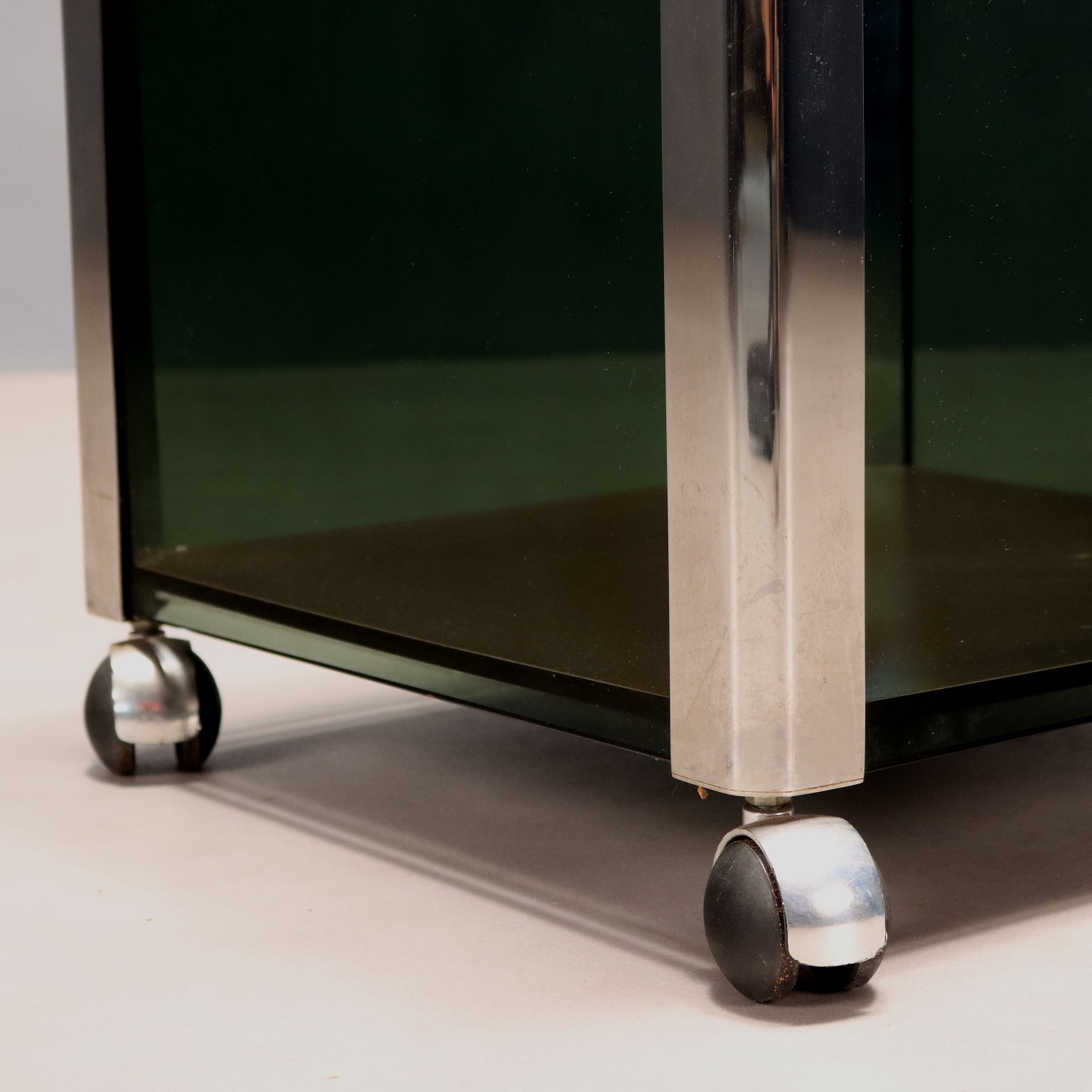 Portavasi vintage con rotelle, struttura in metallo cromato e lati in vetro fumè.