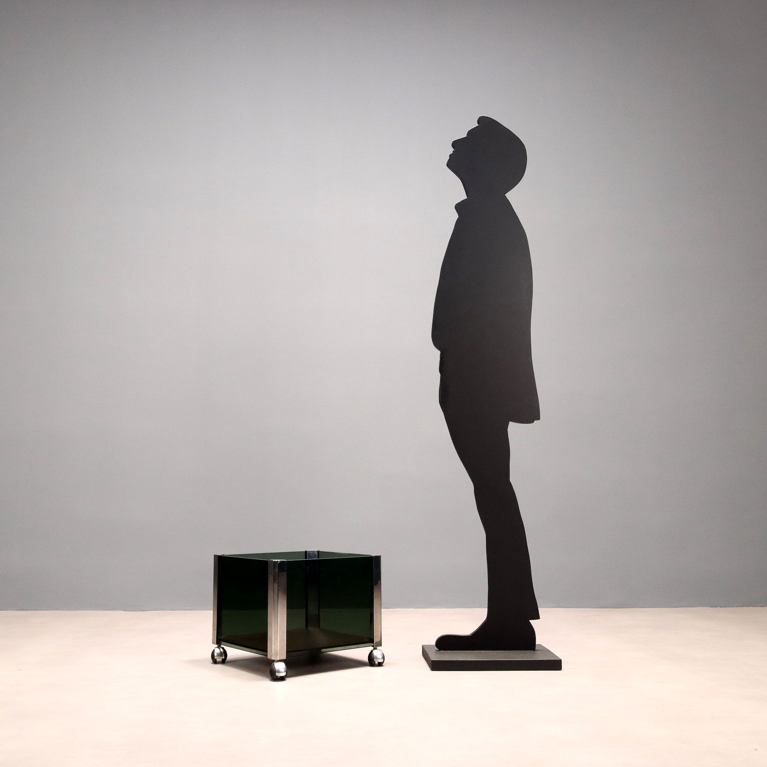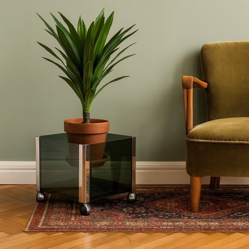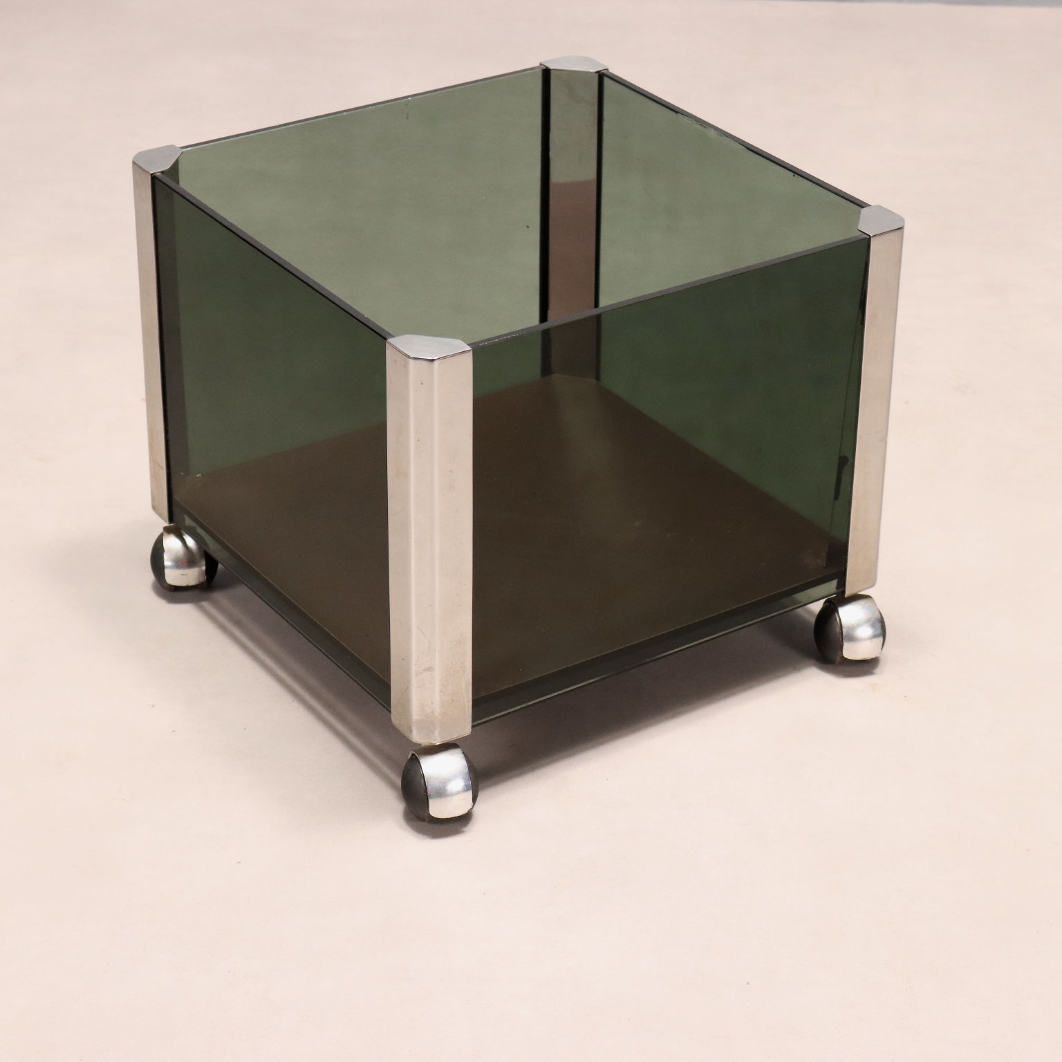 Portavasi vintage con rotelle, struttura in metallo cromato e lati in vetro fumè.
