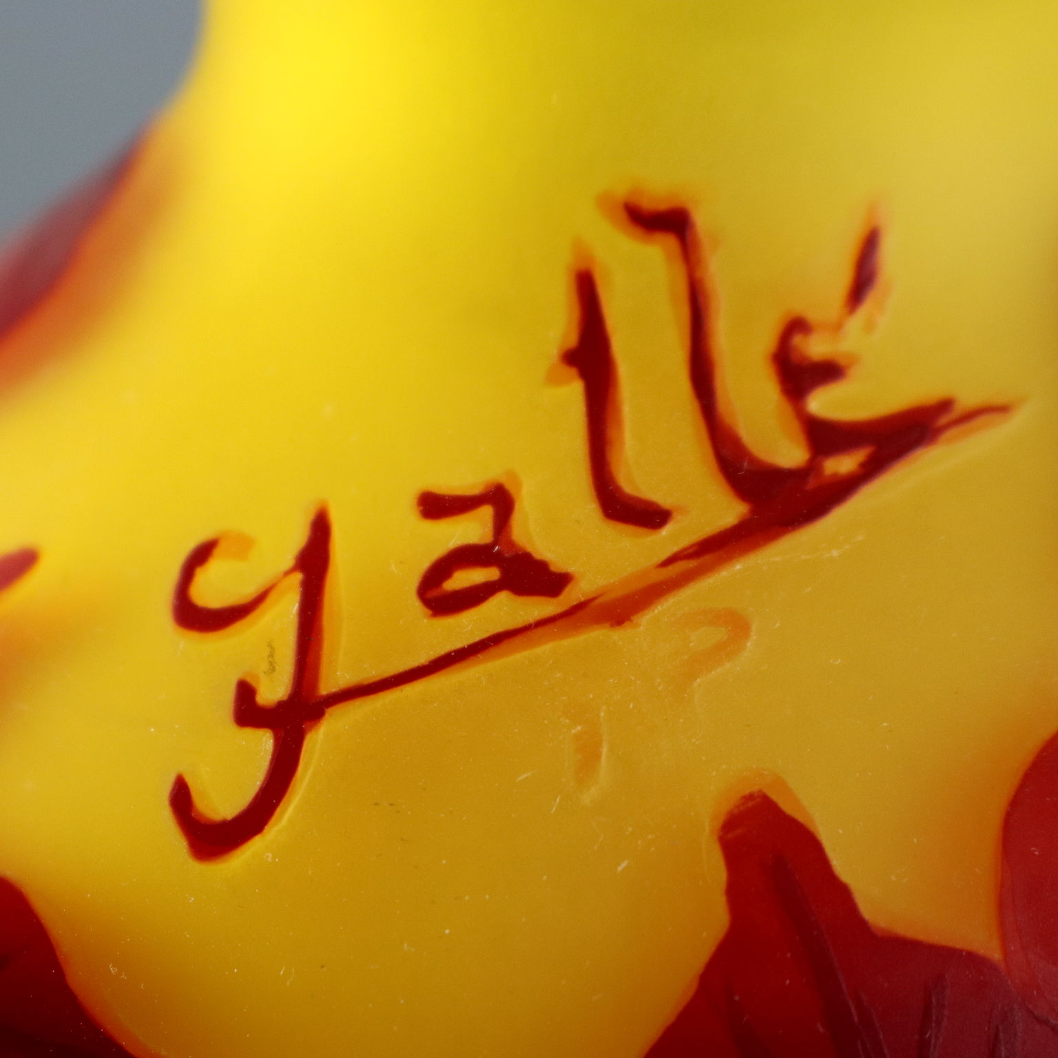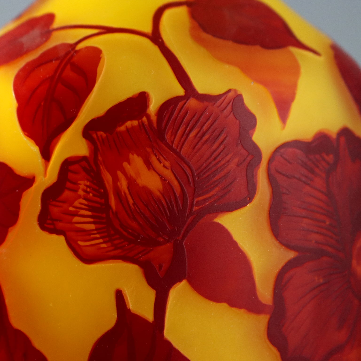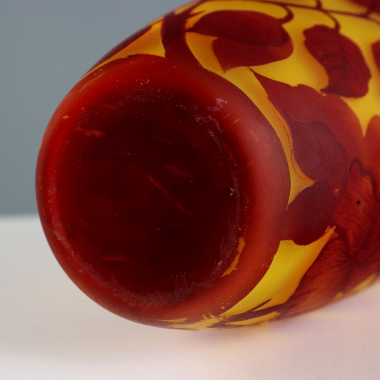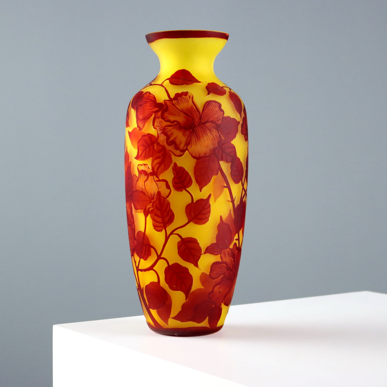 Vaso in vetro policromo decorato con rametti fioriti. Marchio della manifattura a rilievo.