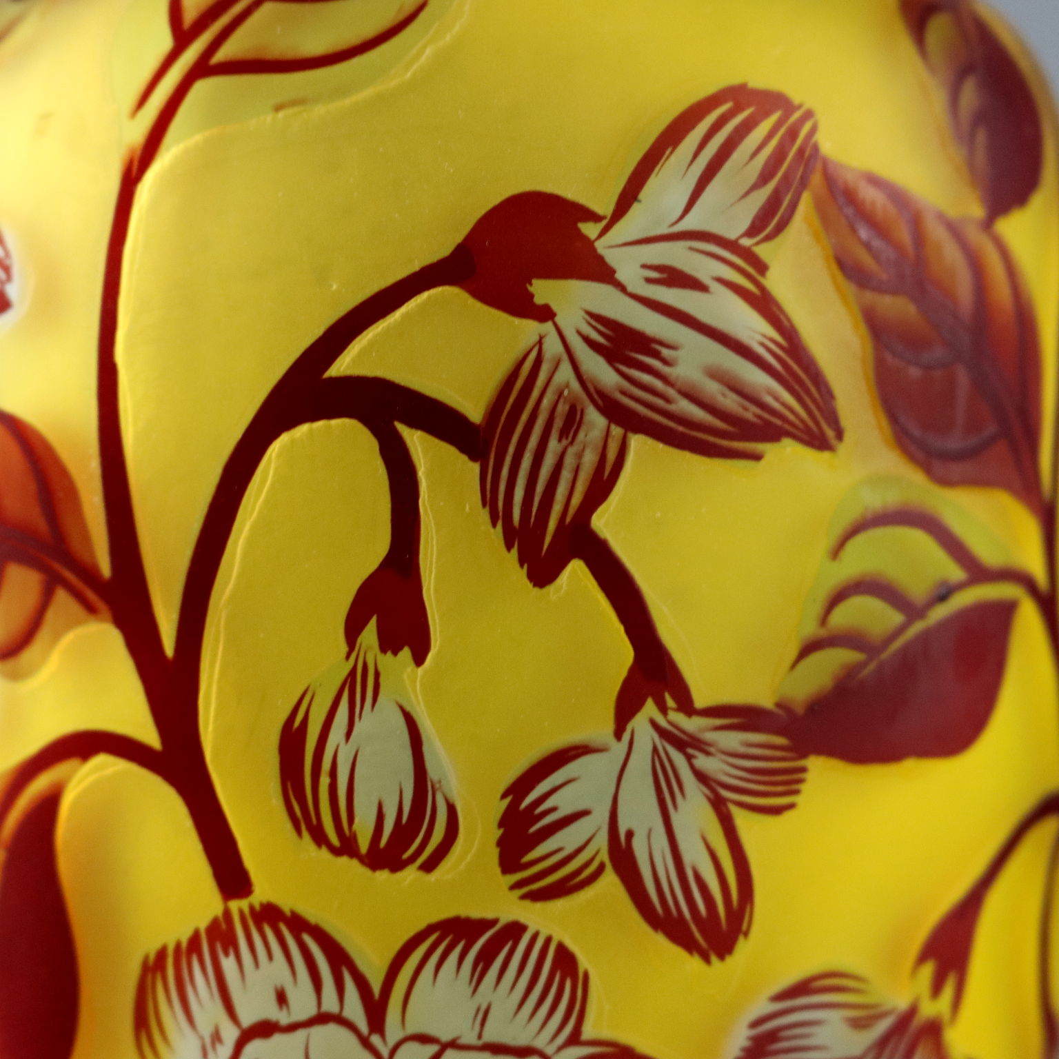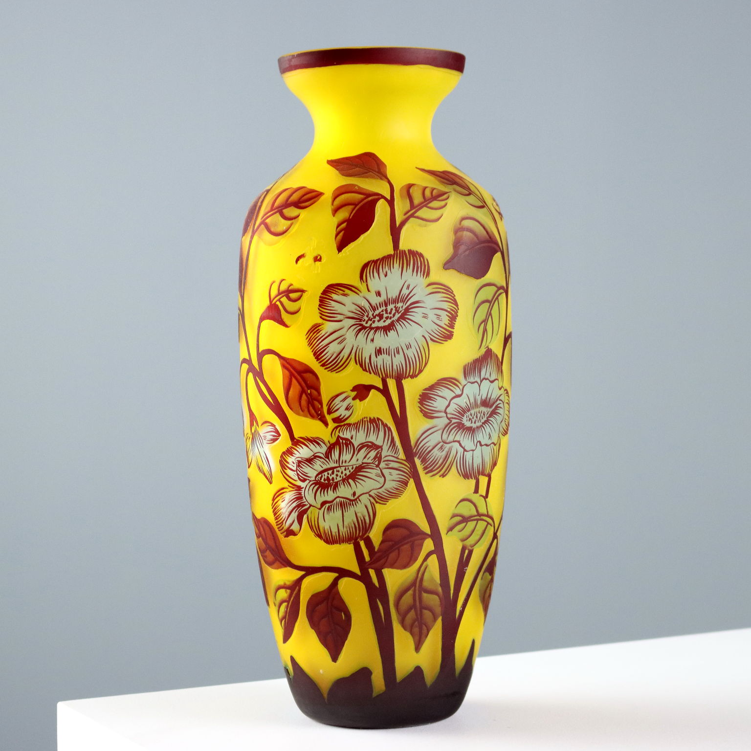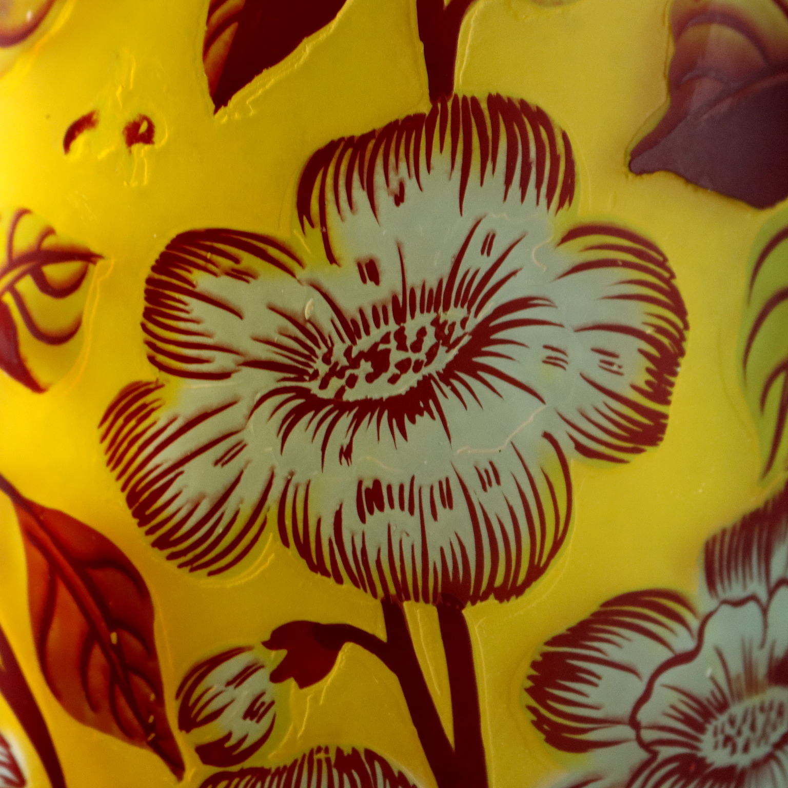 Vaso in vetro policromo decorato con rametti fioriti a tutto campo. Marchio della manifattura a rilievo.
