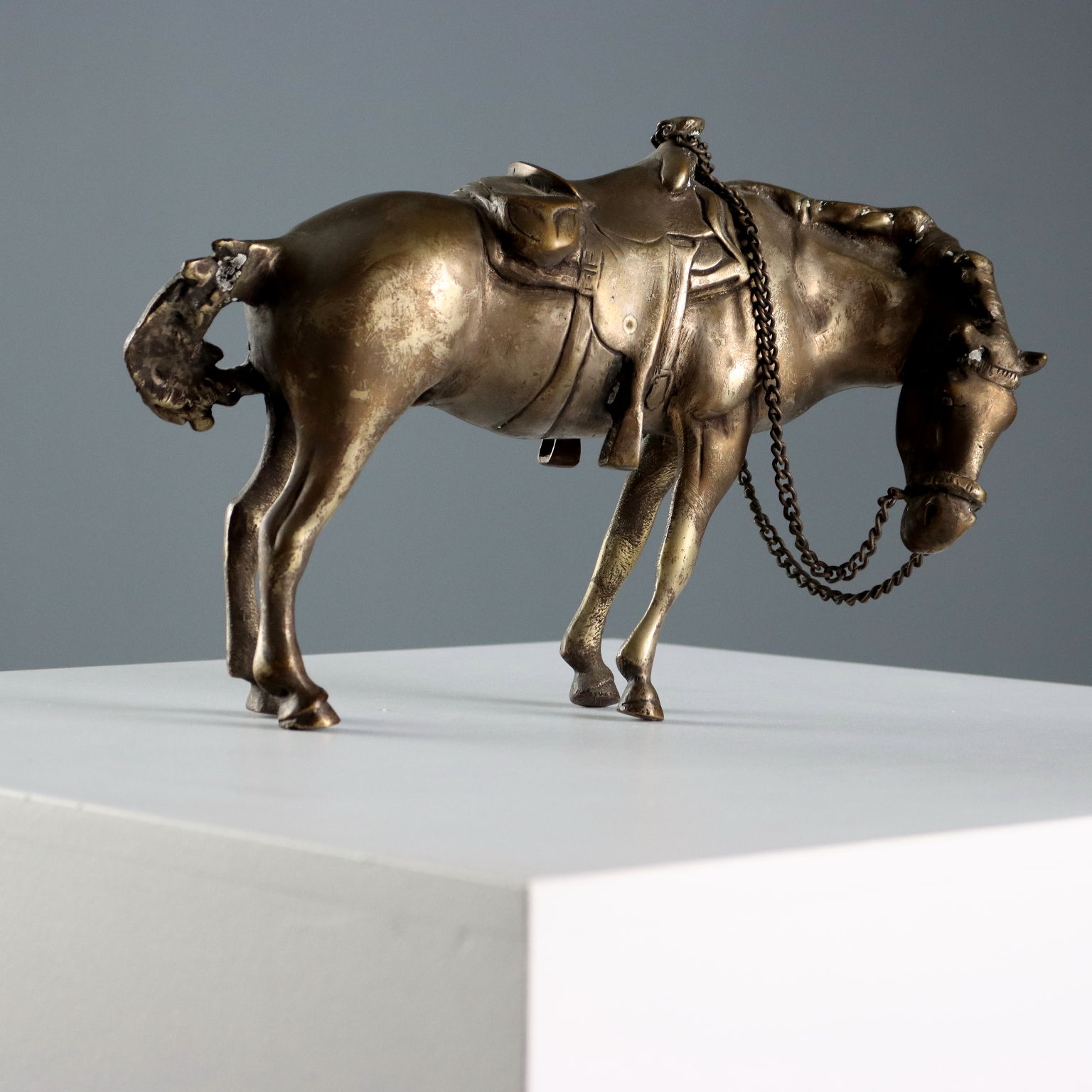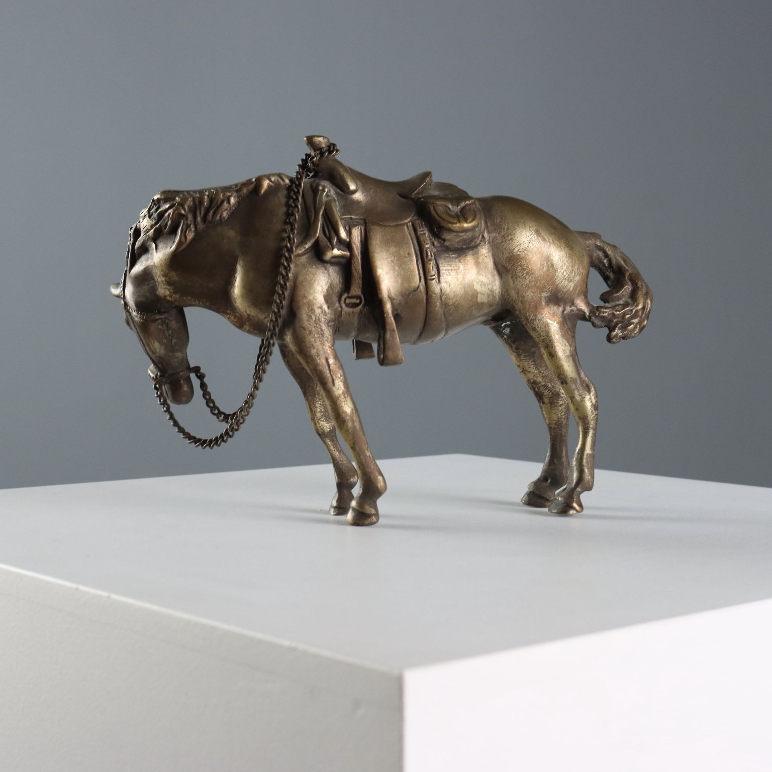 Figura in bronzo di cavallo sellato. Briglie a catenella applicate.