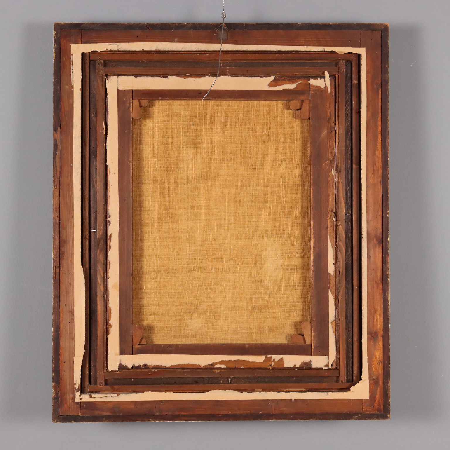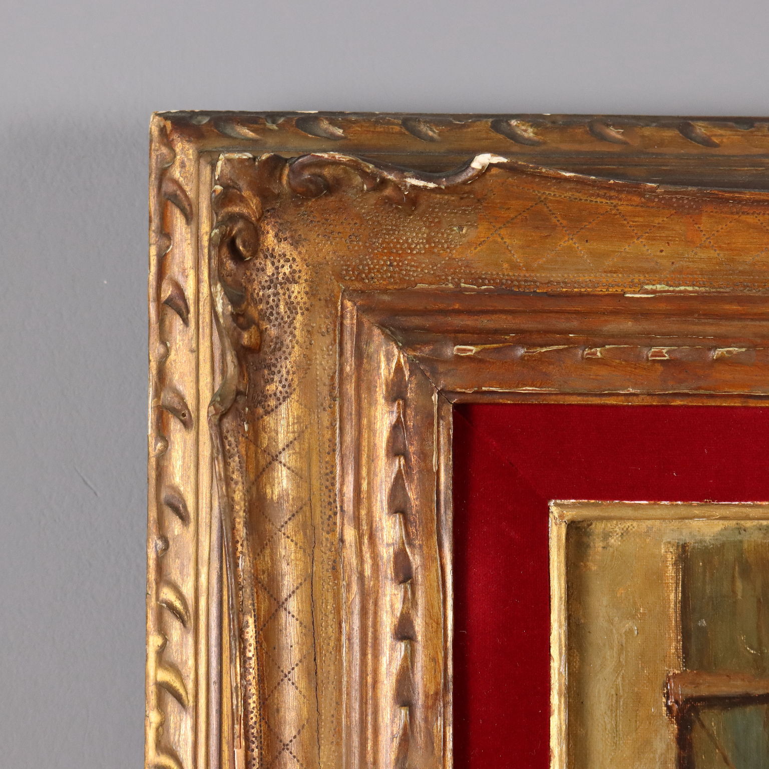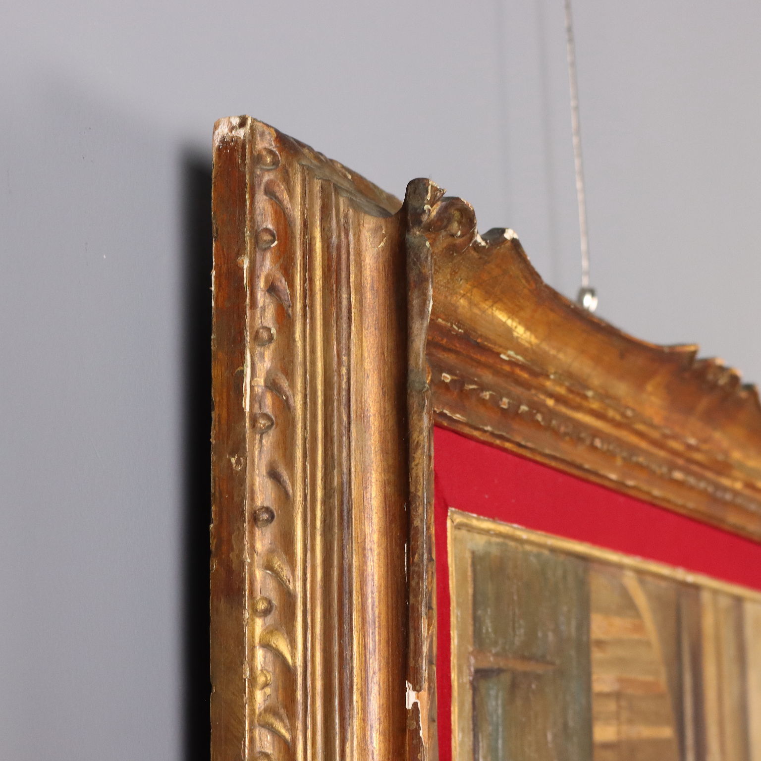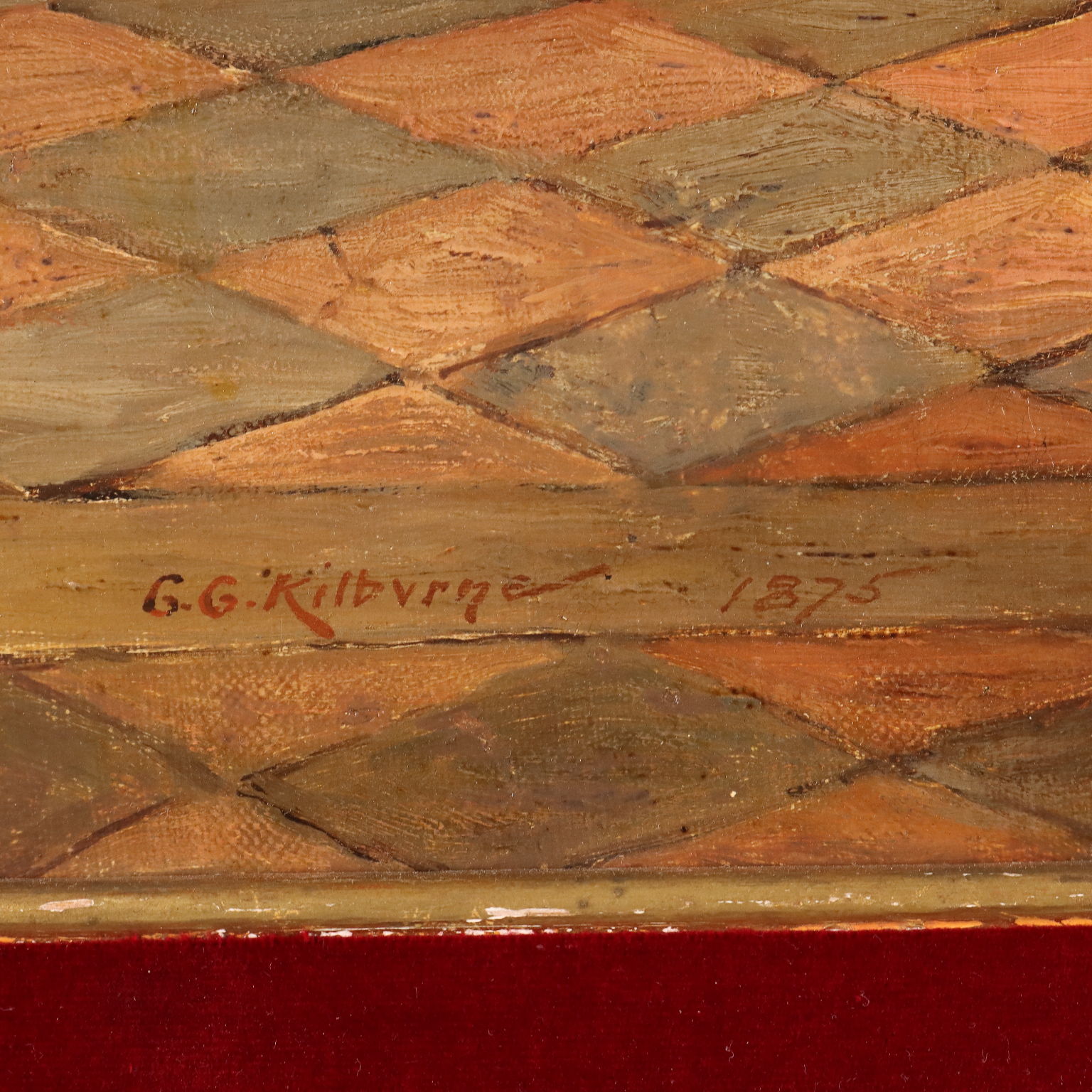 Olio su tela. Firmato e datato in basso a sinistra. Il pittore inglese George Goodwin Kilburne si specializzò nelle scene di genere ambientate nella vita della alta borghesia vittoriana, con scene di caccia, scene di salotto, tutte caratterizzate da eleganza, dalla minuzia dei dettagli soprattutto delle figure femminili. Nel 1875 Kilburne soggiornò alcuni mesi a Roma, per poi viaggiare in altre città italiane ed europee. La scena qui raffigurata, propriamente del 1875, pare collocata proprio a Roma: presso un punto di guardia in città, come ben spiega lo scorcio urbano che si vede dal portone aperto, si riposano alcuni militari che indossano l'uniforme delle guardie vaticane. L'opera è presentata in cornice di fine '800- inizio '900.