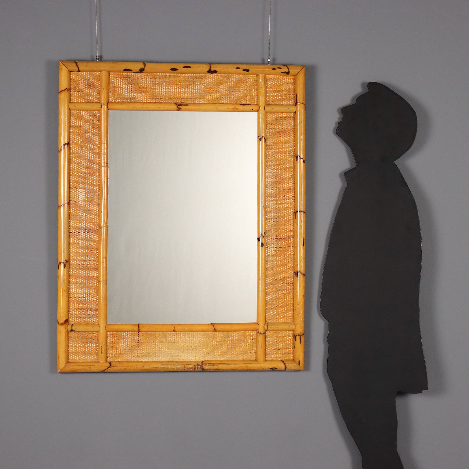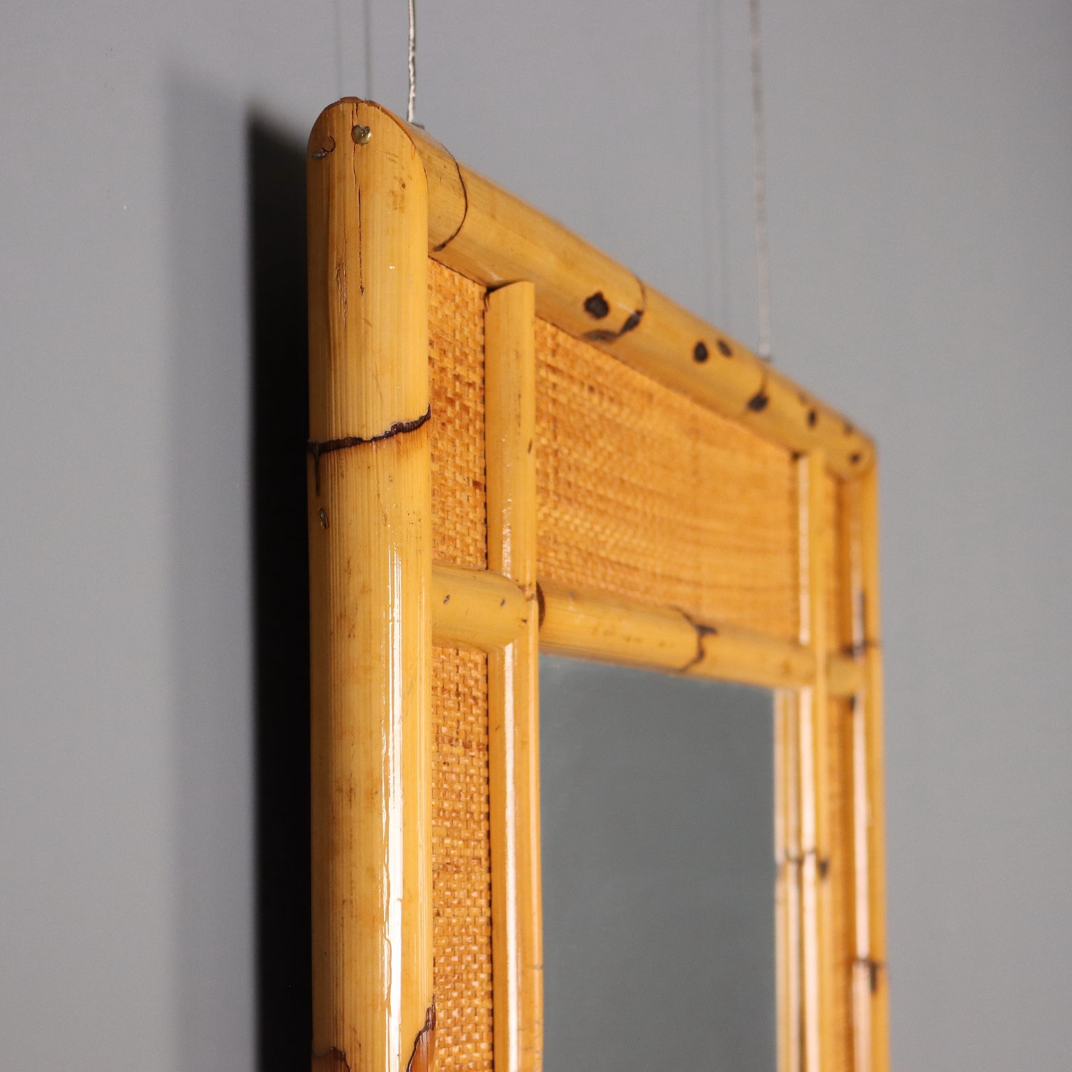 Specchio vintage di manifattura italiana con cornice rettangolare in bambù e vimini.