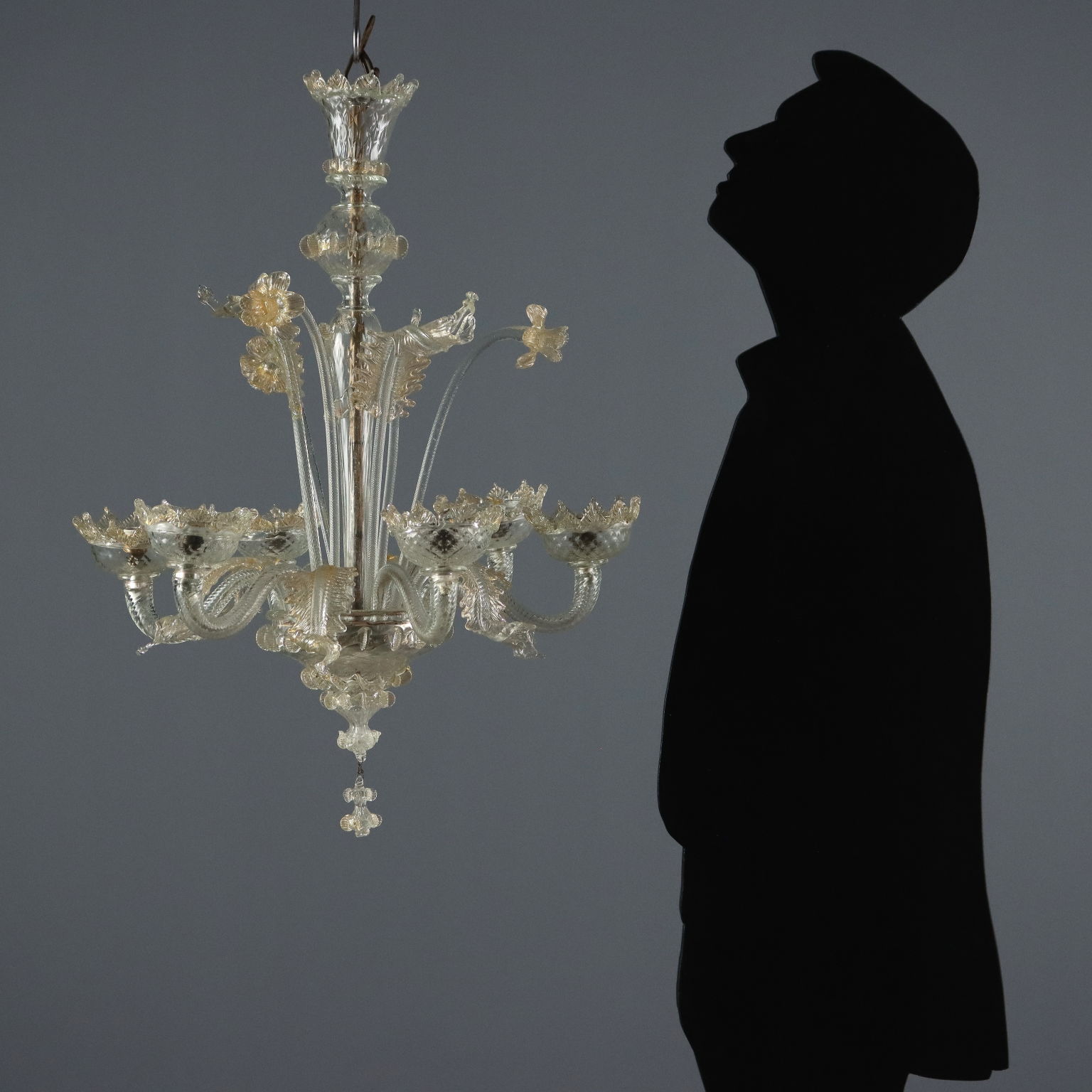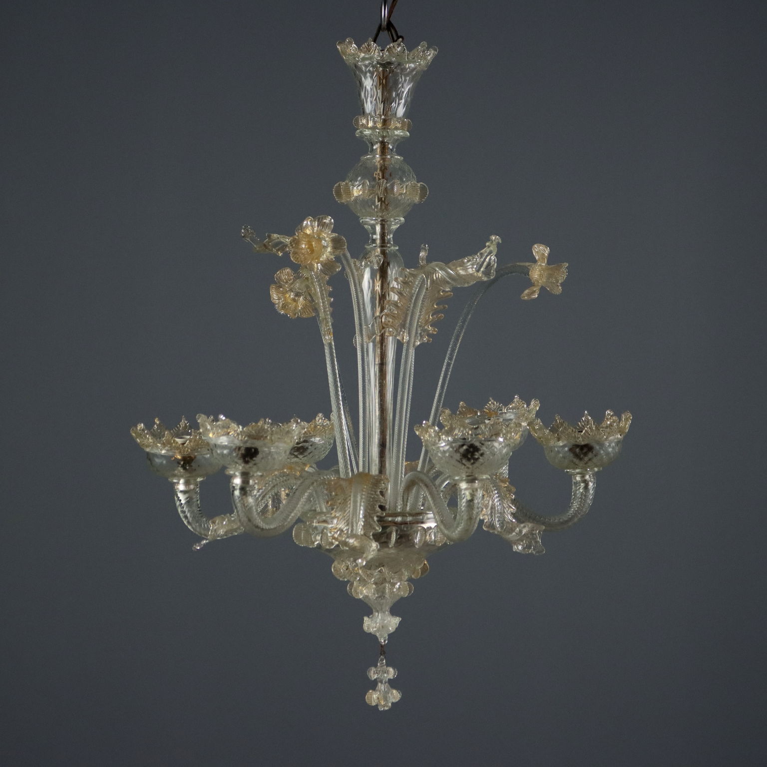 Lampadario in vetro soffiato Veneziano trasparente con sfumature dorate, sei luci sorrette da braccia mosse alternate a foglie cadenti. Foglie e fiori ad adornare il fusto centrale. Murano, XIX Secolo.