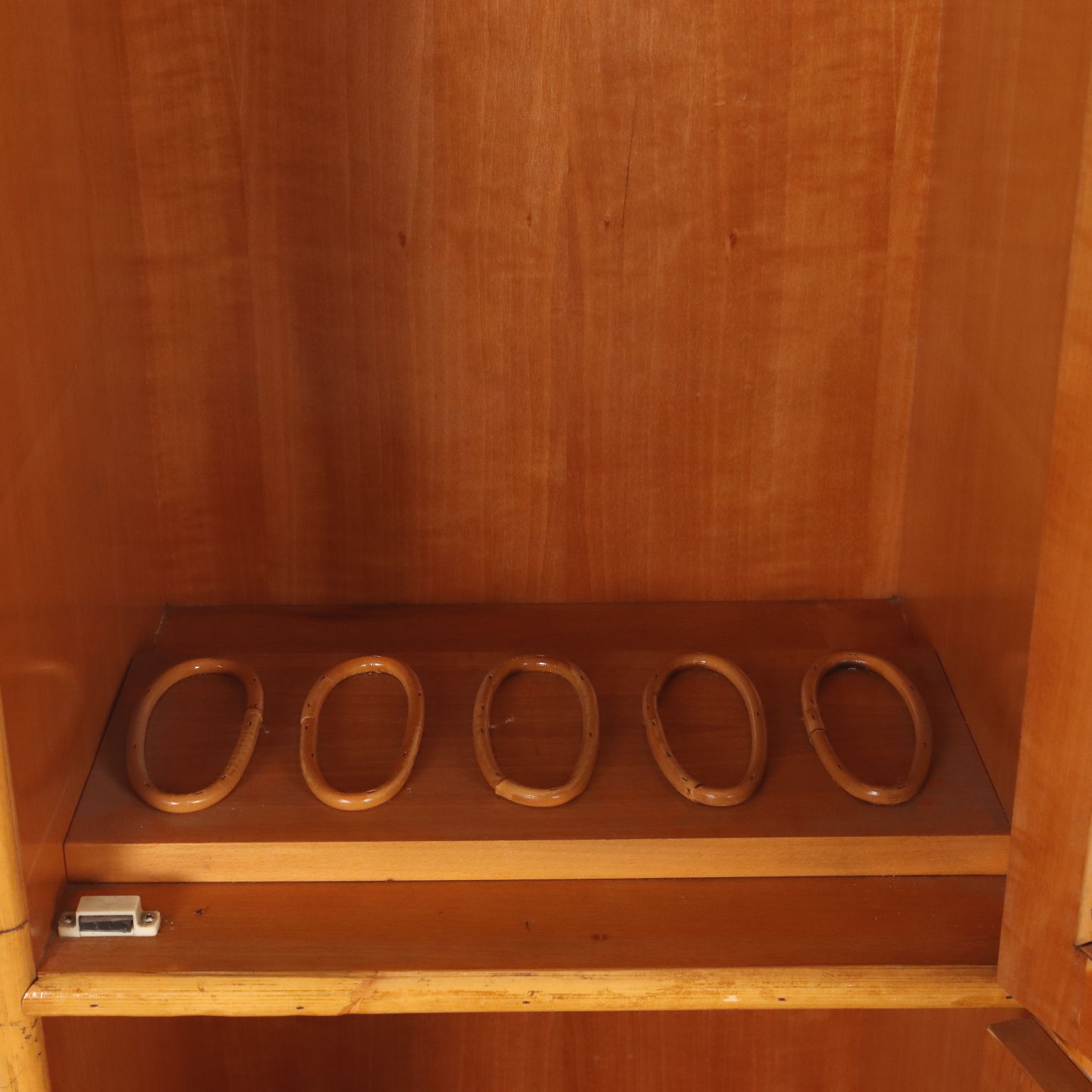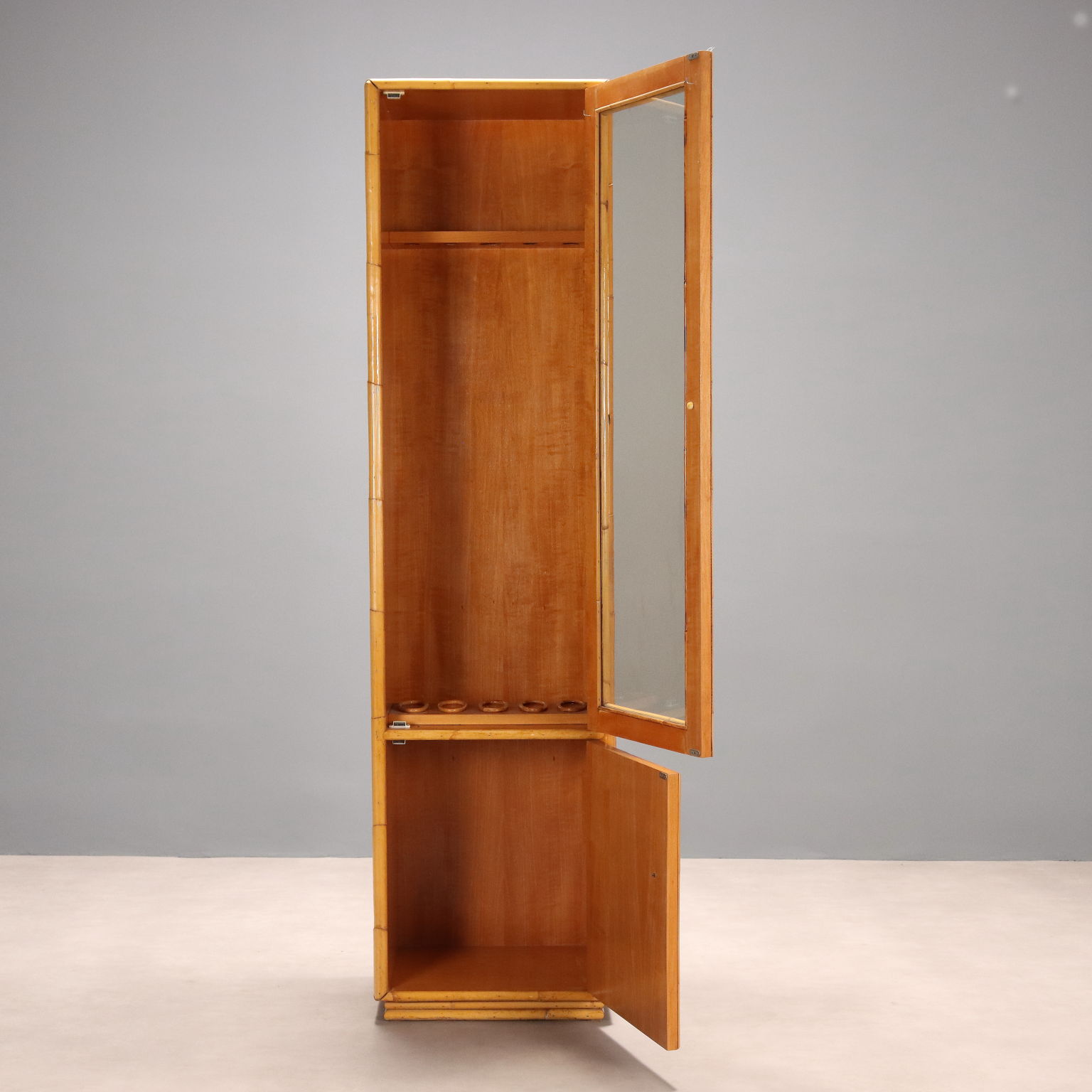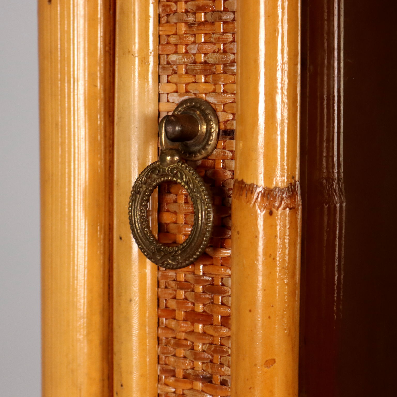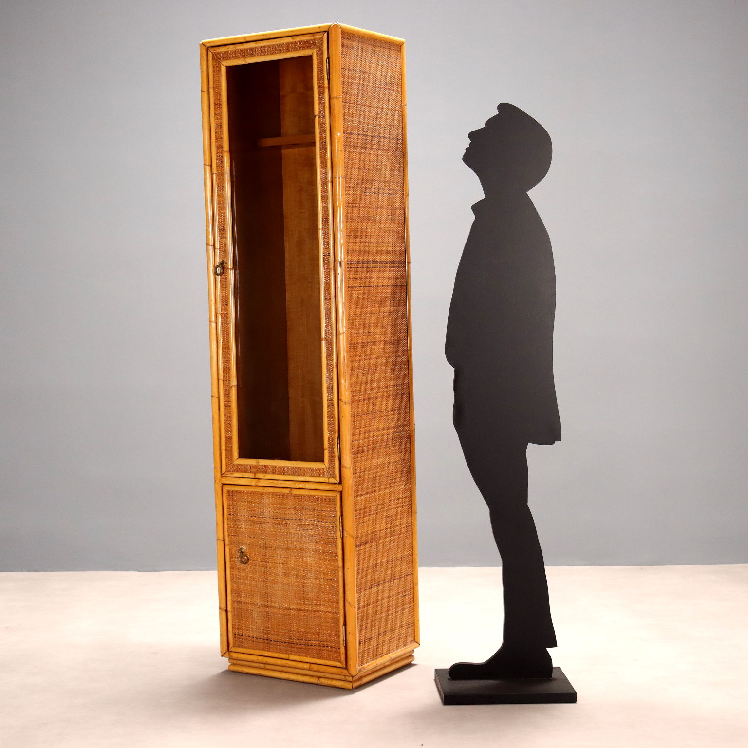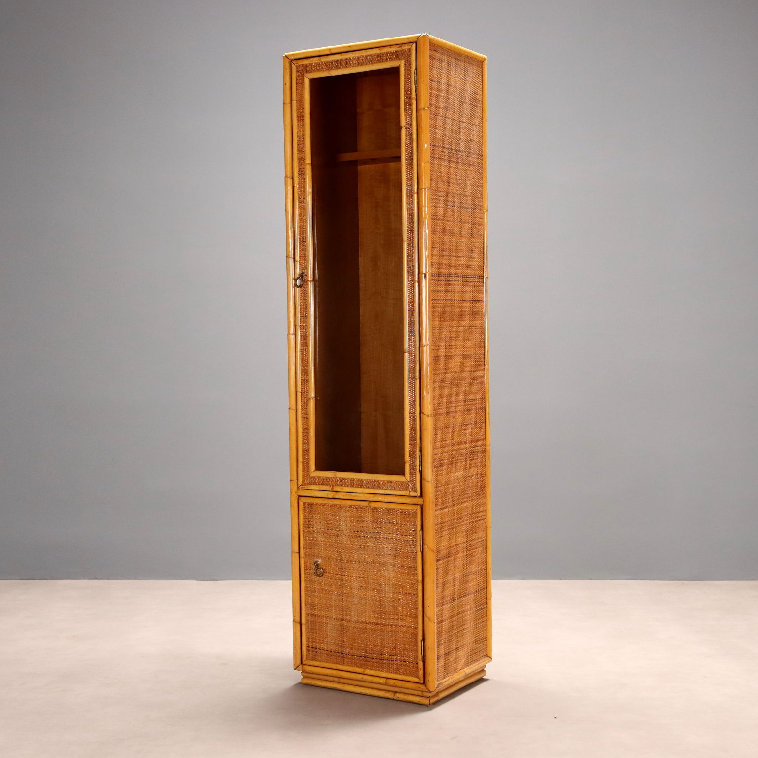 Mobile con struttura in bambù, fronte e lati in vimini. Presenta una vetrina e un vano con anta a battente nella parte inferiore.