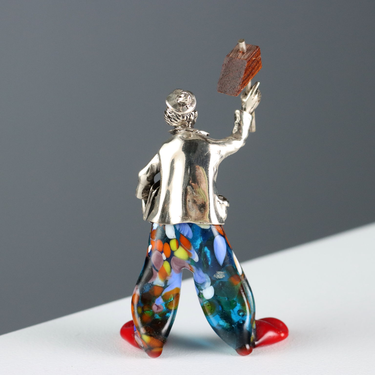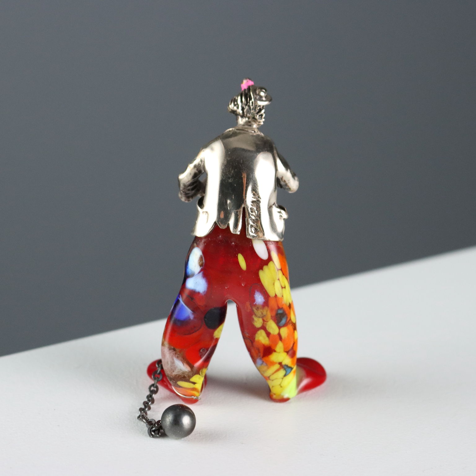 Descrizione Coppia di pagliacci in argento e vetro policromo. Le figure rappresentano un imputato e il suo avvocato difensore. Marchi dell'argento e firma incussi.