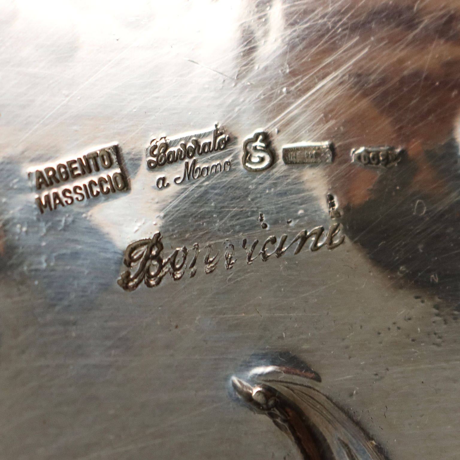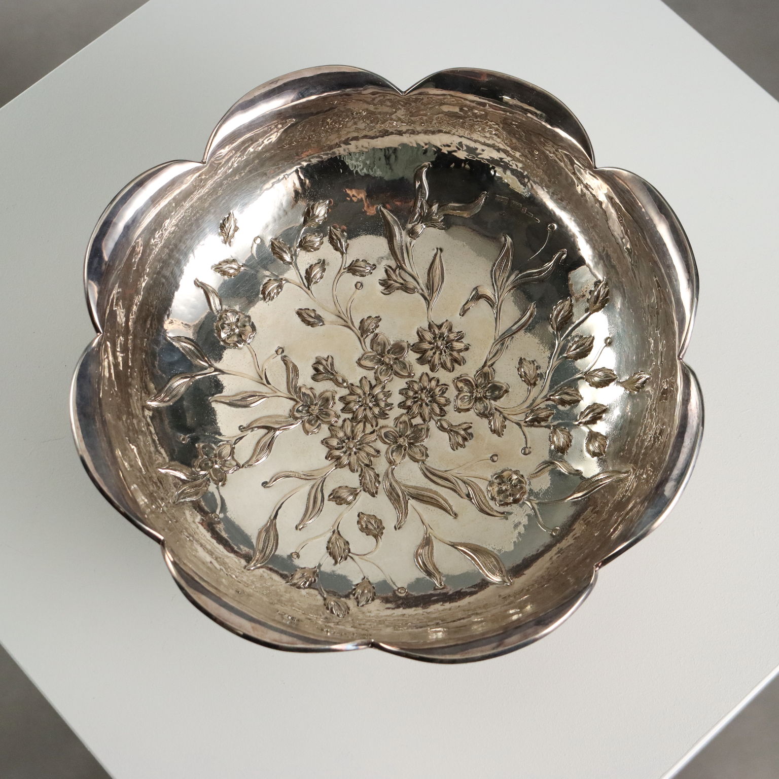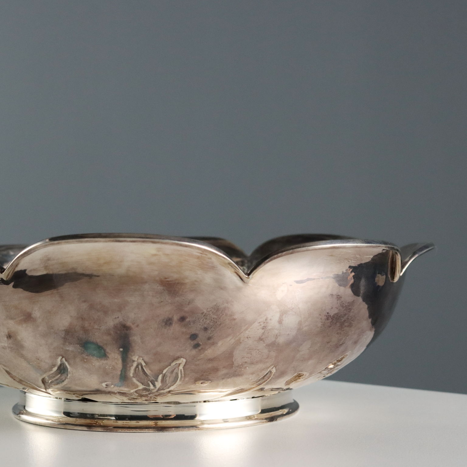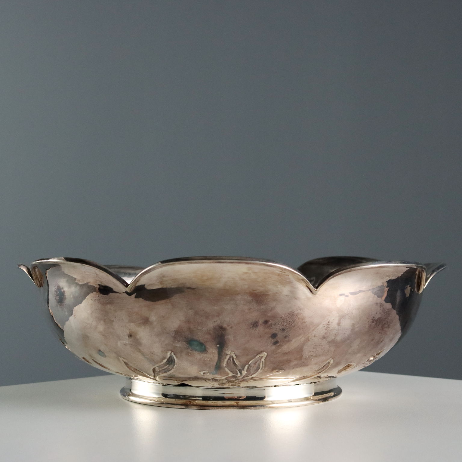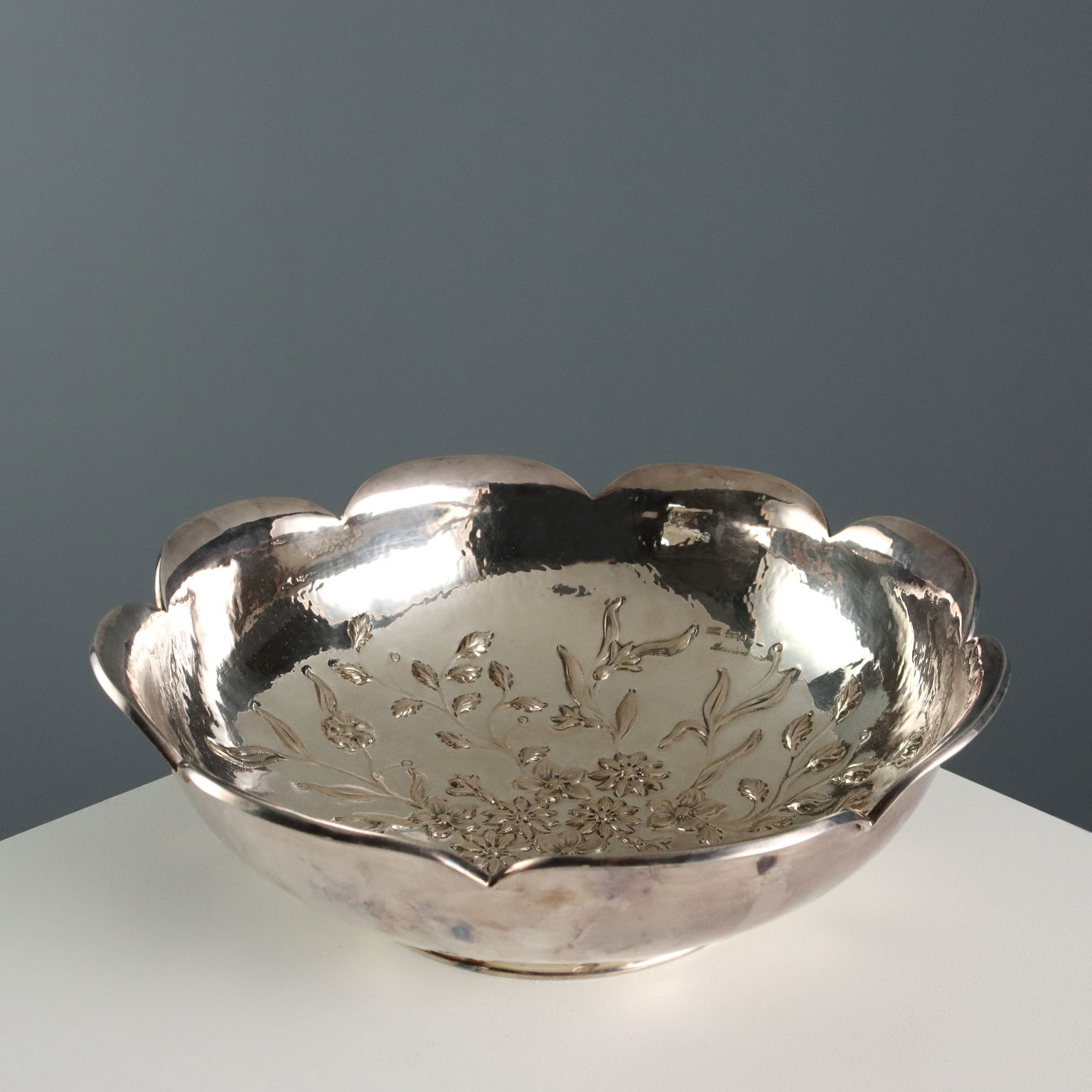 Ciotola in argento con bordo lobato e superficie martellata a mano. Nel cavetto rametti di fiori ottenuti con lavorazione a sbalzo. Marchi dell'argento incussi; argentiere non leggibile. Firma del rivenditore Bonvicini. Grammi 830.