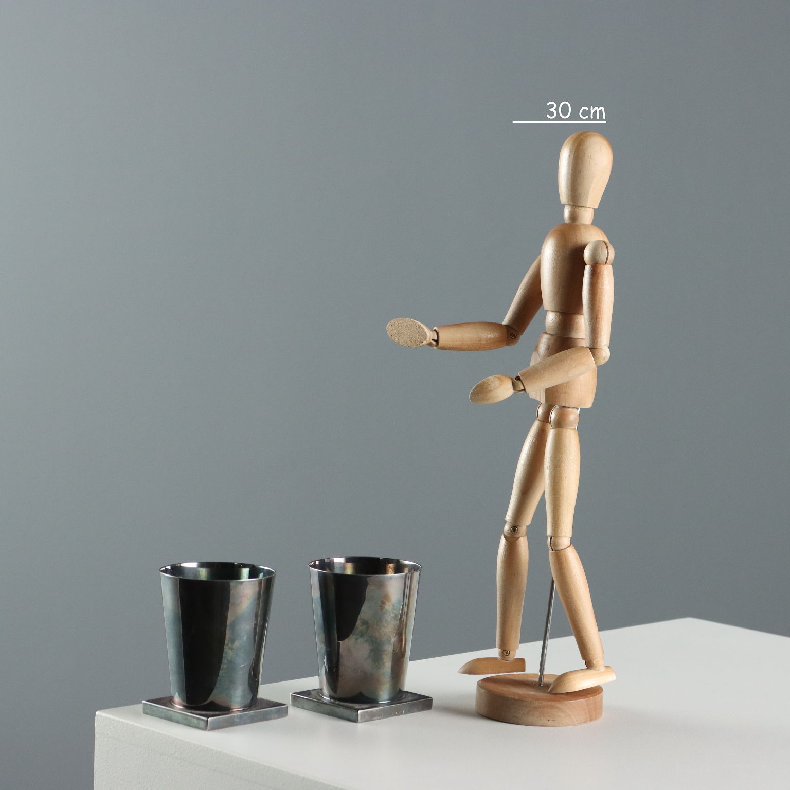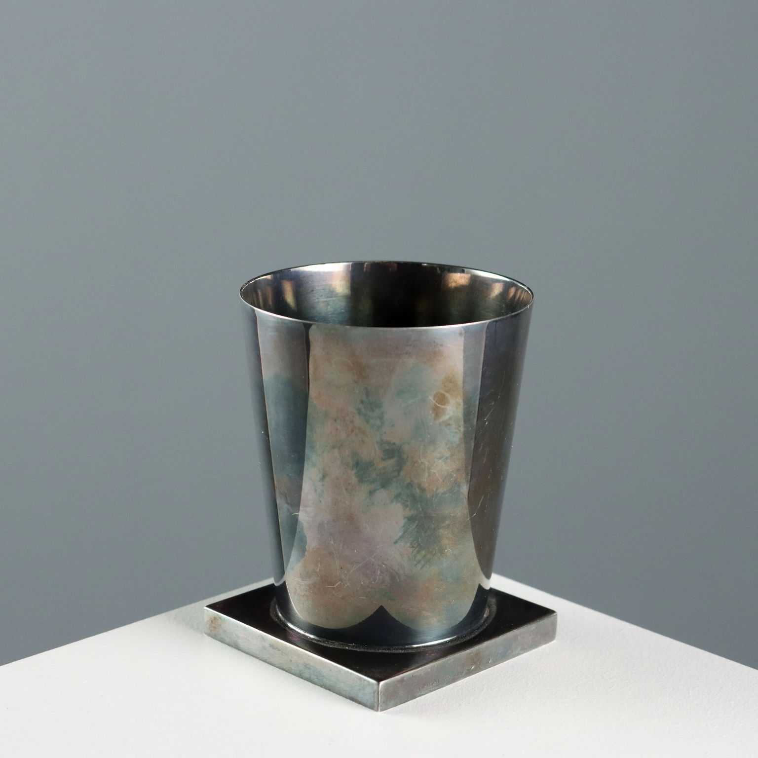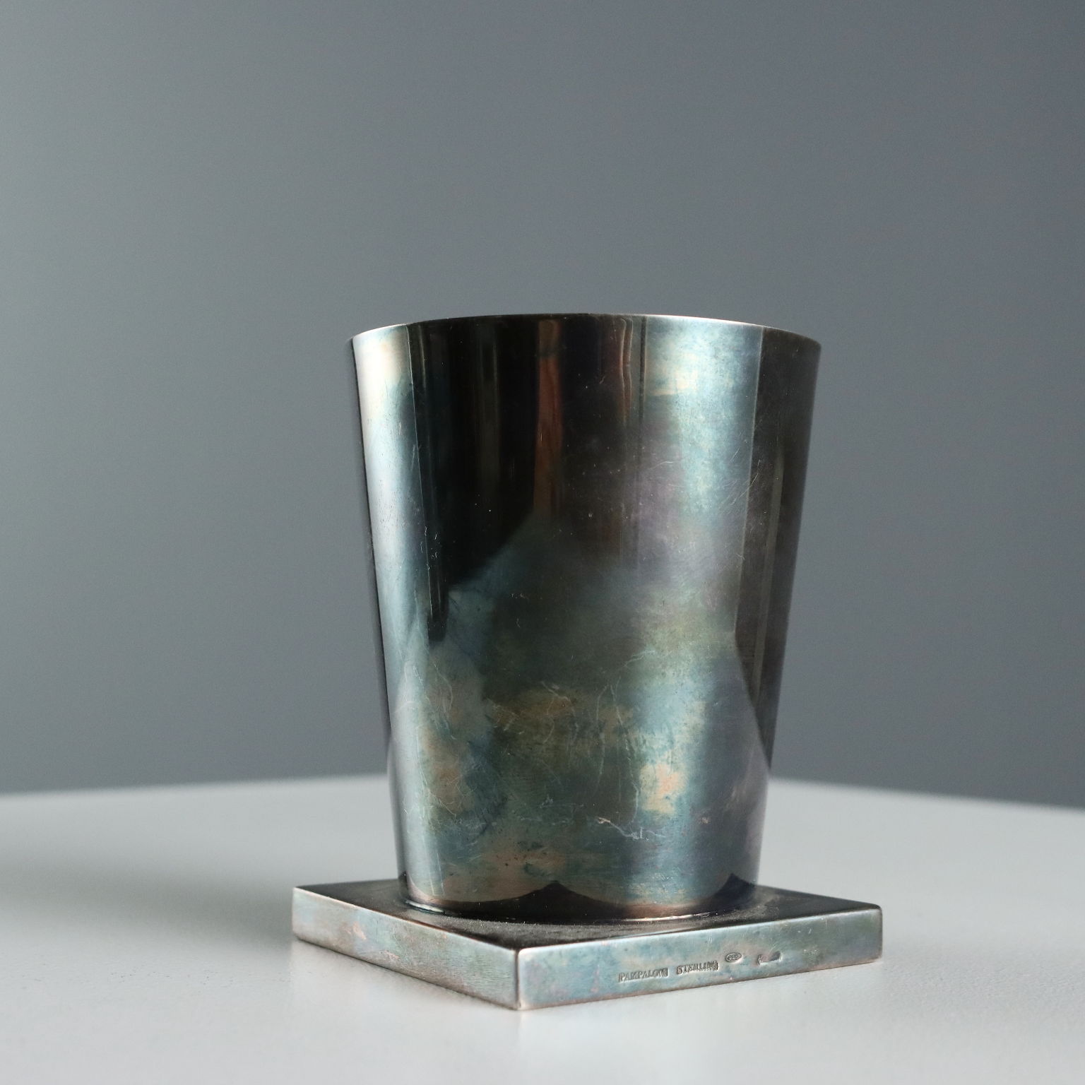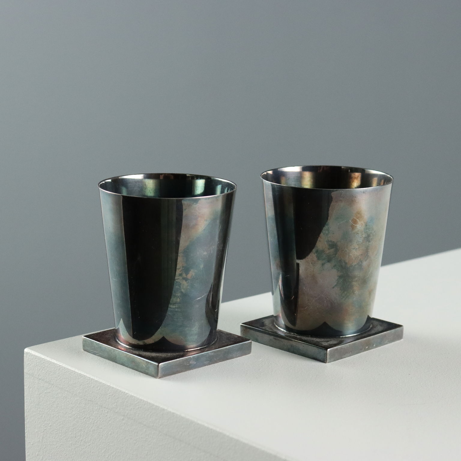 Coppia di bicchieri in argento 925 a base quadrata. Sulla base marchi dell'argento e dell'argentiere incussi. Grammi 260.