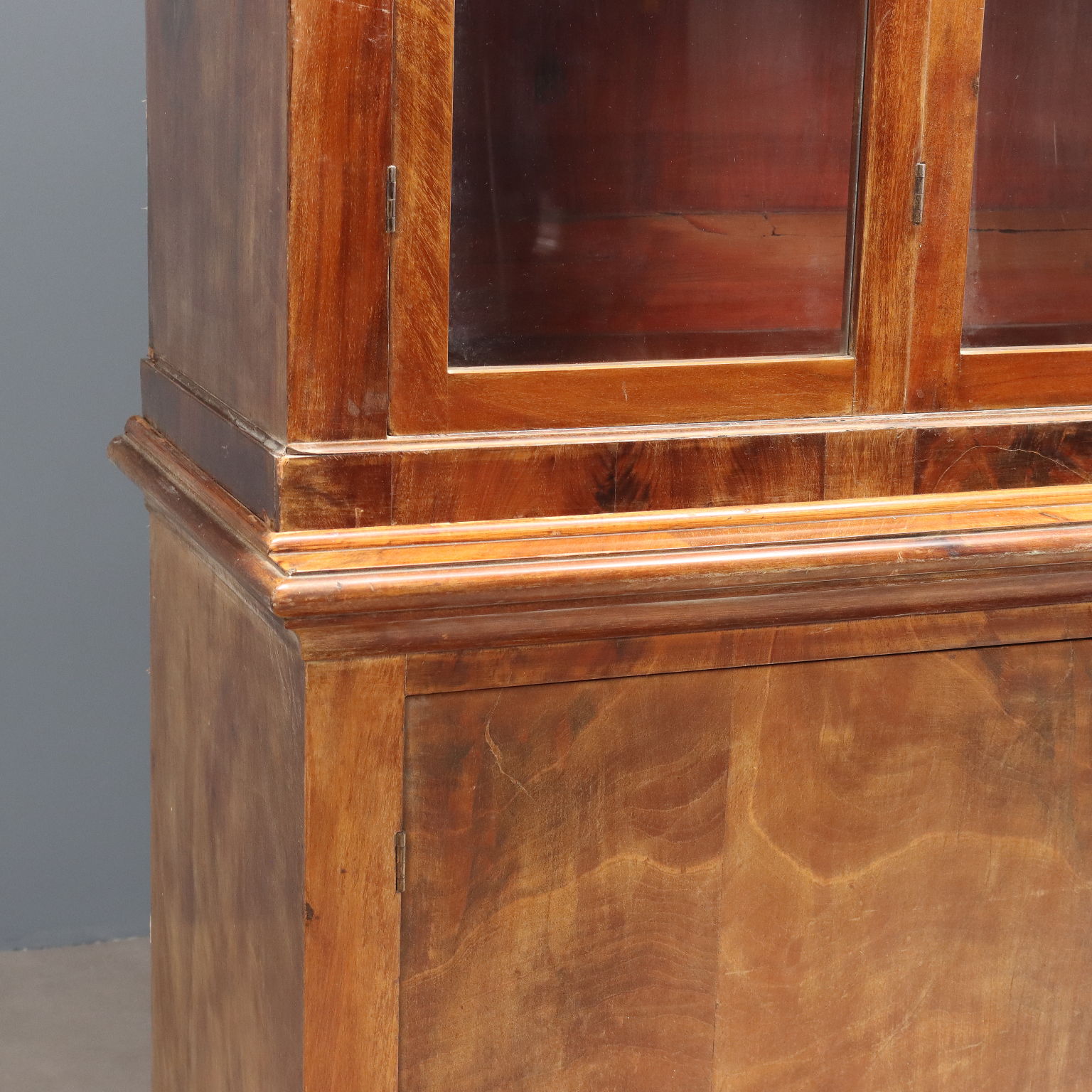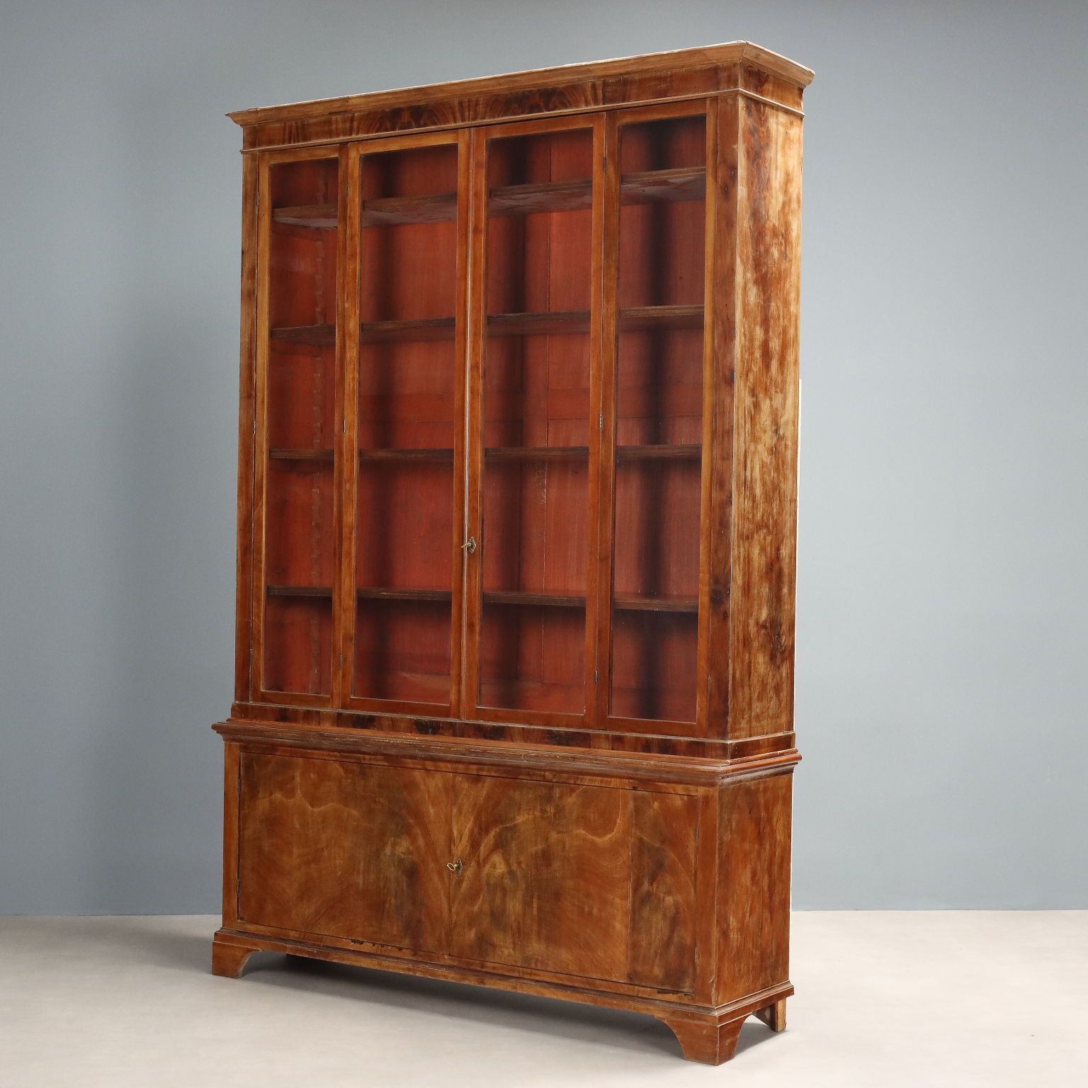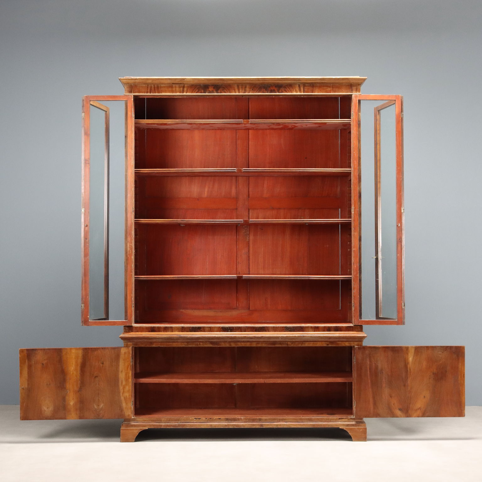 Libreria in mogano e piuma di mogano. Base a due ante e piedi a mensola, alzata con quattro ante a vetro apribili a soffietto, ripiani interni regolabili in altezza. Interni in abete. Toscana, seconda metà XIX Secolo.