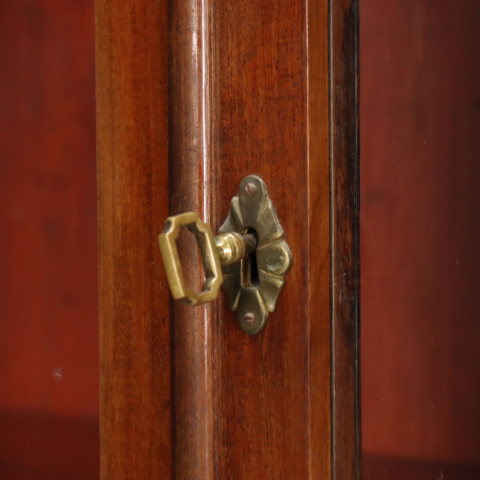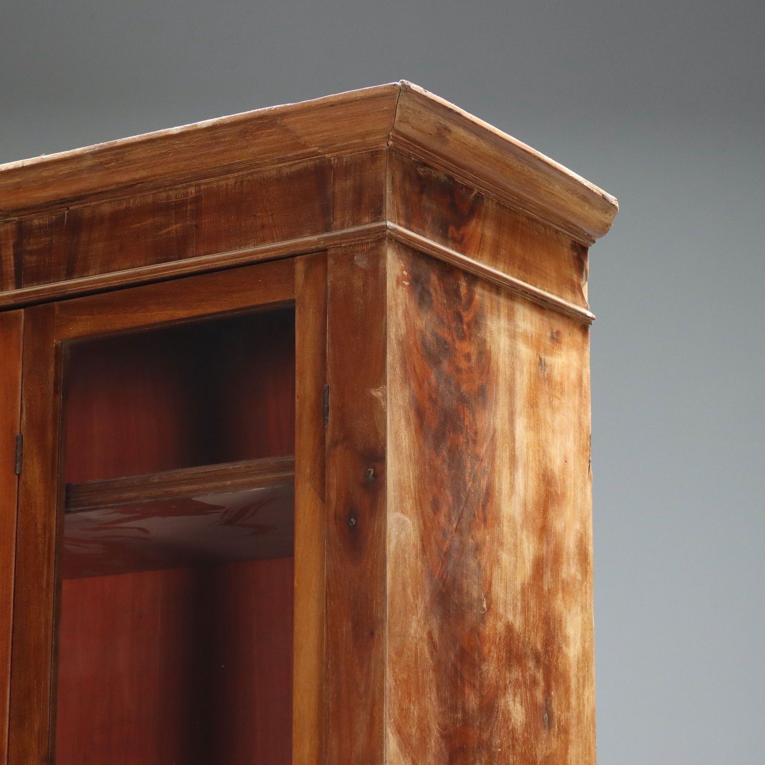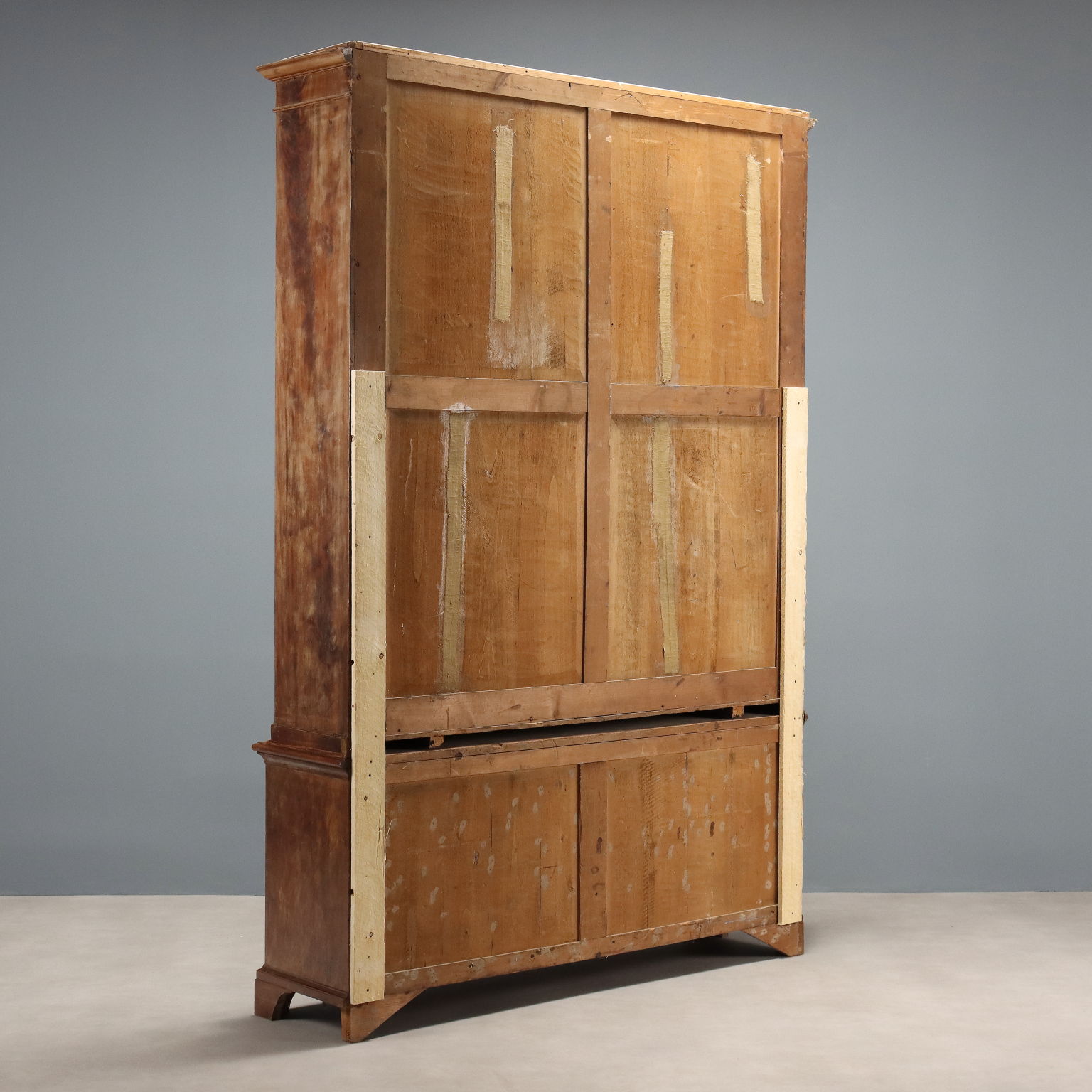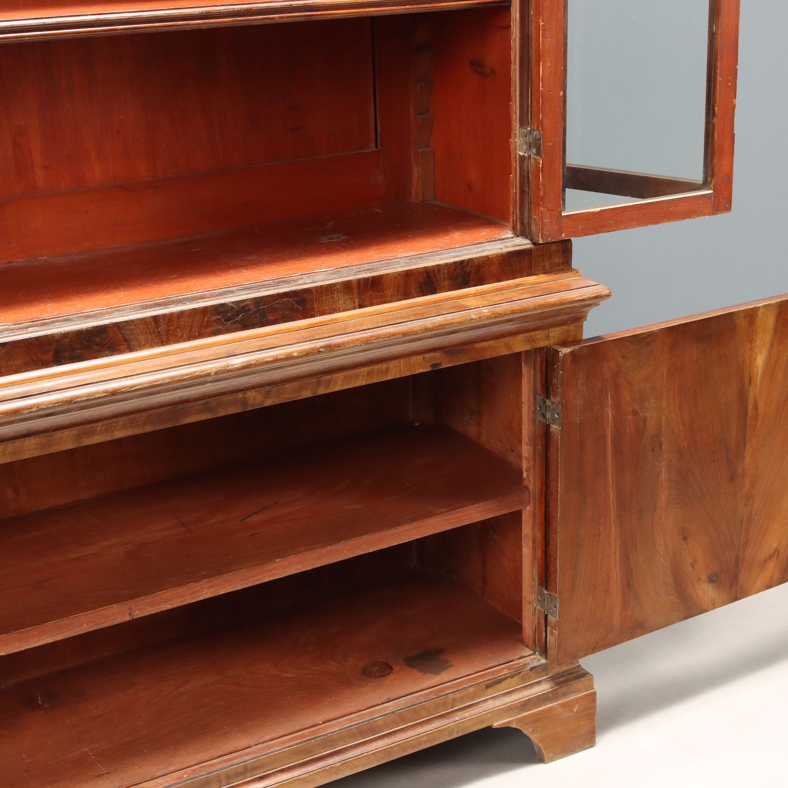 Libreria in mogano e piuma di mogano. Base a due ante e piedi a mensola, alzata con quattro ante a vetro apribili a soffietto, ripiani interni regolabili in altezza. Interni in abete. Toscana, seconda metà XIX Secolo.