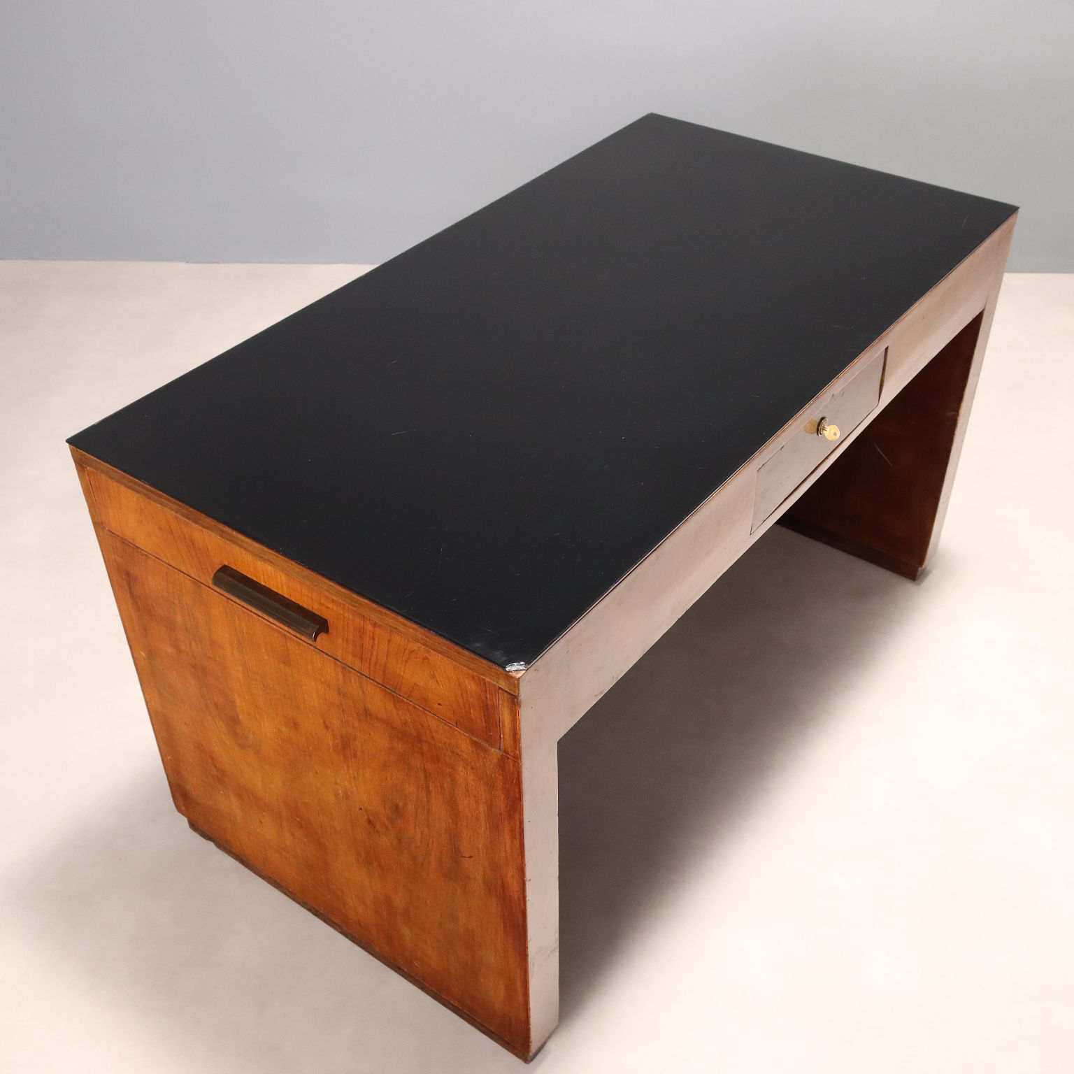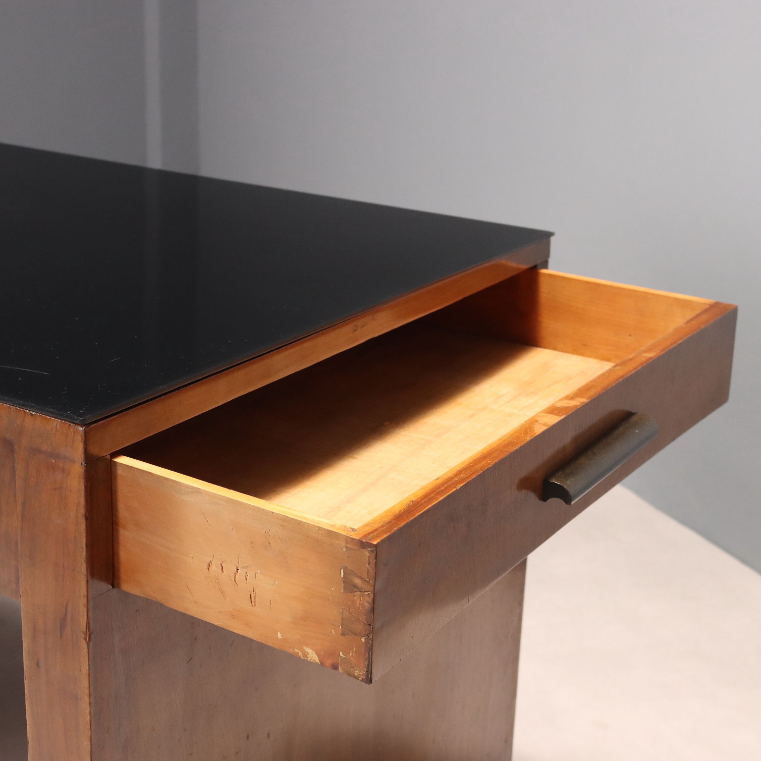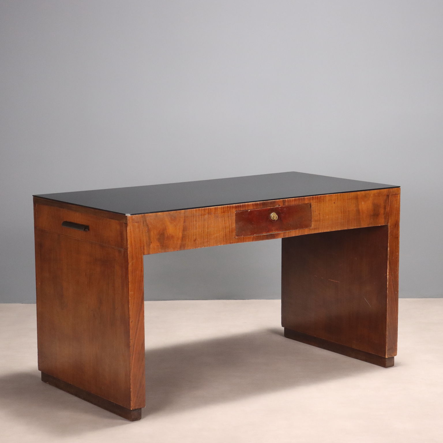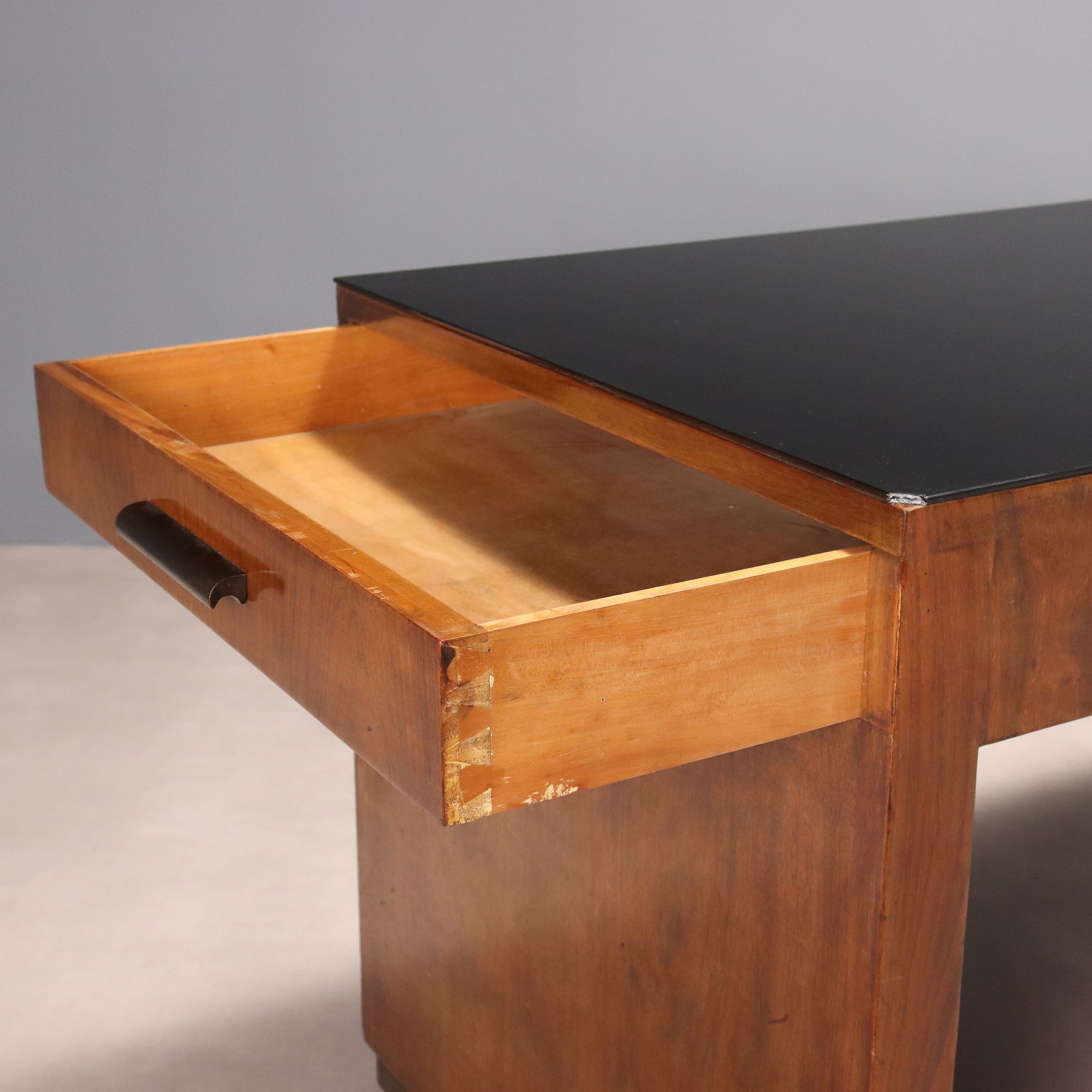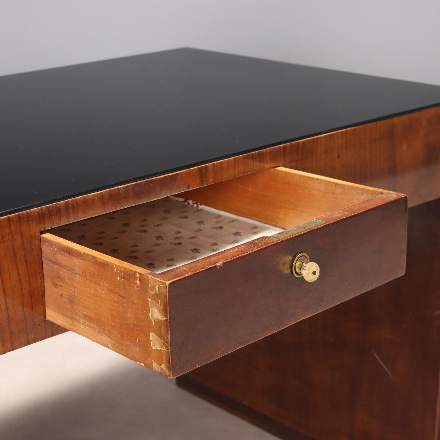Elegante tavolo scrivania di manifattura italiana del XX secolo in legno con impiallacciatura in noce, cassetti laterali e centrali, piano in vetro retro trattato nero. In buone condizioni generali, presenta una seccatura sul piano come visibile in foto.