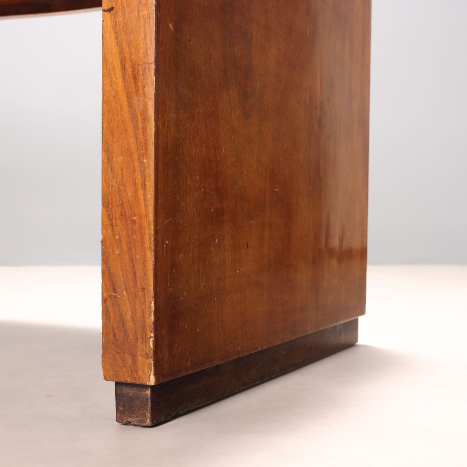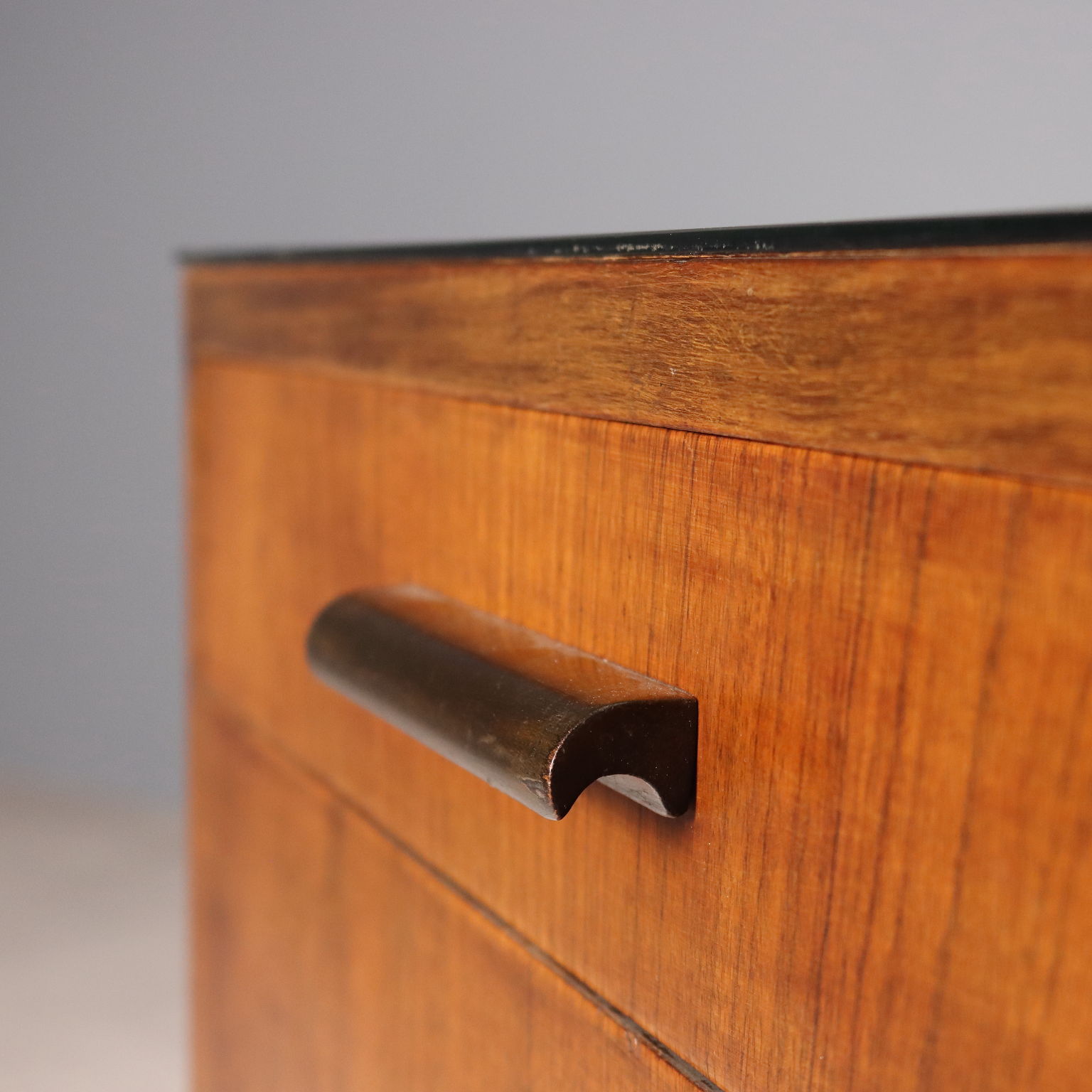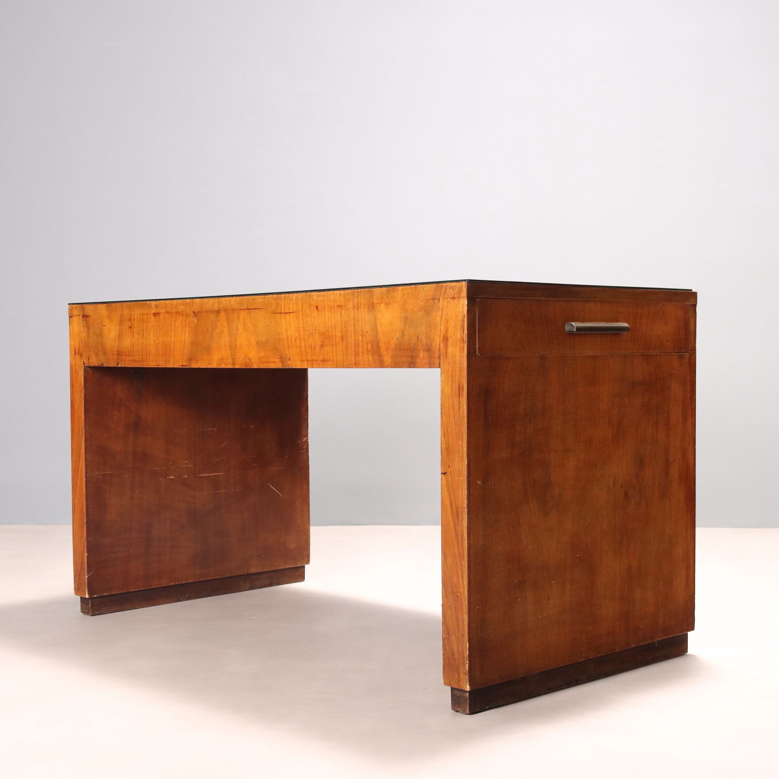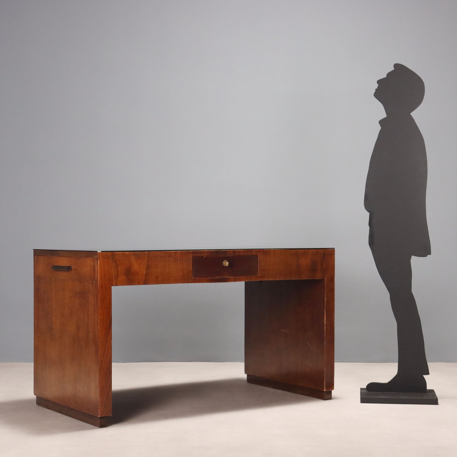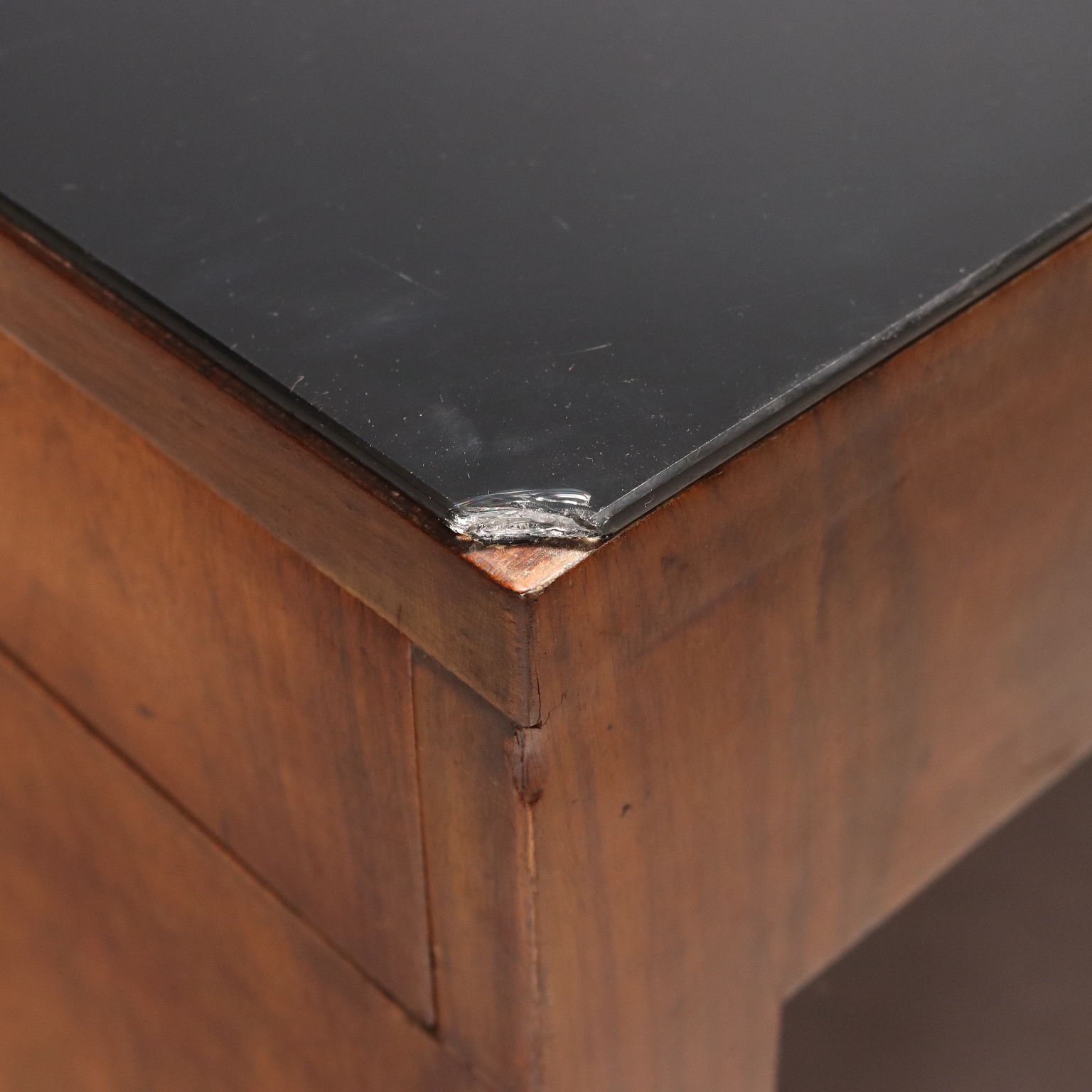 Elegante tavolo scrivania di manifattura italiana del XX secolo in legno con impiallacciatura in noce, cassetti laterali e centrali, piano in vetro retro trattato nero. In buone condizioni generali, presenta una seccatura sul piano come visibile in foto.