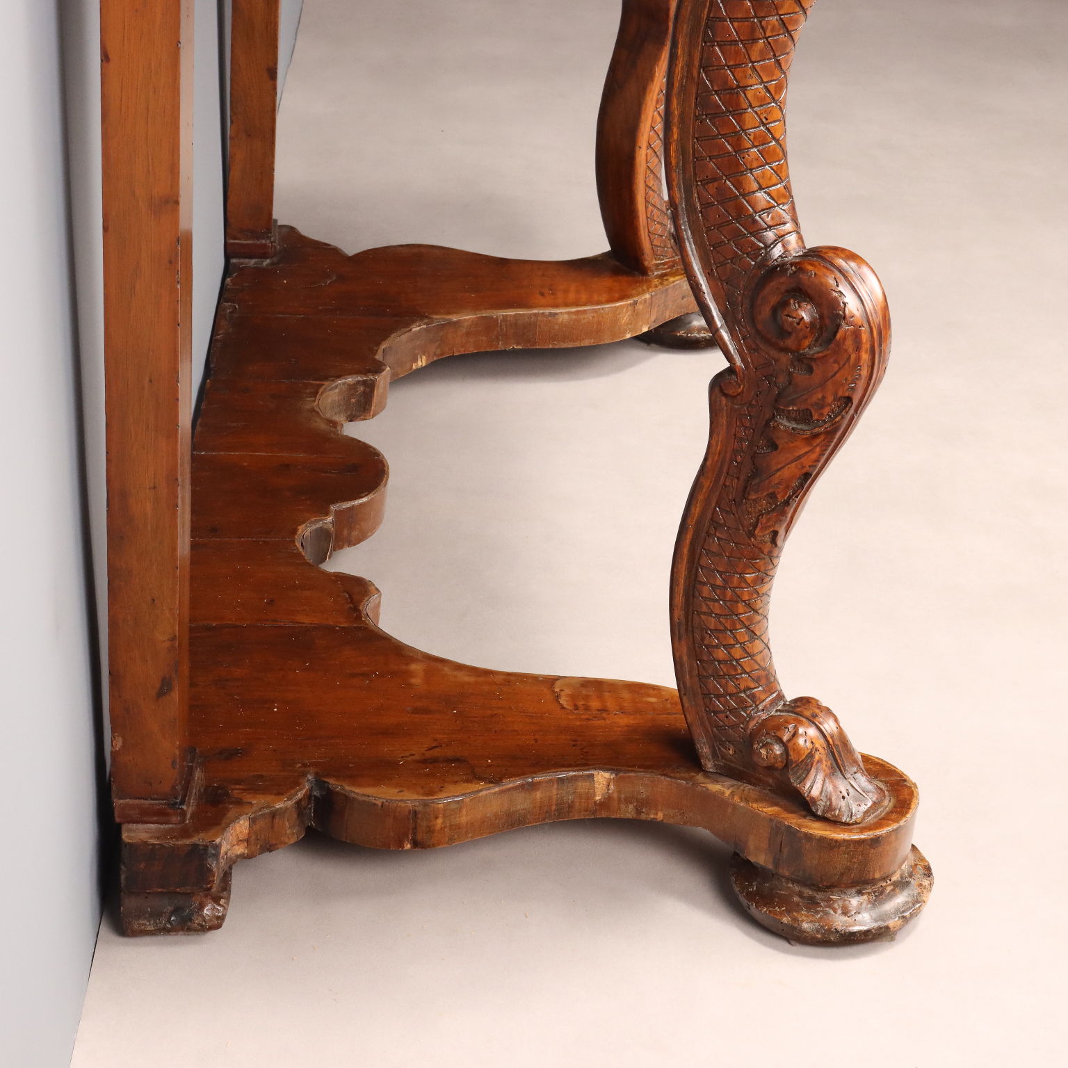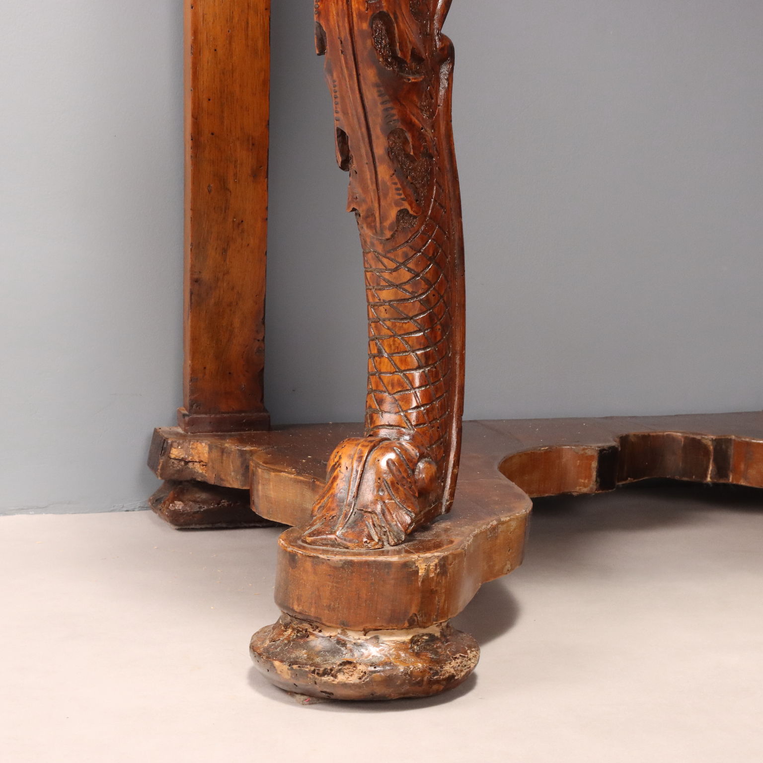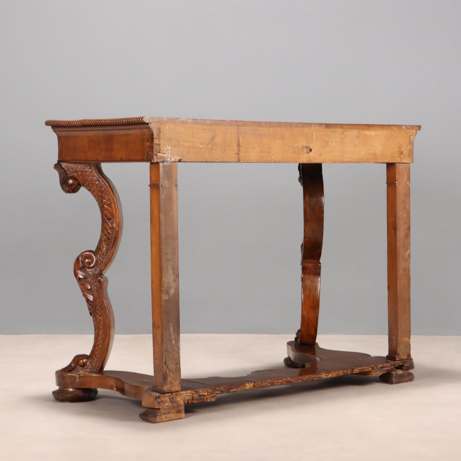 Consolle Luigi Filippo in noce, piano realizzato in asse unica con lavorazione a bacellatura sul bordo. Cassetto nella fascia sotto piano, gambe mosse intagliate a motivi fogliacei poggianti su base sagomata. Genova, inizio XVIII Secolo.